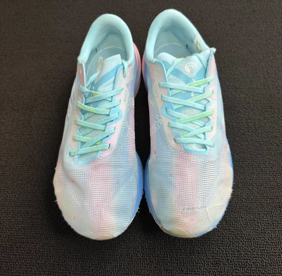 终于种草了这双飞影PB5.0!实物真的比图片好看太多,“勿忘我”这个配色真的绝绝子,清新又高级,实物比图片好看系列!✨ 说下脚感,我是正常脚型,39码上脚非常合适,绞综鞋面的包裹性没得说,透气又跟脚,完全没有压脚背的感觉。碳板带来的推进感真的很明显,减震回弹也很顶,平时节奏跑或者长距离训练都能稳稳hold住。这双鞋真的是始于颜值,陷于性能,迫不及待想穿着它去刷个PB了!🔥👟球鞋名称: