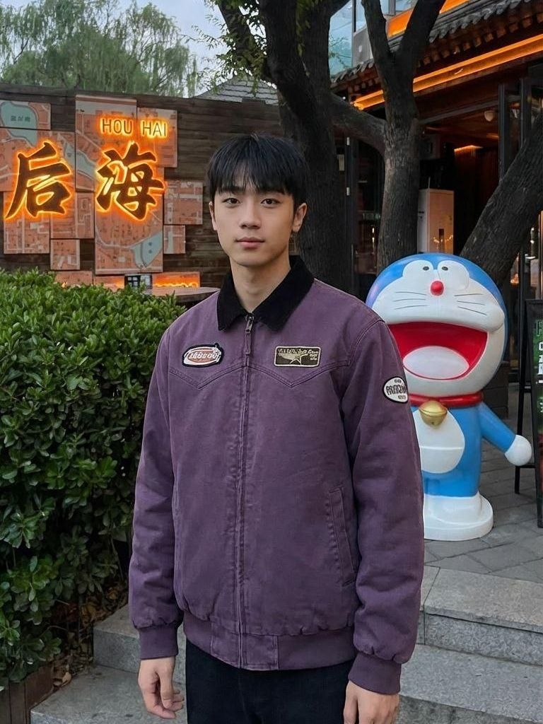 藏在后海的复古感 这件紫色工装外套也太出片了!🍇 带有微旧感的莫兰迪紫,配上黑色灯芯绒领口,充满了浓厚的复古工业气息。 胸前的复古贴标是点睛之笔,让整件衣服看起来更有故事感 。 没有试过紫色的兄弟们,非要推荐!