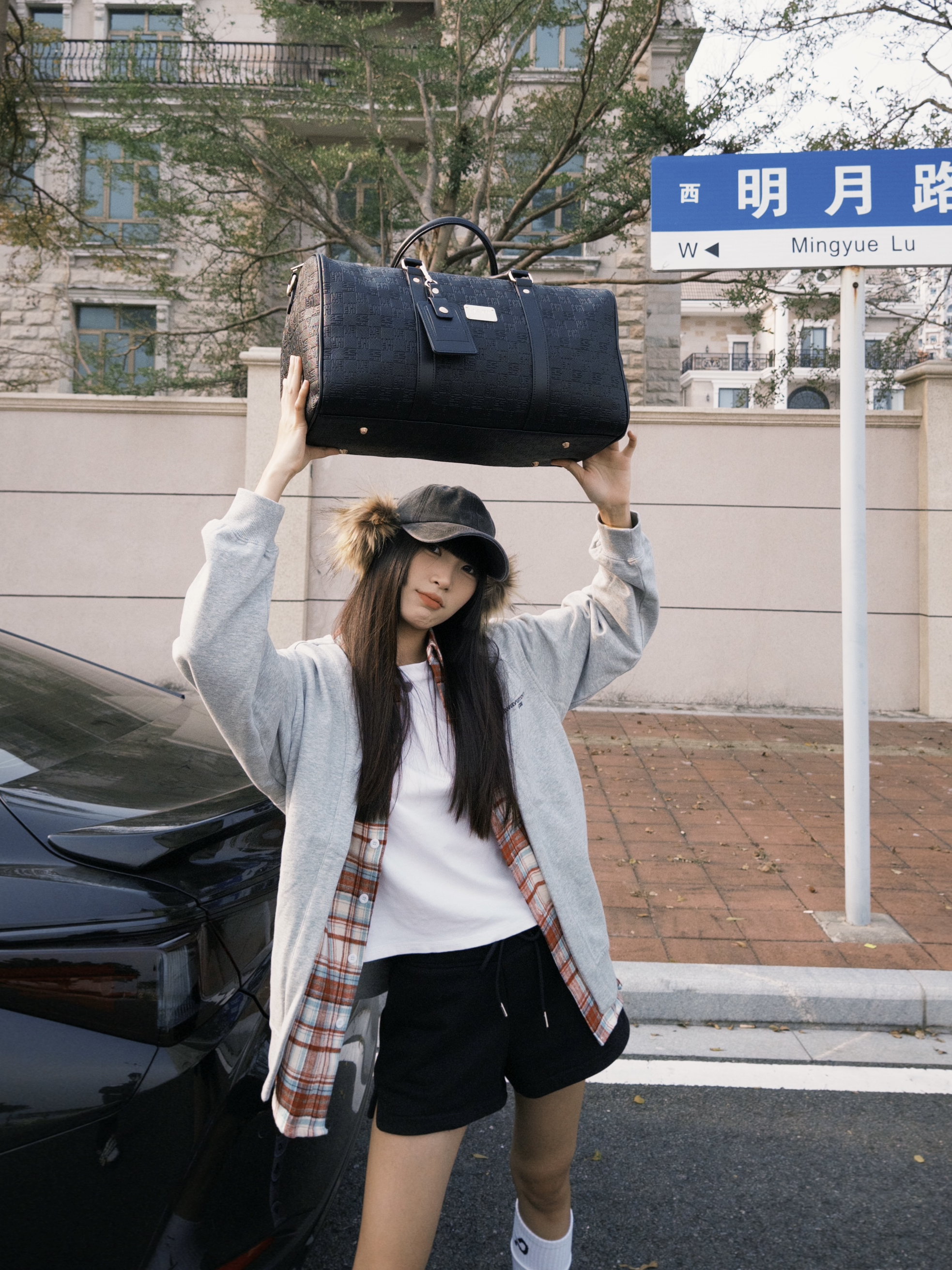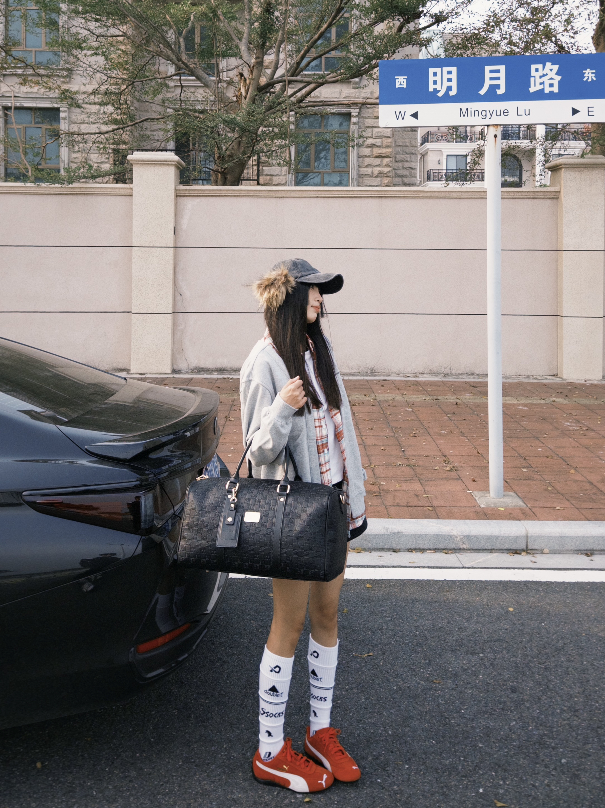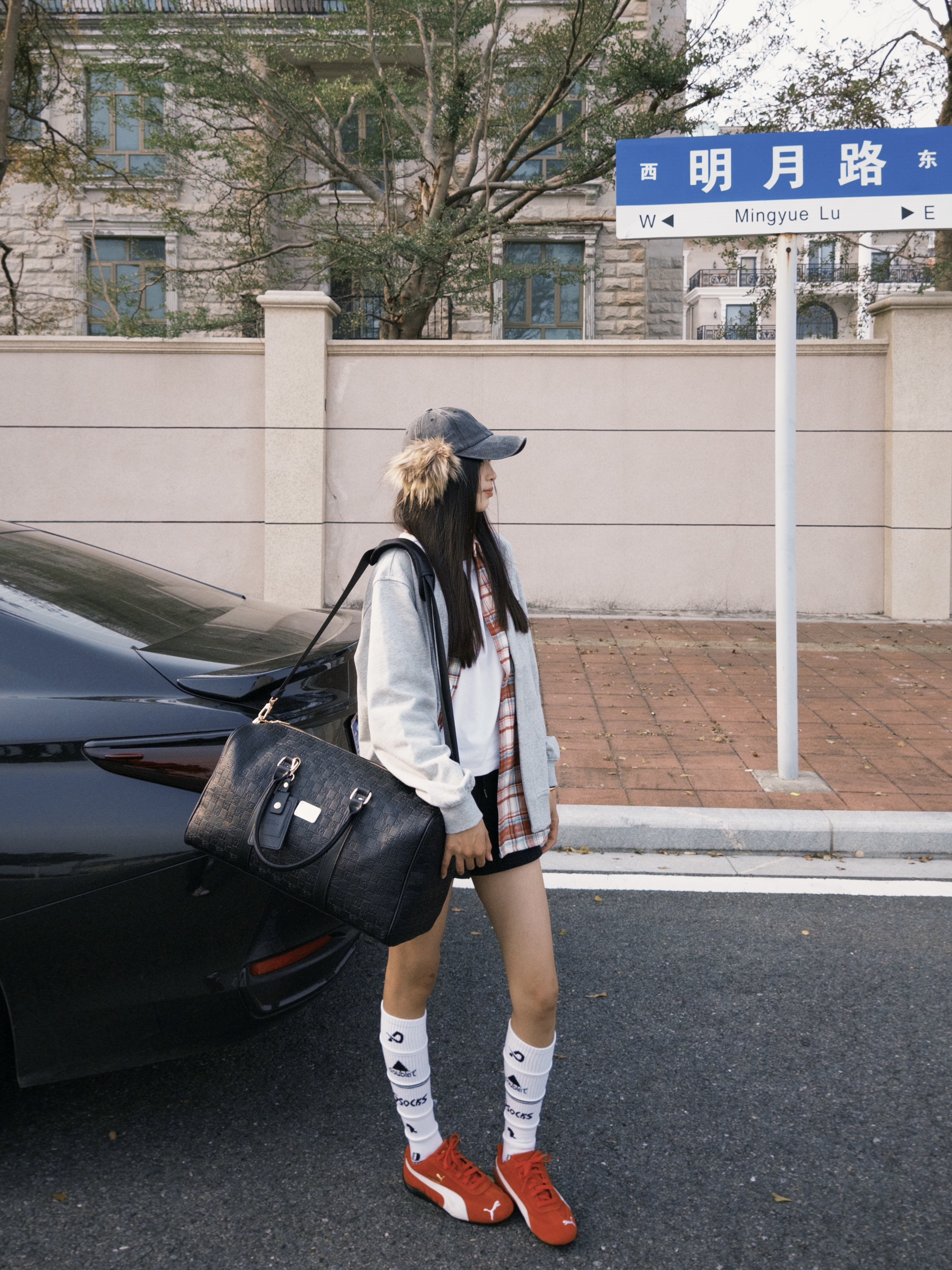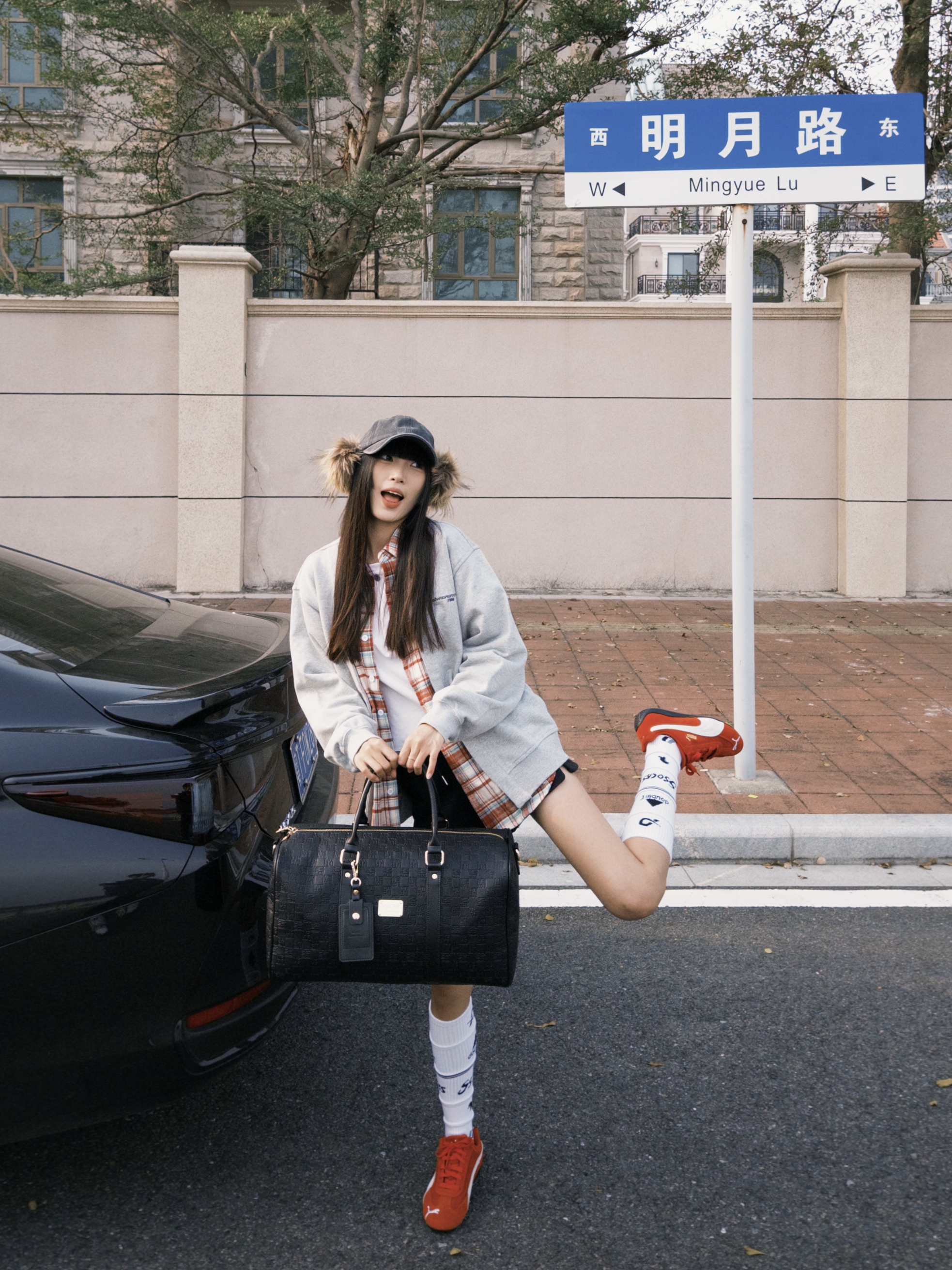 和爱车在街头合影 今日ootd带点红色元素 很亮眼 有新春的氛围感啦!