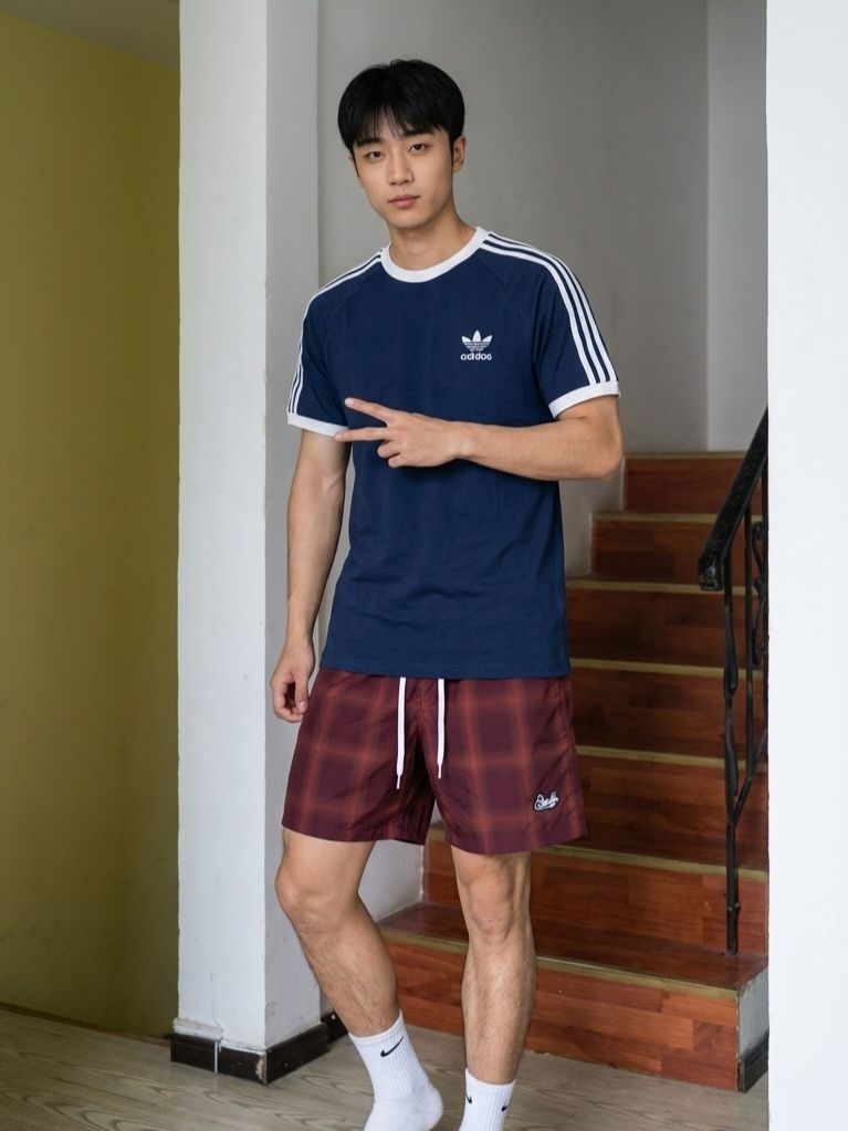 夏日运动风穿搭来啦💙藏蓝三叶草短袖经典三条杠 + 白边撞色,复古又清爽,搭配 NBA 联名球裤,少年感直接拉满!再踩一双米色复古板鞋,整体配色干净又协调,不管是运动还是日常出街都超合适,轻松成为人群中的清爽少年