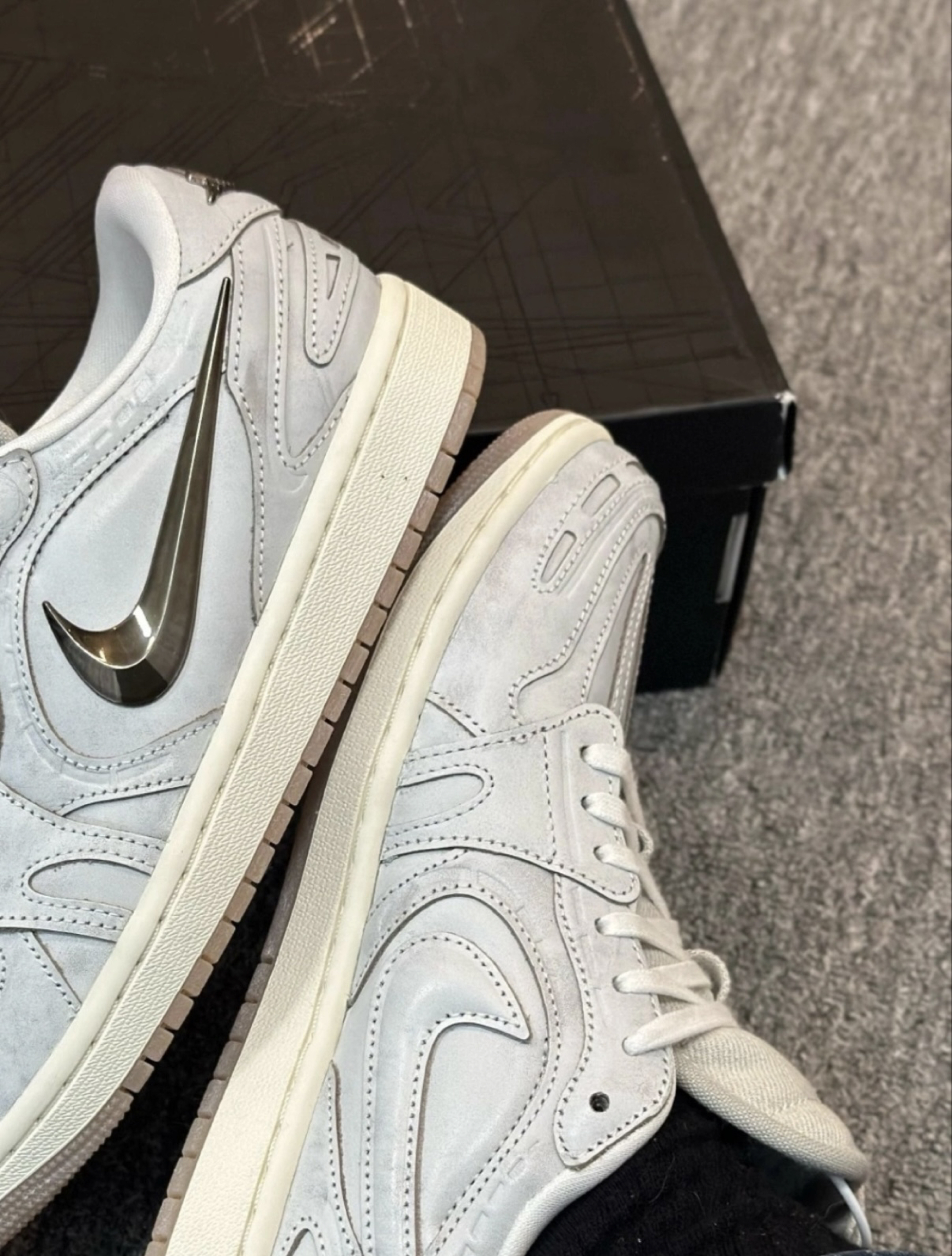 今天穿这双AJ1做旧灰去公司✨,挤早高峰地铁+走15分钟路,到工位脚居然没累~搭了条水洗蓝牛仔裤+米白卫衣,邻座小姐姐说我这身“休闲又带点复古工业风😎,鞋超特别!” 鞋身是翻毛皮质感,浅灰调带做旧感,金属标细节很戳我~不过灰色确实不耐脏,沾了水渍要及时擦🧼。脚感舒服,鞋垫软,走久不磨脚,就是鞋底略硬。 对了,尺码正码,瘦脚宽脚都能穿~你们穿AJ1最爱搭什么风格?来评论区聊聊呀👇 甜妹女孩的宝...