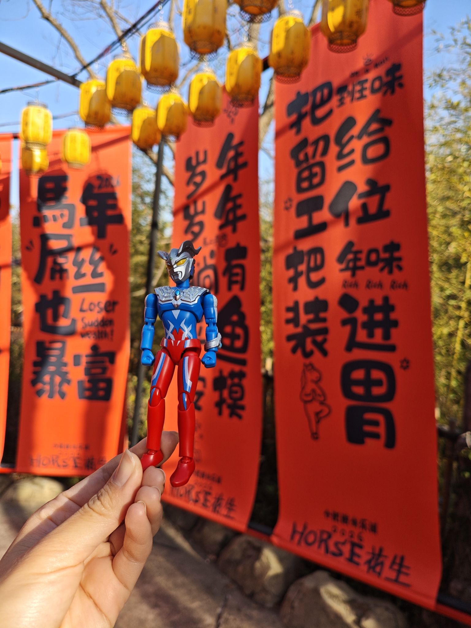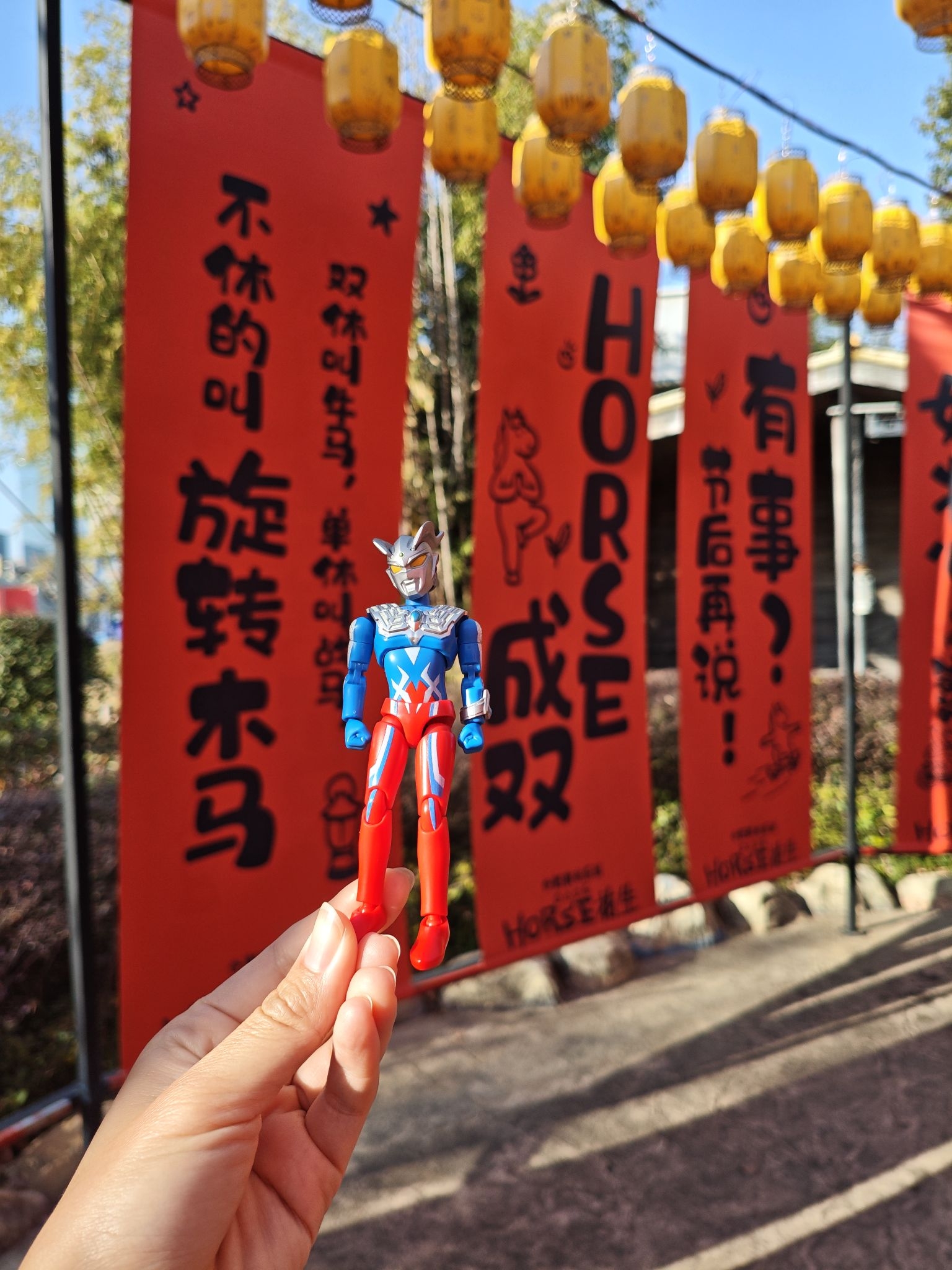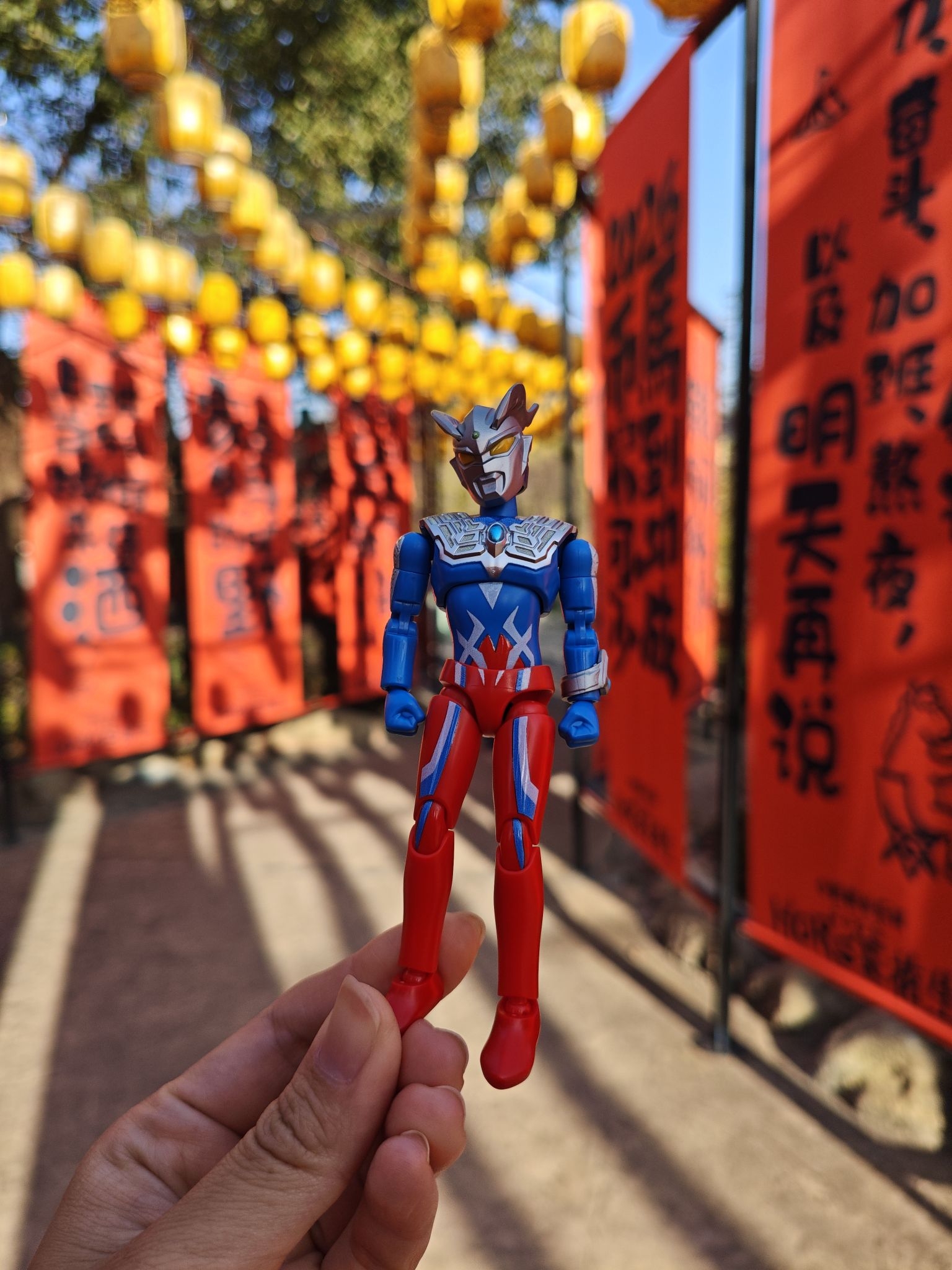 谁懂啊!这张赛罗返图真的封神。 带赛少来祈福地打卡,红蓝战衣在红幅黄灯笼的衬托下,质感直接拉满。 赛罗不仅是手办,更是刻在DNA里的勇气符号。