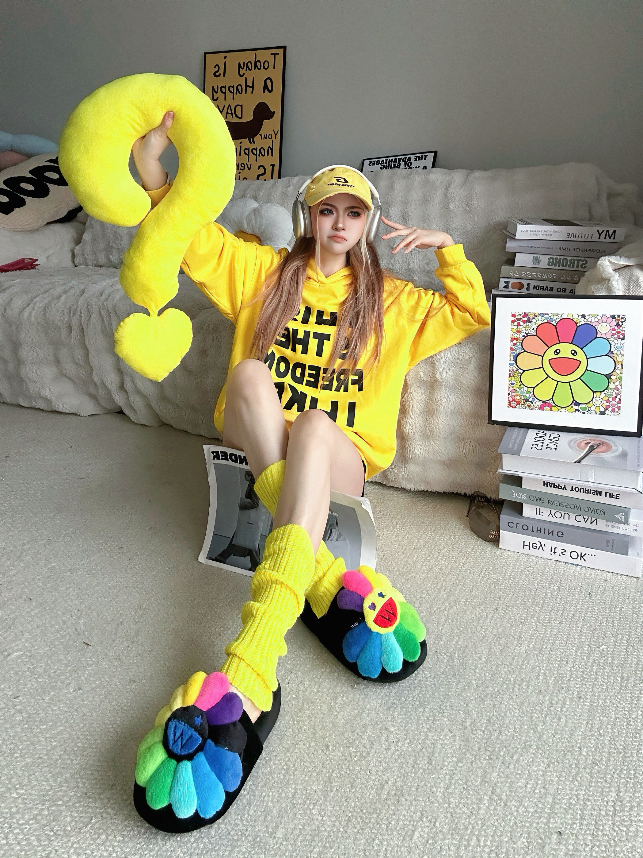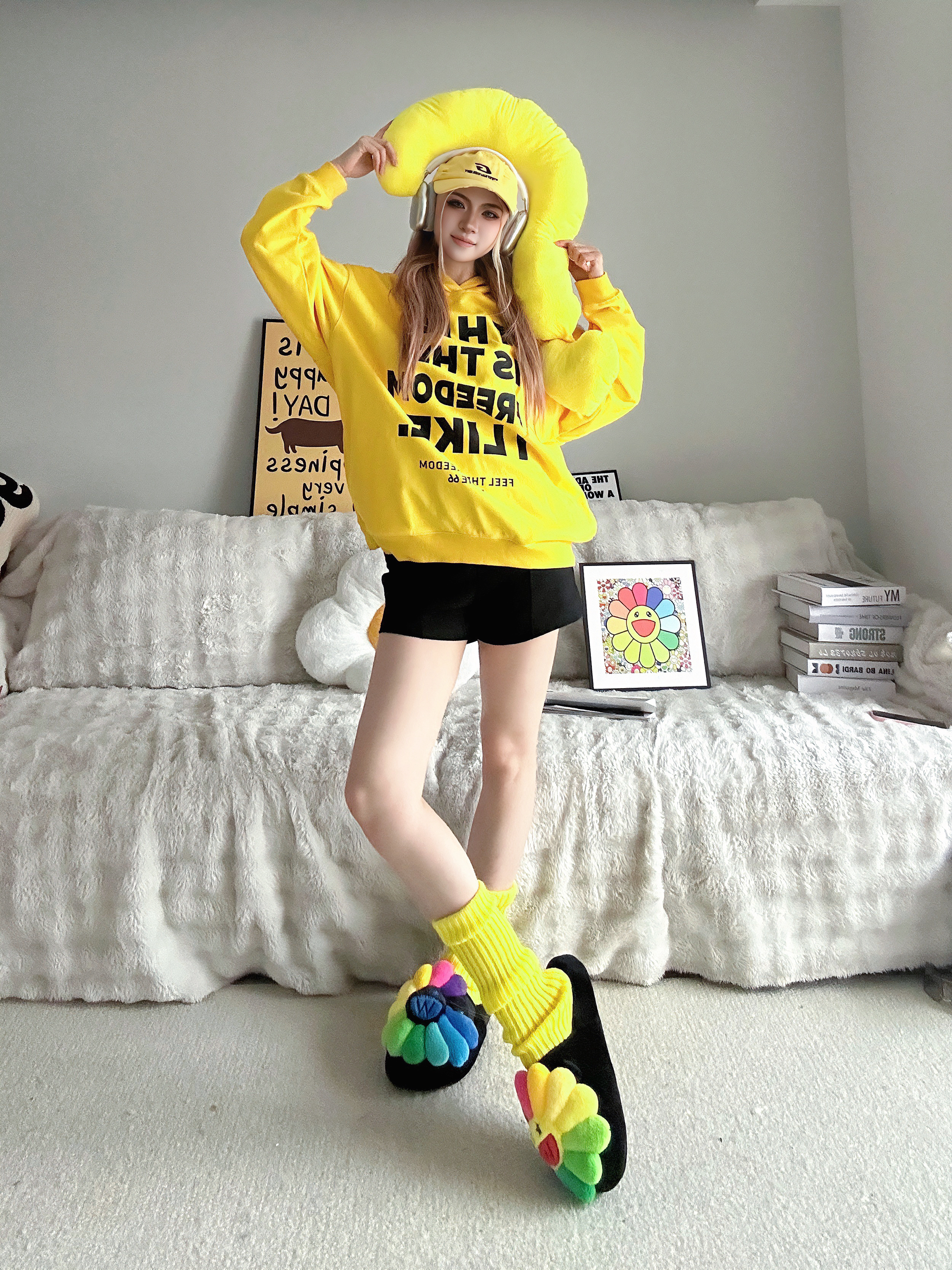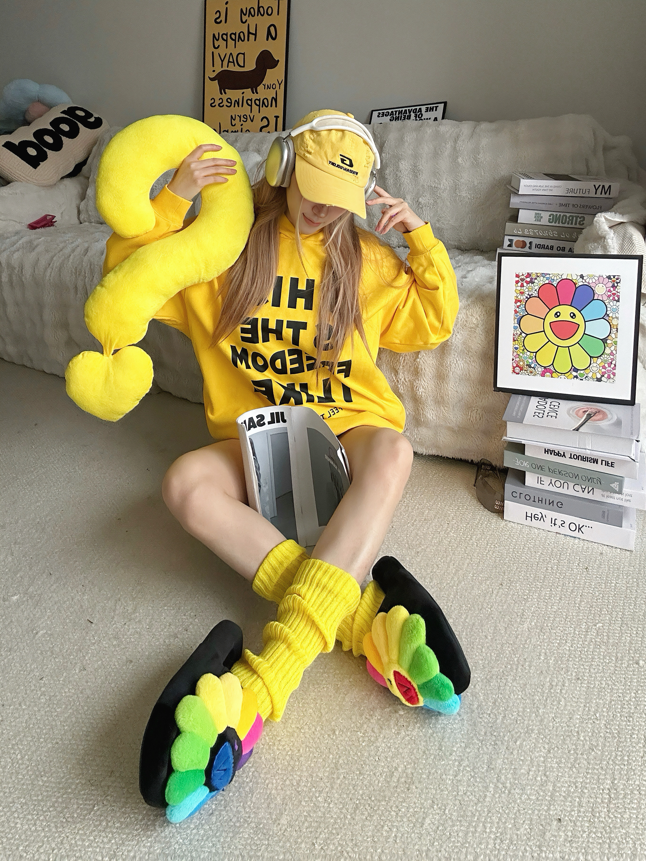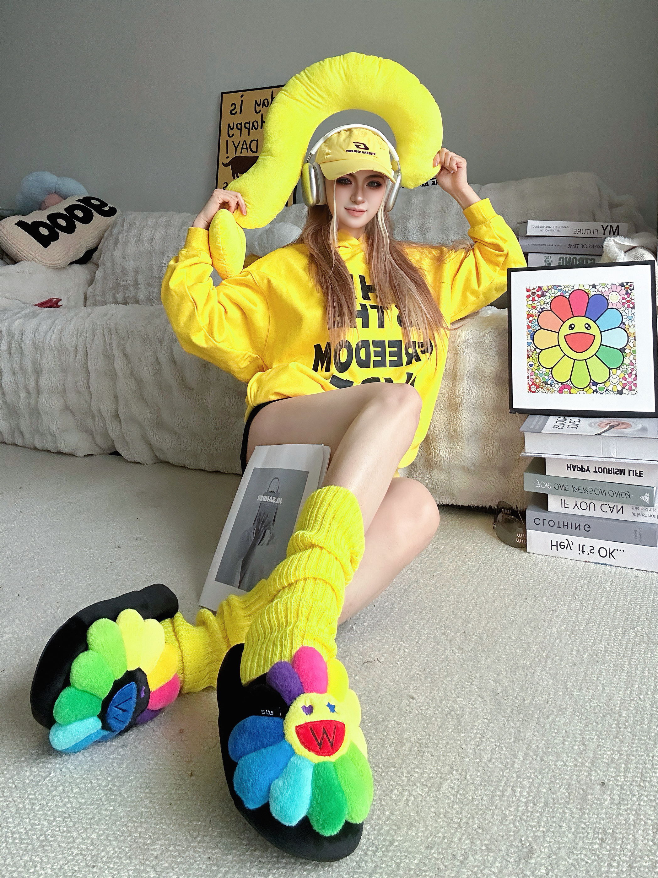 宅家也要多巴胺 今天又是黄色控💛 ⬇️ 黄色卫衣➕黑字母的组合 吸睛亮眼👀 搭配黑色短裤休闲舒适✅ 选择一些黄色系的单品,腿套和鸭舌帽 作为整套穿搭的点缀 最特别的当然是脚上的Wayward Souls联名UUU的拖鞋 厚底舒适,毛茸茸的质感 鞋头大大的经典太阳花🌻造型 真的超可爱又有设计感 ⬇️ 整套穿搭都以黄色系💛单品为主 搭配一些小面积的彩色点缀 还可以用一些简约的小配饰 出片就是这么简单...