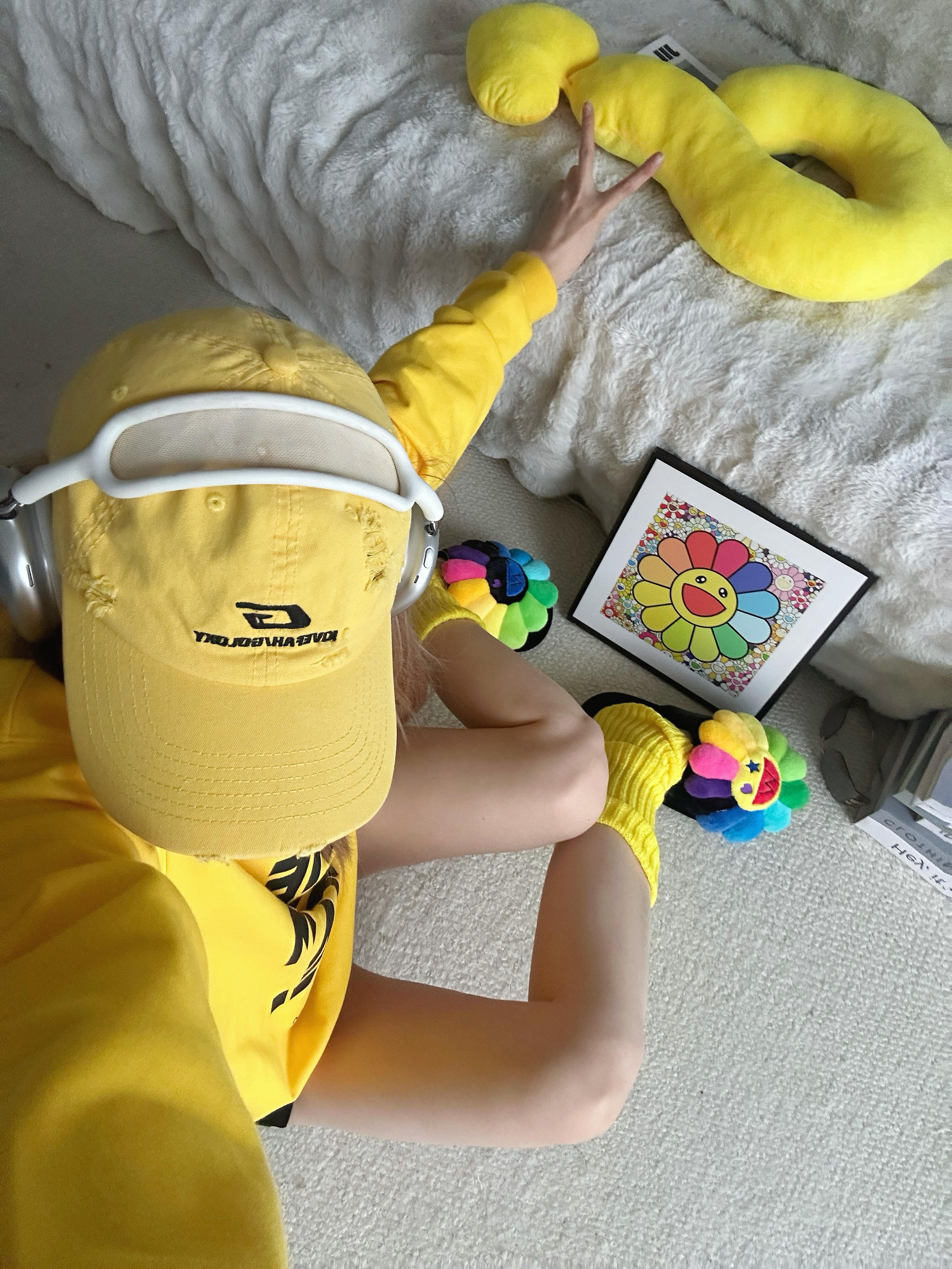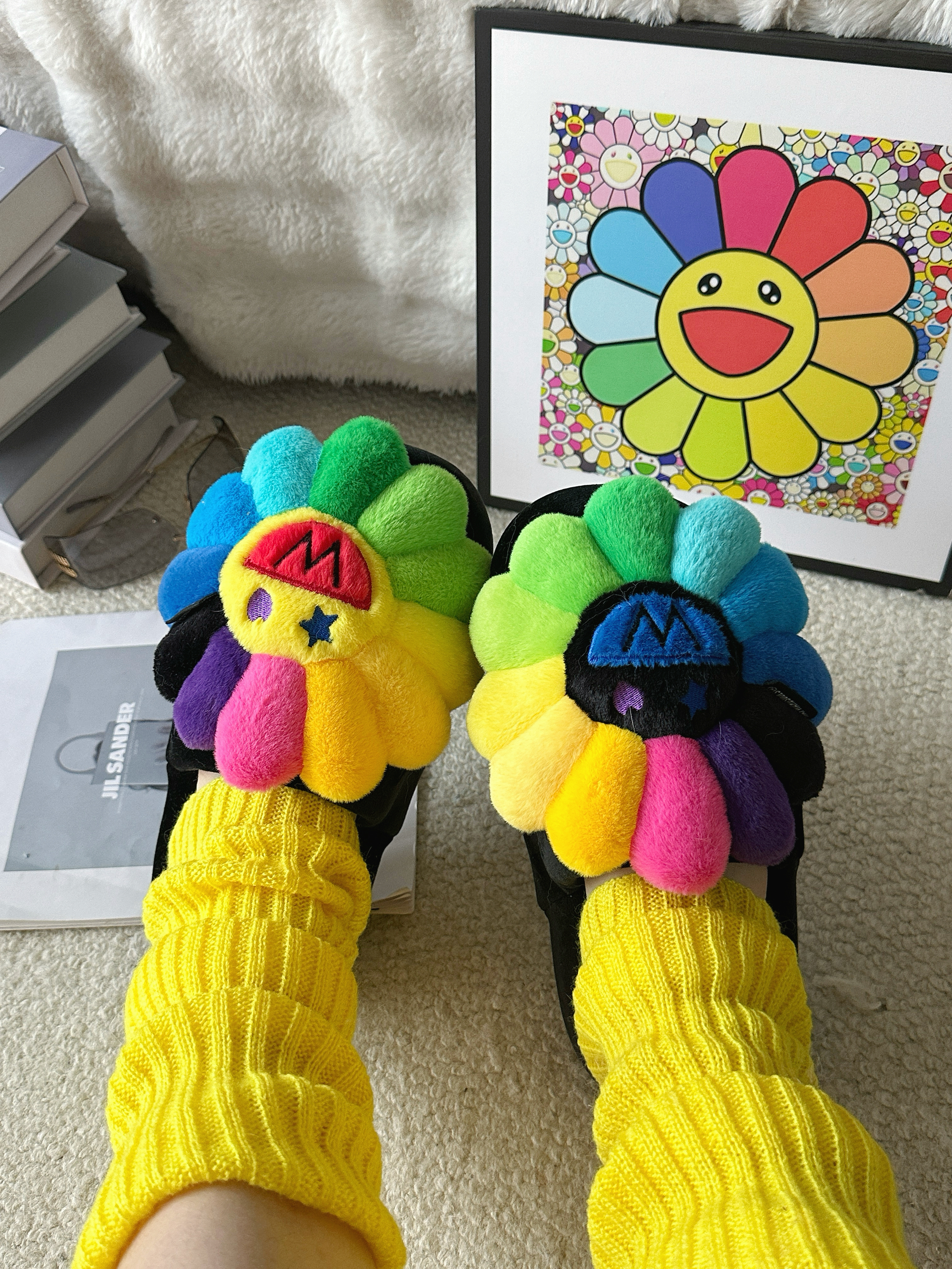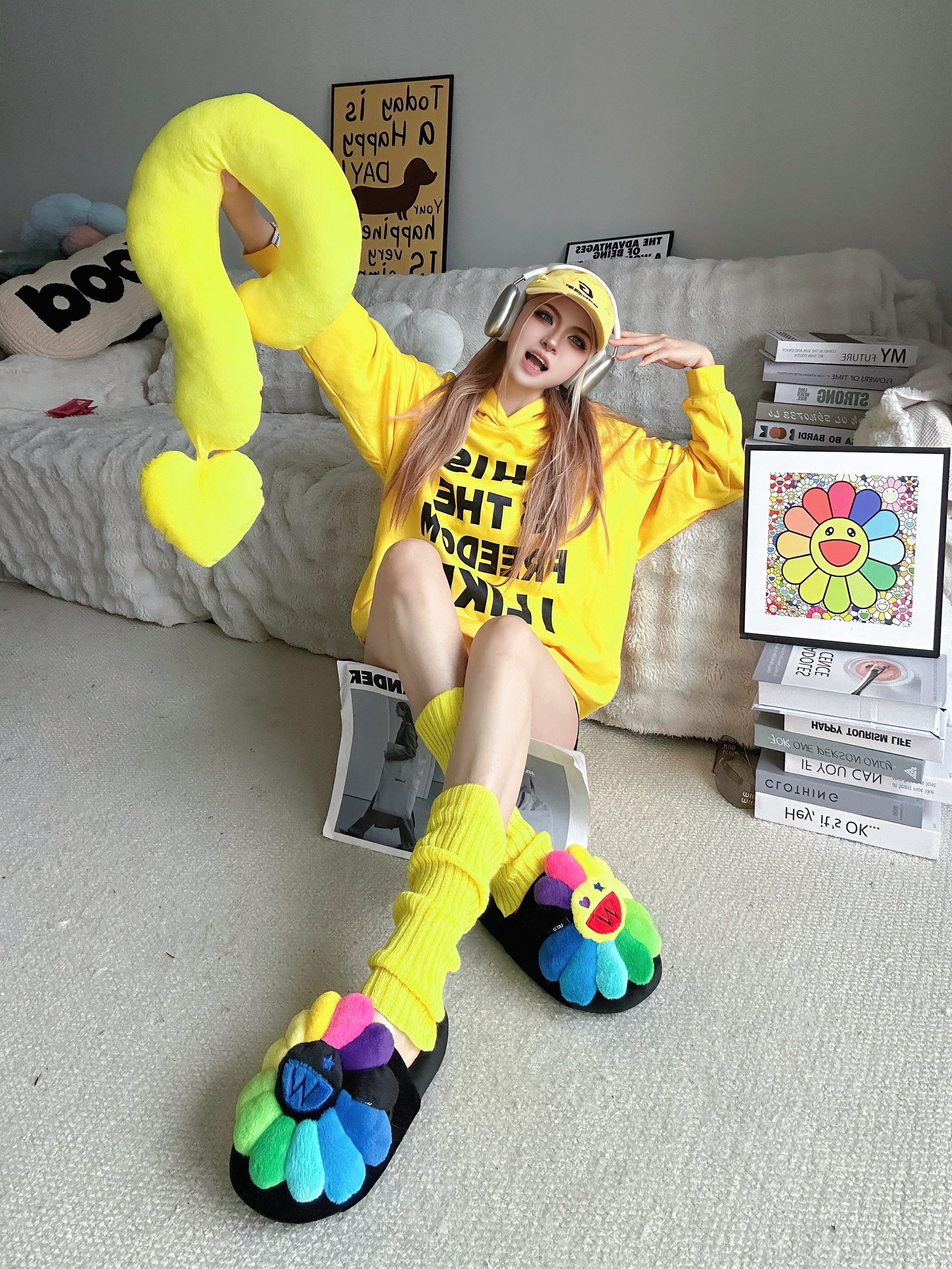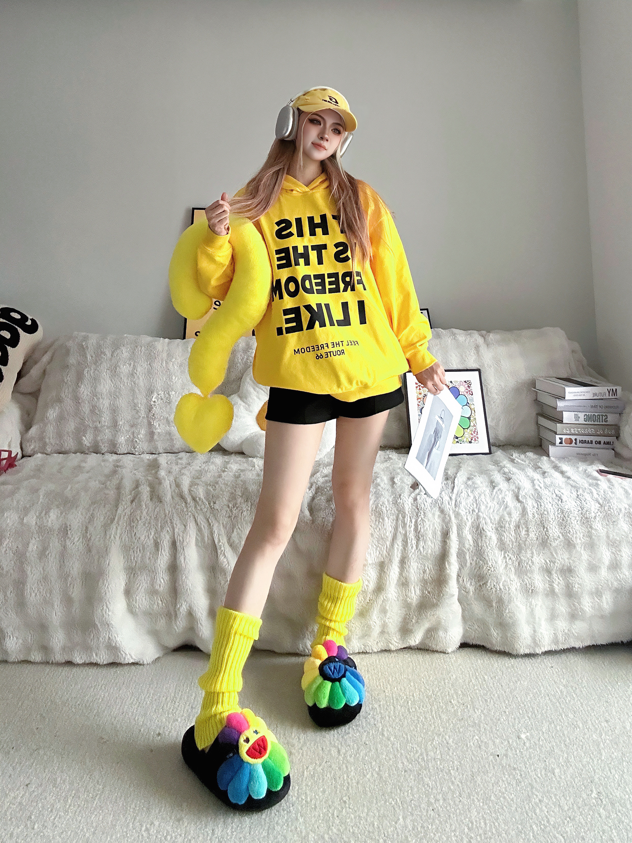 宅家也要多巴胺 今天又是黄色控💛 ⬇️ 黄色卫衣➕黑字母的组合 吸睛亮眼👀 搭配黑色短裤休闲舒适✅ 选择一些黄色系的单品,腿套和鸭舌帽 作为整套穿搭的点缀 最特别的当然是脚上的Wayward Souls联名UUU的拖鞋 厚底舒适,毛茸茸的质感 鞋头大大的经典太阳花🌻造型 真的超可爱又有设计感 ⬇️ 整套穿搭都以黄色系💛单品为主 搭配一些小面积的彩色点缀 还可以用一些简约的小配饰 出片就是这么简单...