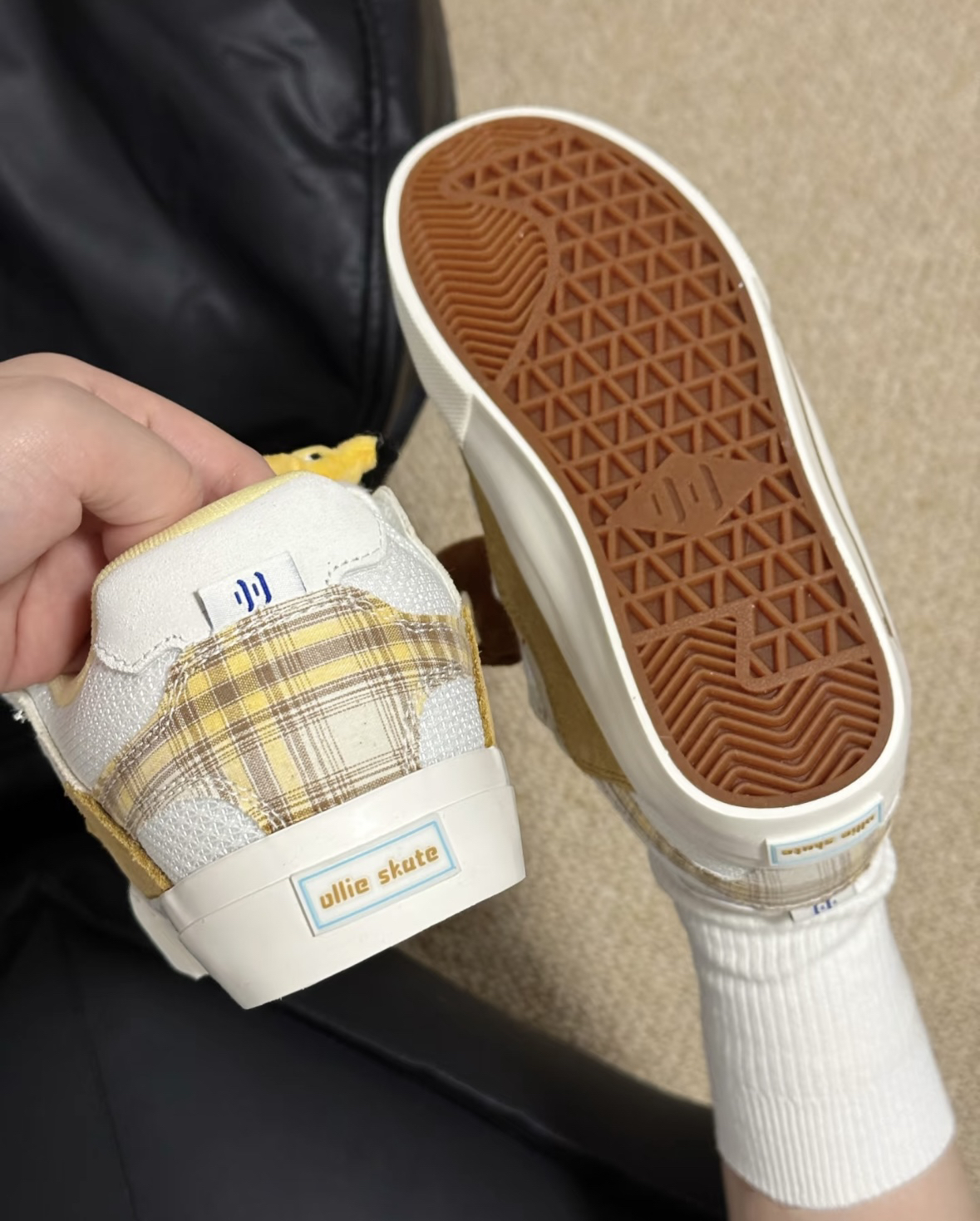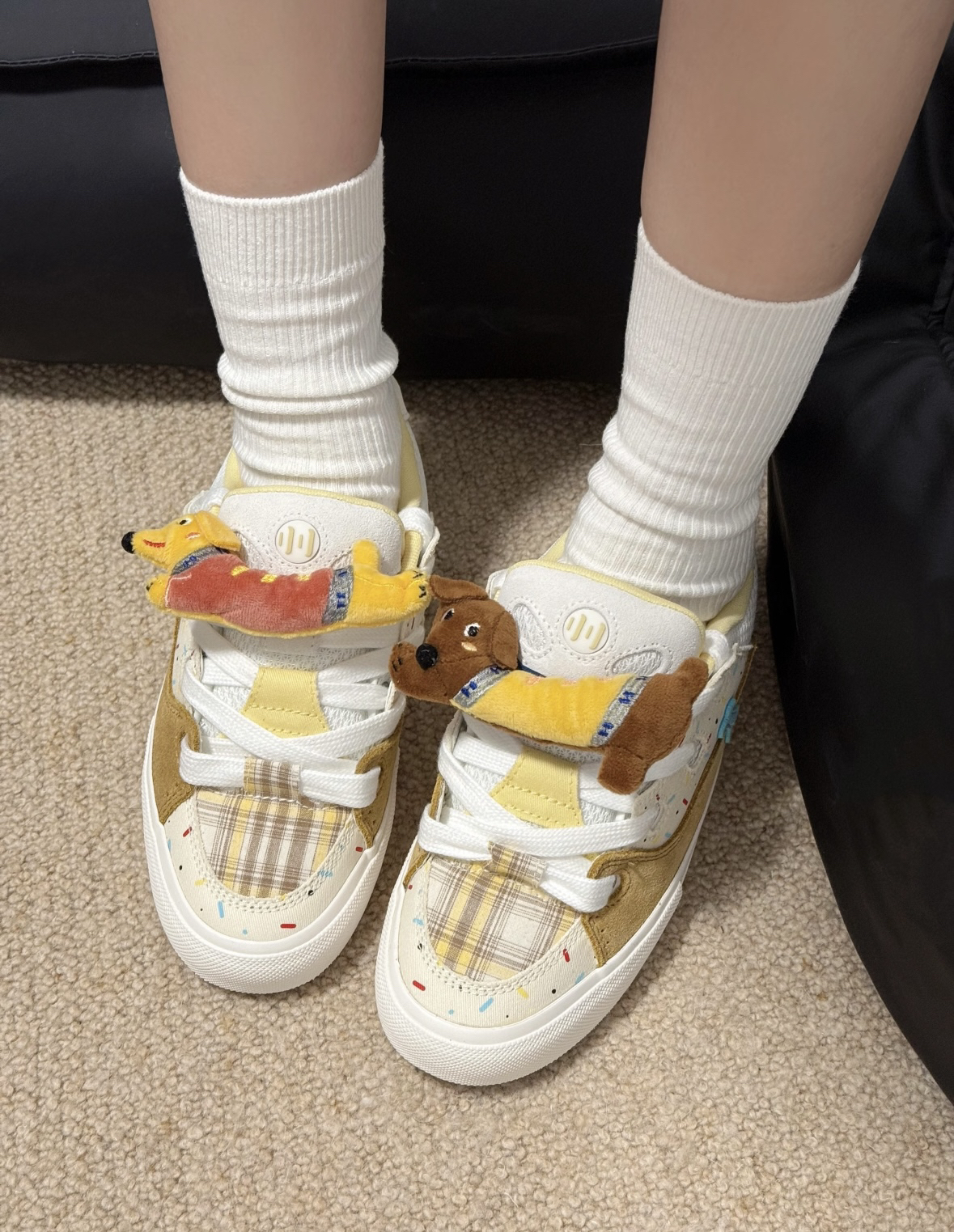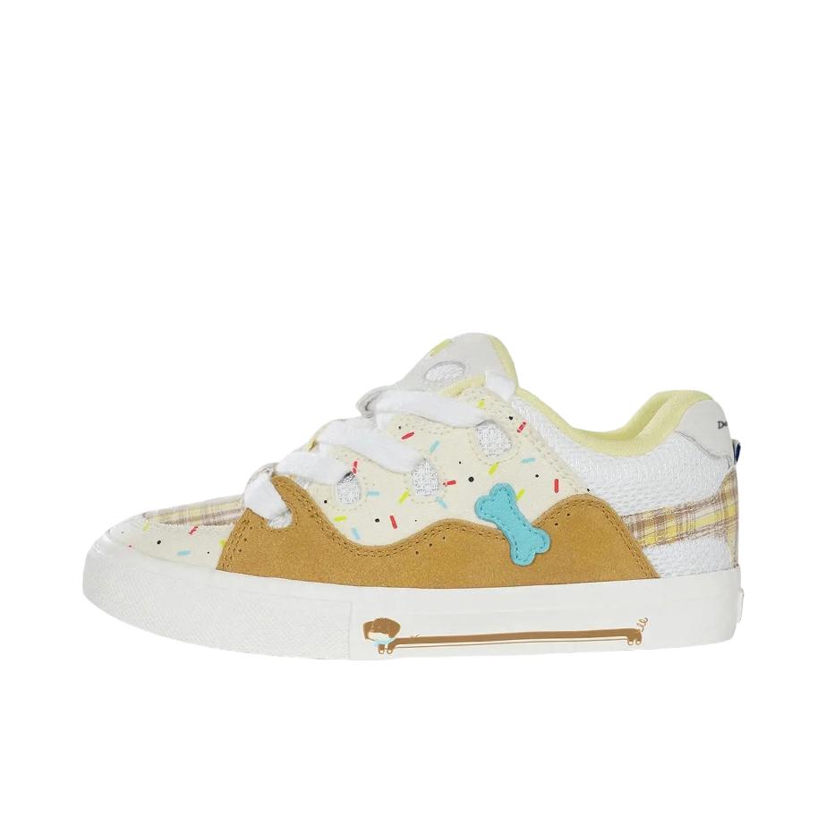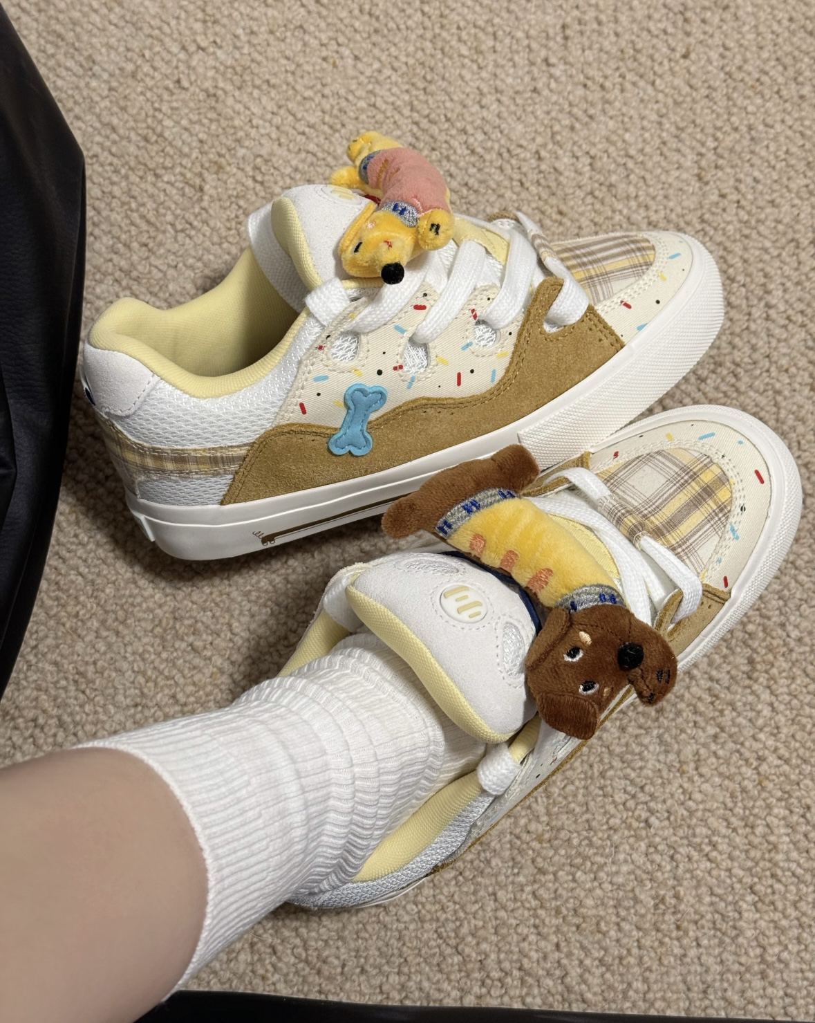 1. 颜值暴击 这双鞋真的可爱到犯规!奶白+浅棕的配色像一块曲奇饼干,鞋面上的彩色糖针和小骨头装饰,再加上鞋舌上的立体毛绒小狗挂件,一整个童趣拉满,甜妹和复古风都能轻松拿捏,出门回头率超高。 2. 舒适度拉满 鞋面是网布+麂皮拼接,透气又柔软,鞋底软弹有支撑,日常逛街、上学通勤久走也不累脚,鞋型秀气,不会显得脚笨重,对脚宽的姐妹也很友好。 3. 搭配可塑性强 奶fufu的配色超级百搭,配JK裙...