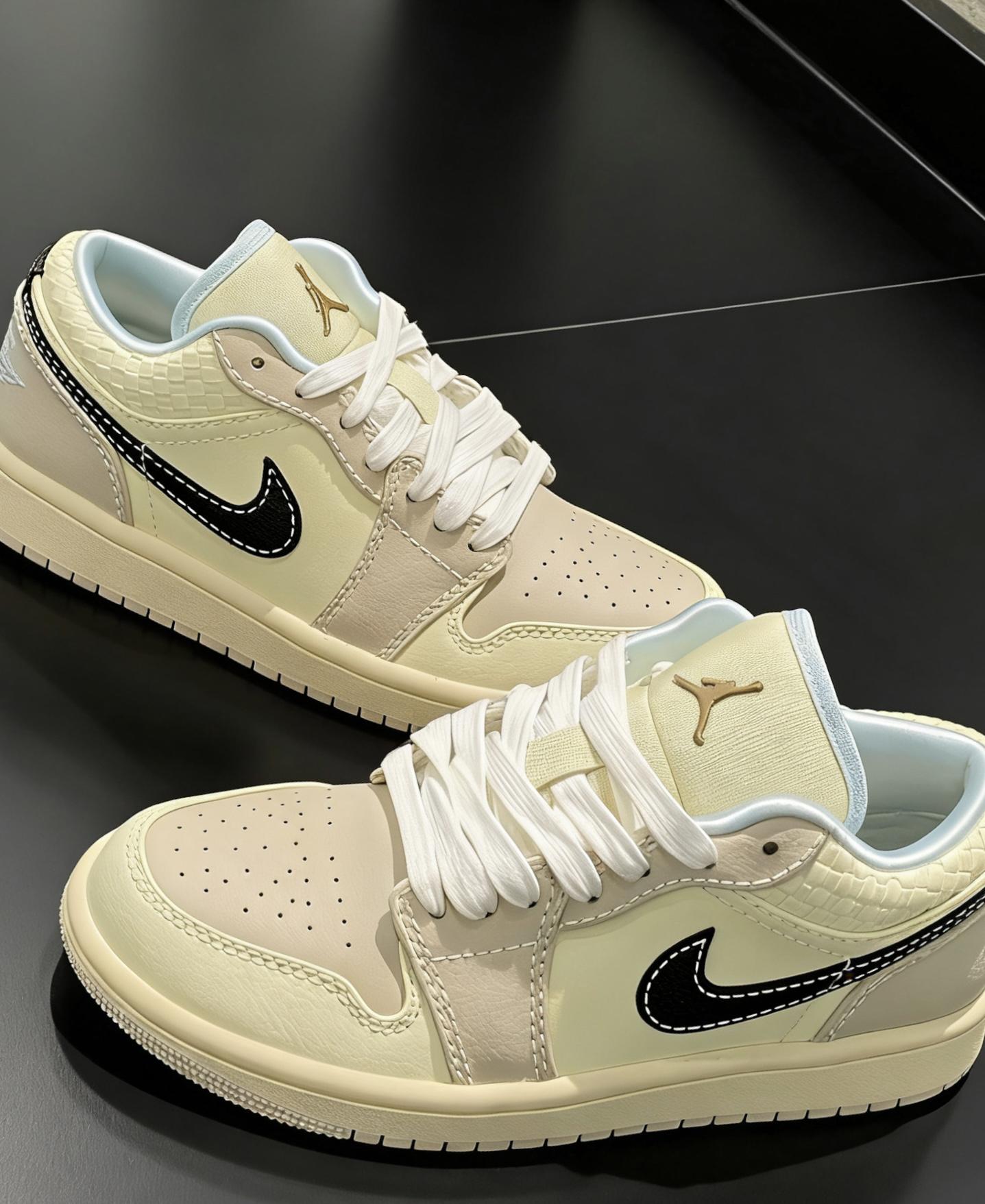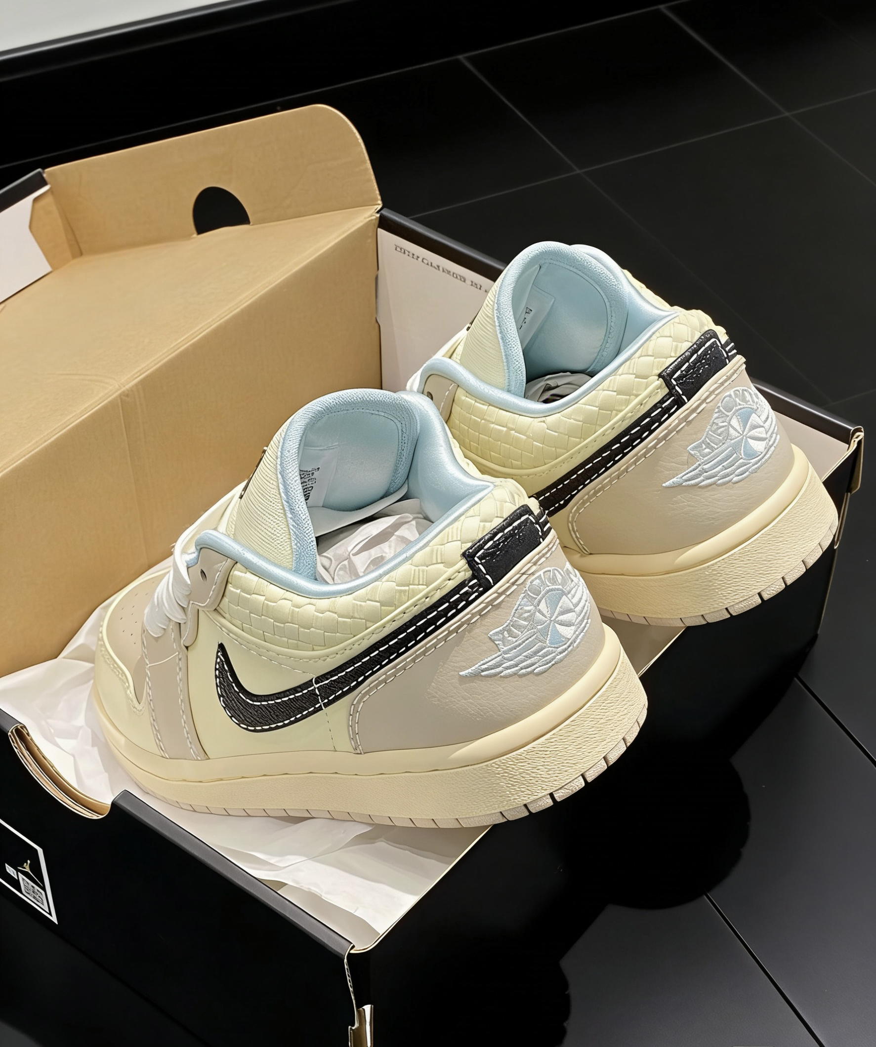 • 奶油复古风:米白+浅蓝的柔和配色,搭配后跟编织纹理,上脚温柔又高级,男女同款适配情侣出街。 • 经典AJ1基因:标志性的飞人Logo、Swoosh勾子与低帮版型,还原OG篮球鞋基因,兼顾复古情怀与日常穿搭属性。 • 质感细节拉满:鞋面采用皮革+编织拼接,触感柔软且层次丰富;黑色Swoosh勾子搭配白色明线,低调彰显身份,辨识度拉满。