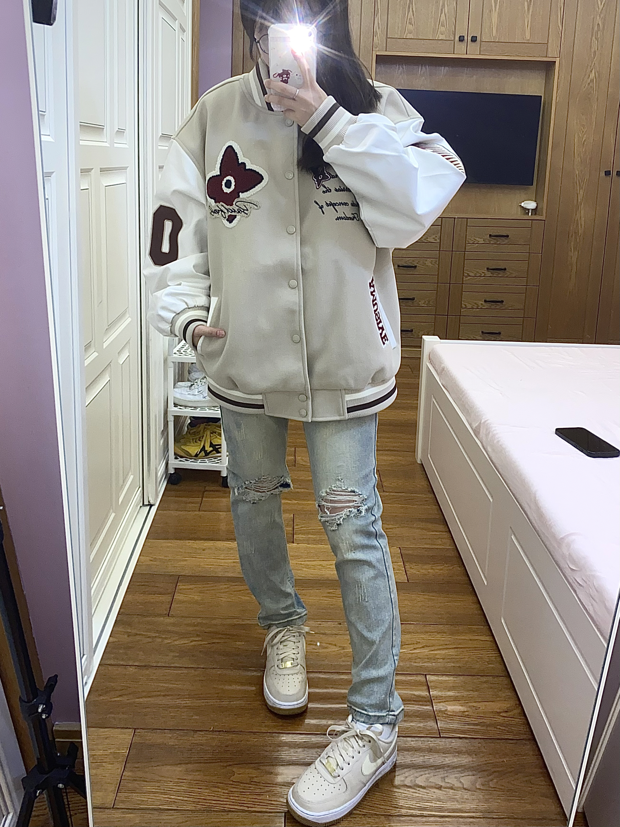 随性慵懒look就靠这套啦 炒鸡奶呼呼的配色,很百搭✌️ 实物也好看!!立领设计酷酷滴~ 版型也挺有活力滴!! 日常或者通勤穿都很合适🚶♀️ 随便搭个板鞋就很好看噜