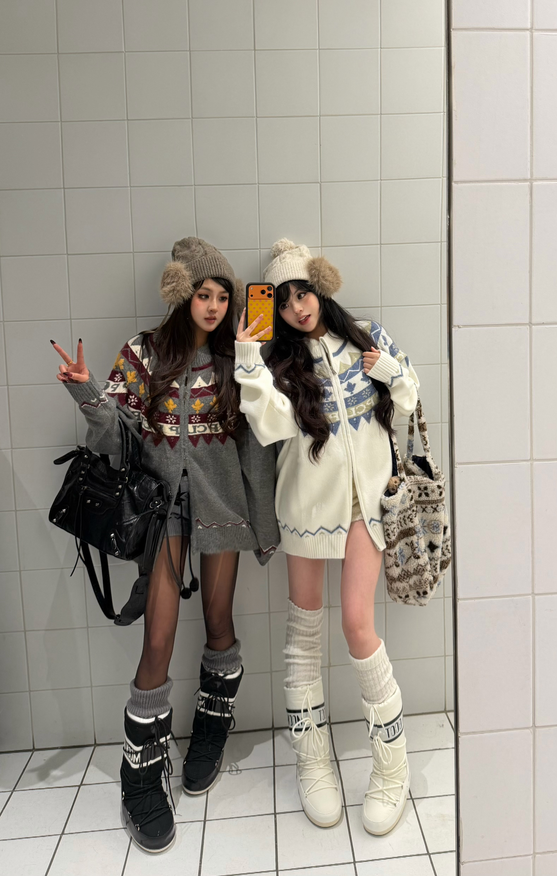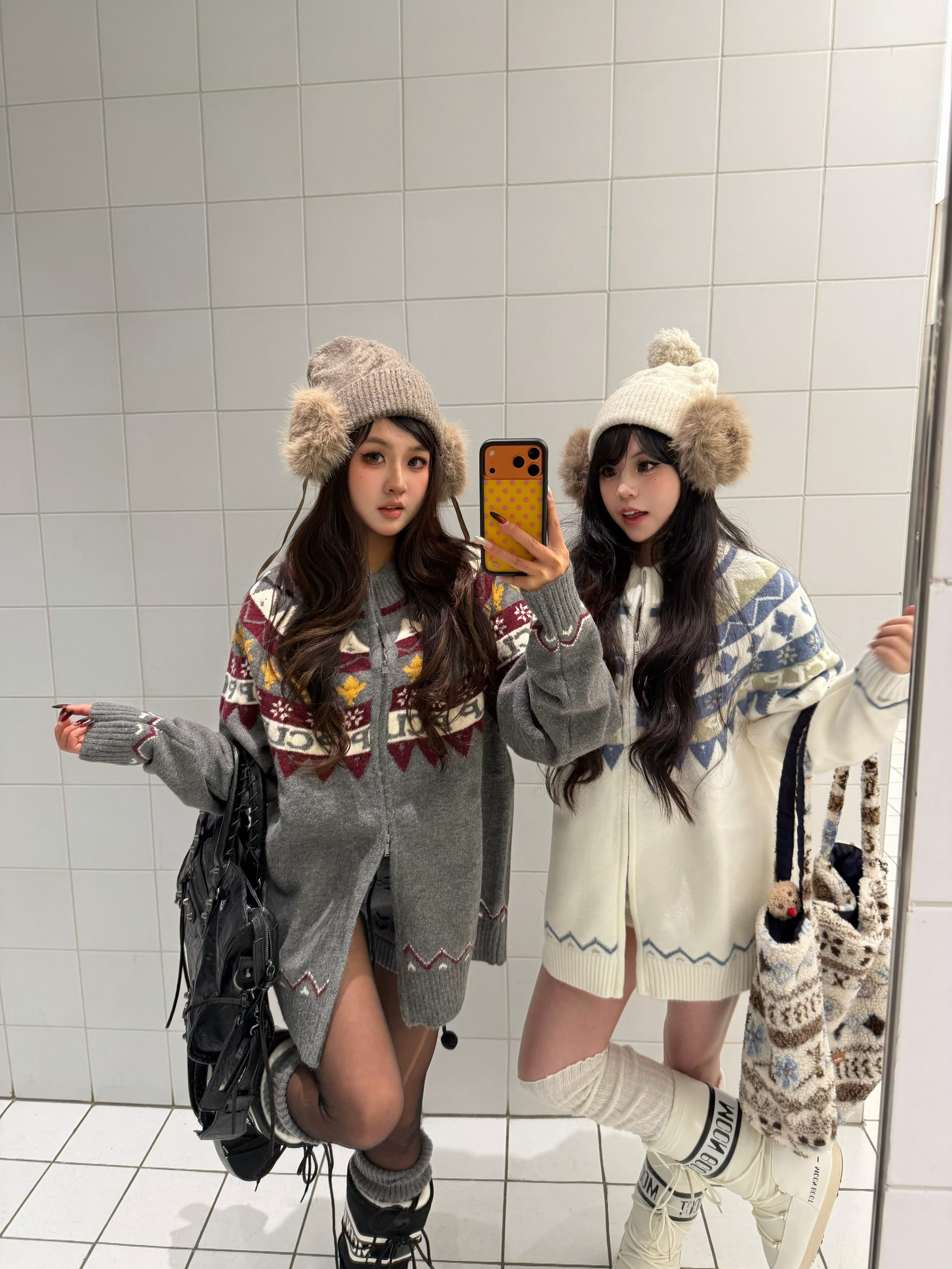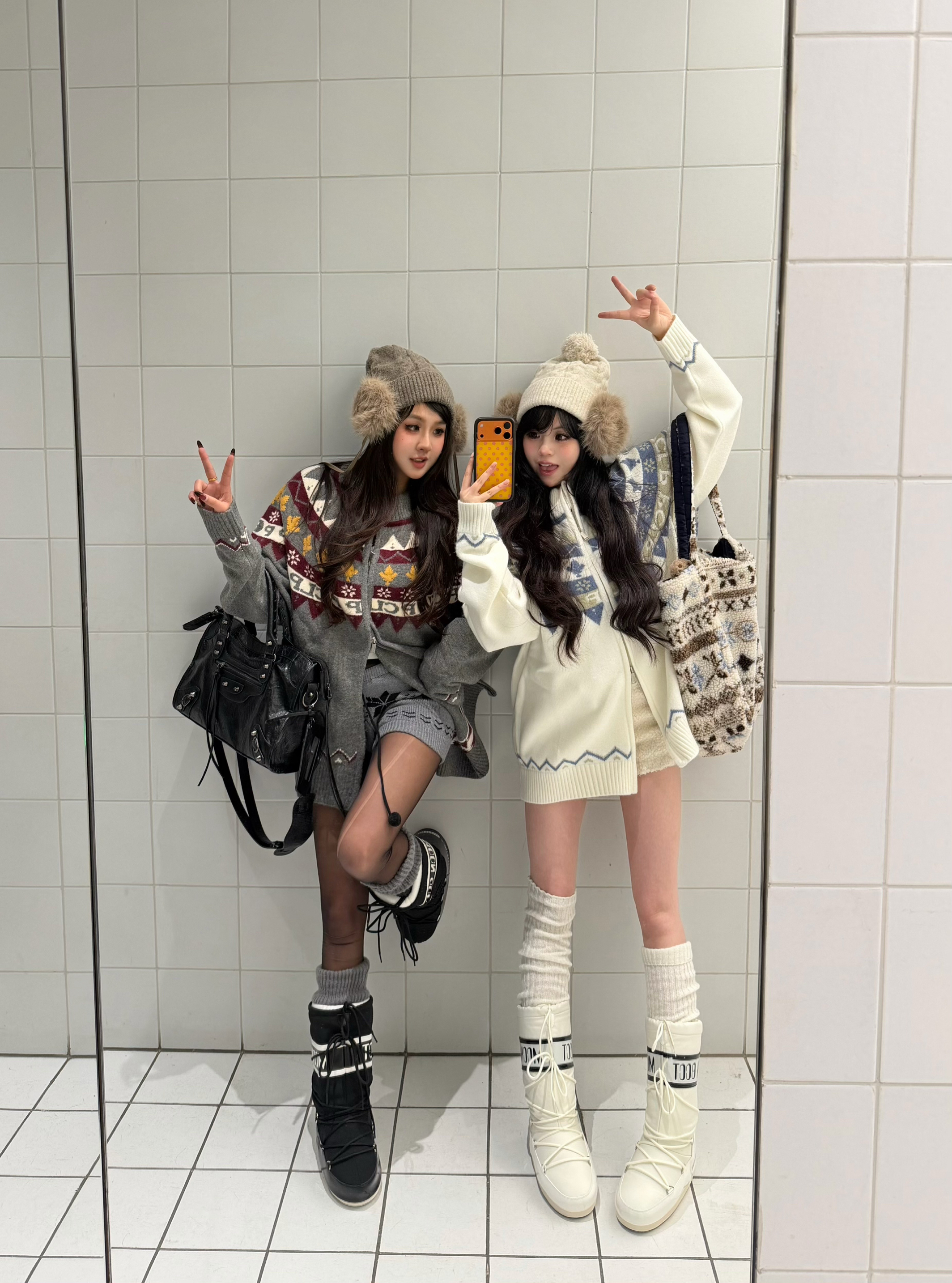 这件开衫的提花里藏着小巧思,灰与白的配色温柔又清爽,完全不挑皮,穿上就是自带柔光的氧气感甜妹。 ✨My OOTD Tips: 1. 配色心机:选择低饱和的费尔岛图案,比传统红更显高级,韩系松弛感拉满。 2. 下装留白:毛衣图案丰富,下装直接搭光腿神器+同色系雪地靴,视觉上更显轻盈高挑。 3. 配饰加分:同材质的毛球针织帽是灵魂,和毛衣呼应,暖乎乎的少女感这不就来了。 百元价位穿出千元质感...