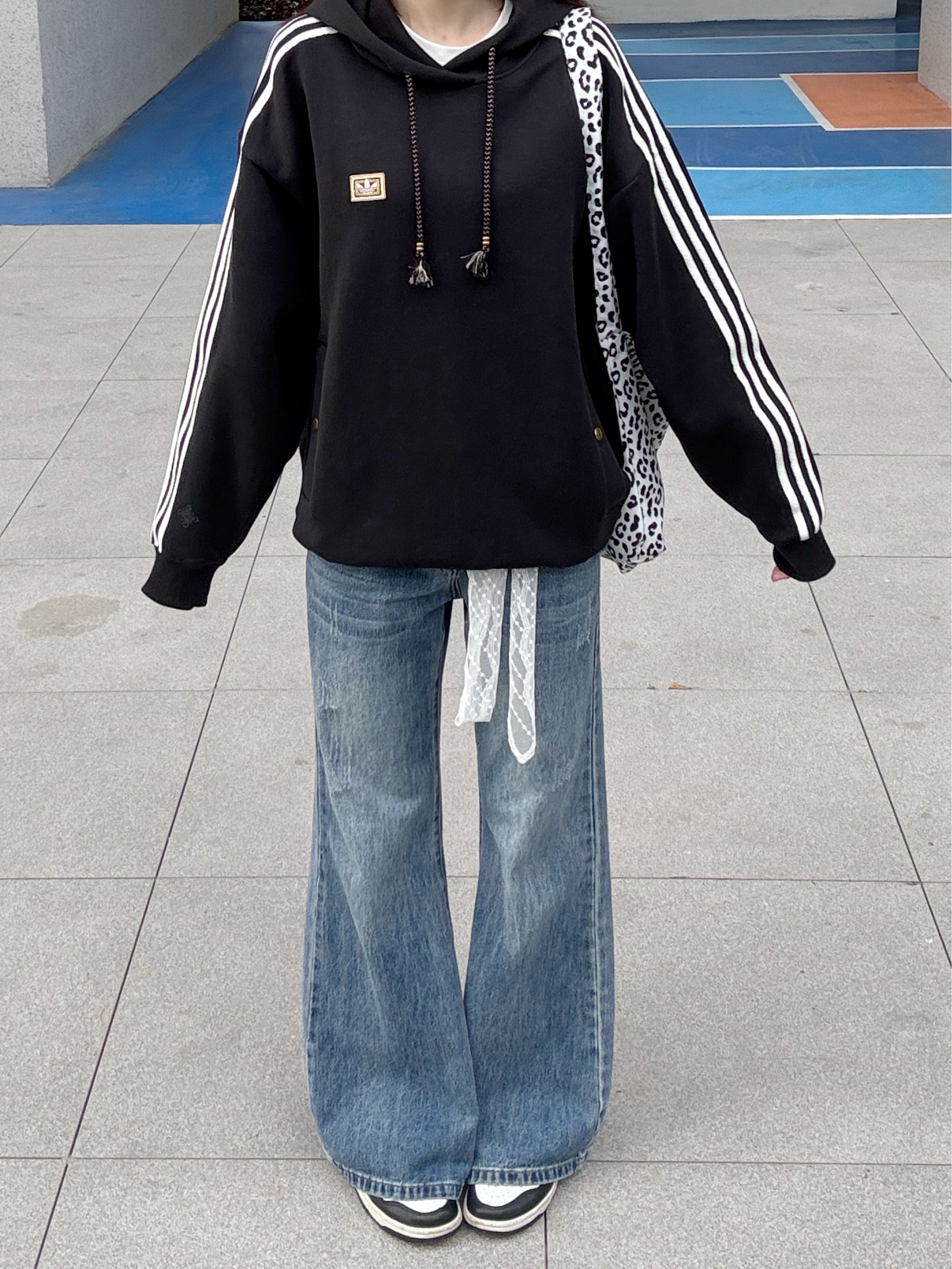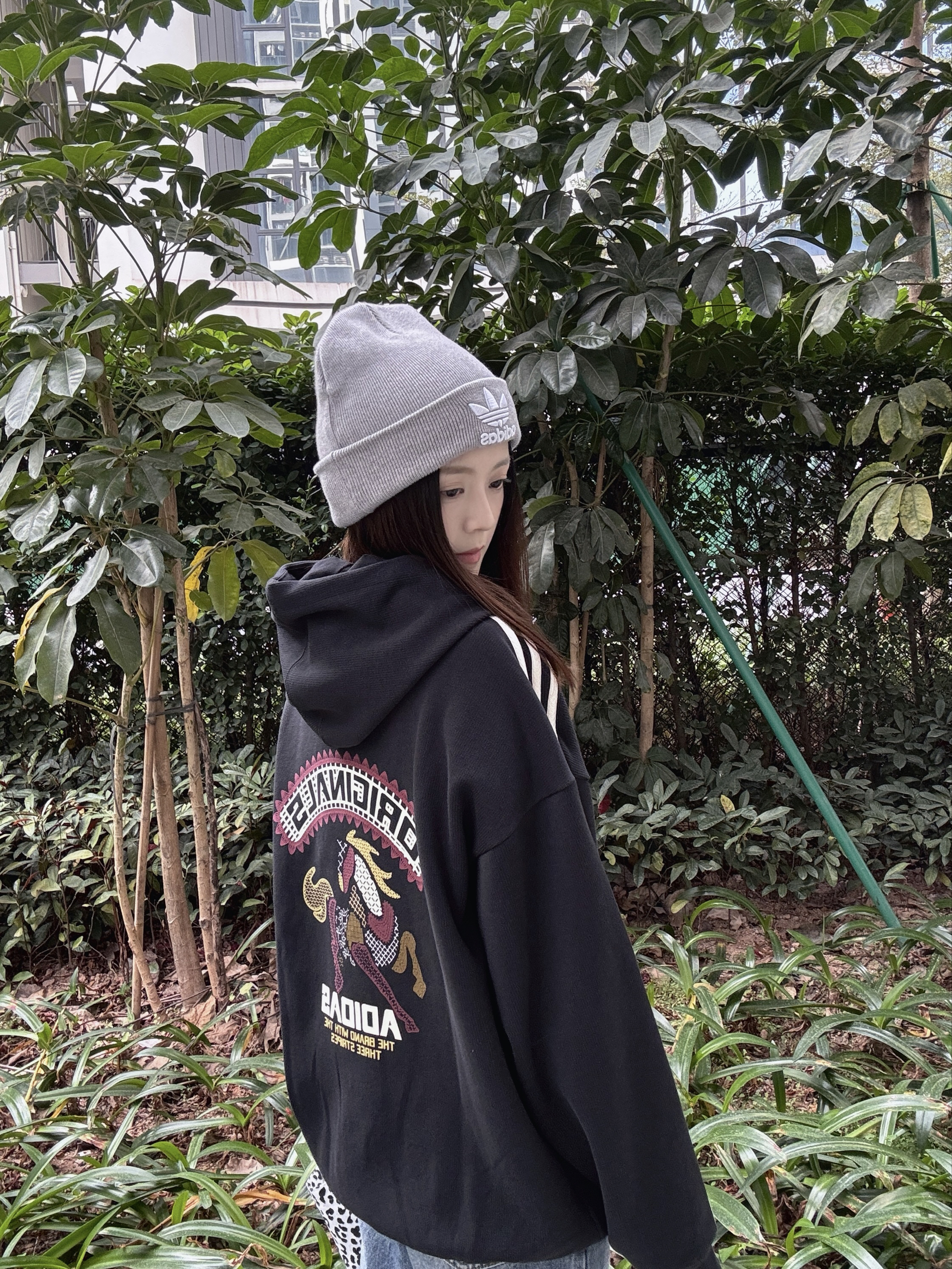 衣柜里少不了的黑色卫衣 后背马年印花回头率💯 三条杠经典又百搭!! 男女都能穿哦 我170 50穿的s哦✌️