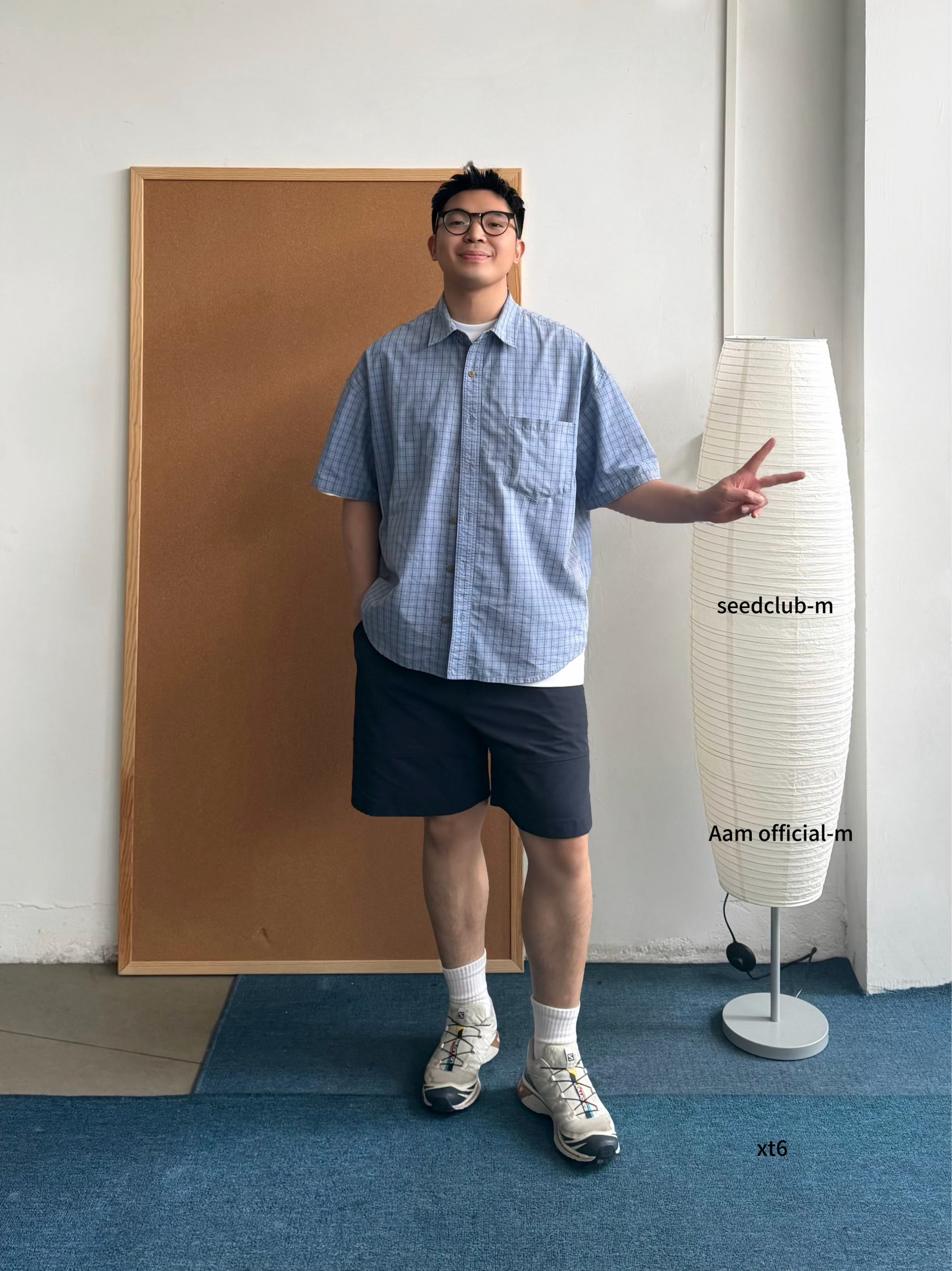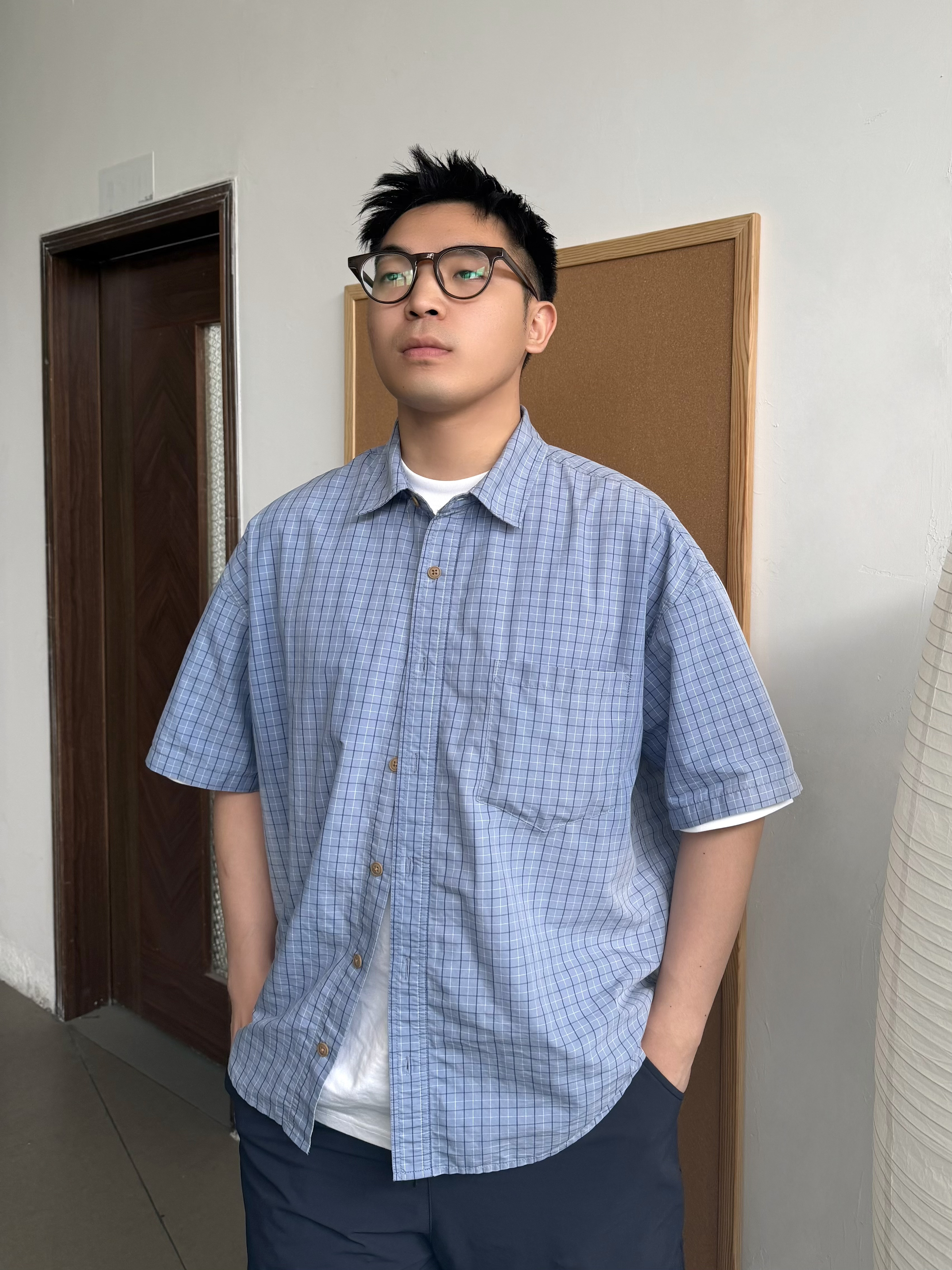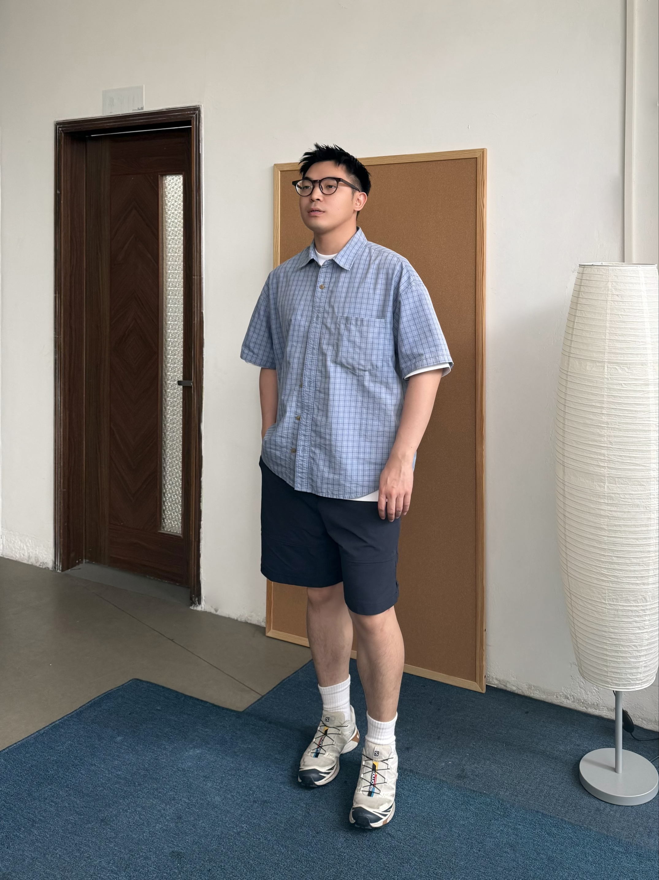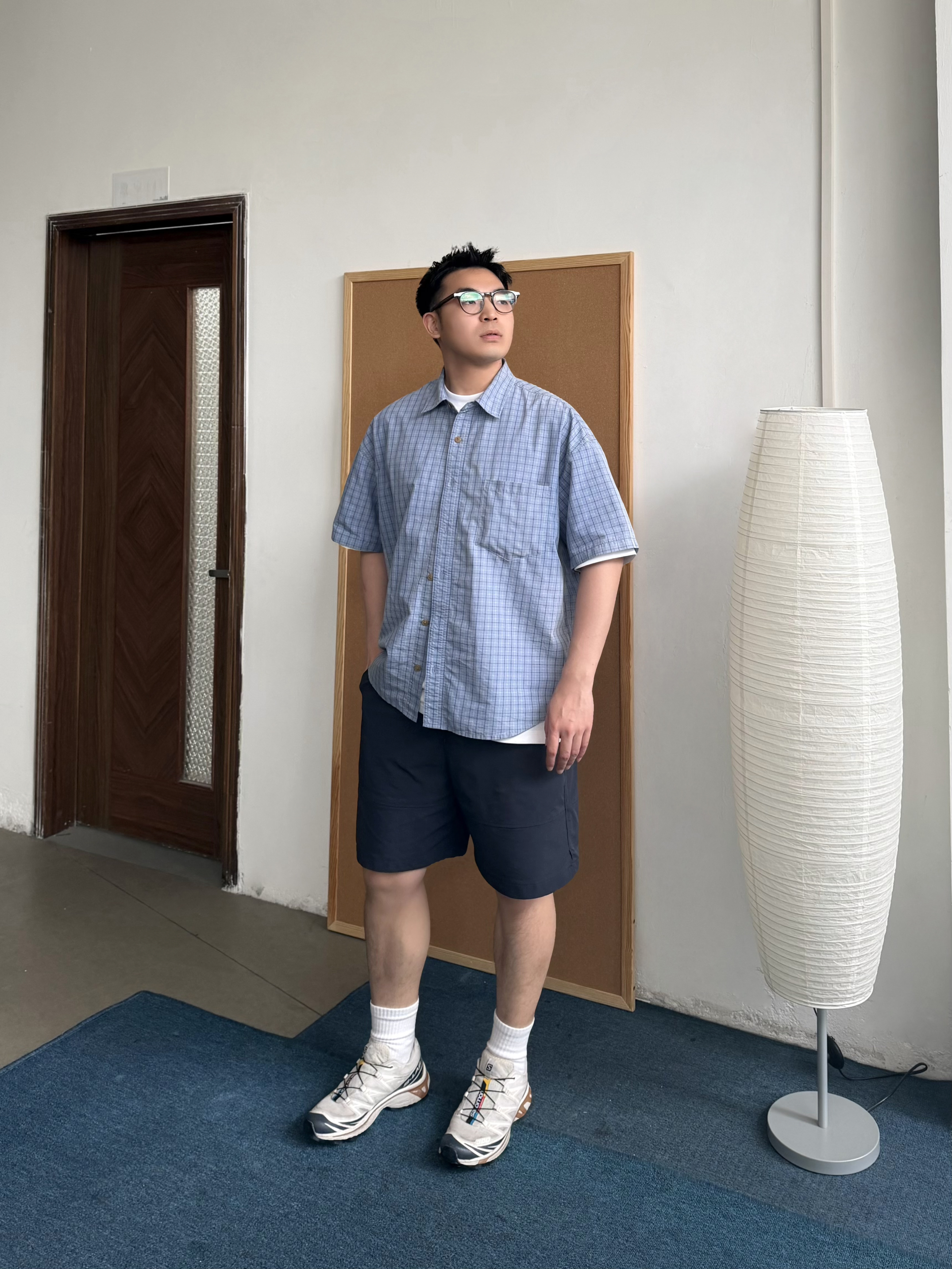 👔 上衣:选一件蓝色格纹衬衫,颜色偏浅一点会更干净,淡人穿不容易显得用力。版型稍微宽松,早春可以单穿,也可以当外套。 🩳 下装:搭配同色系运动短裤,整体做顺色延伸,视觉上更显高一些。 👟 鞋子:白色运动鞋收尾,把氛围拉回清爽日常感,干净又好搭。 淡人穿搭的核心其实就是:简单配色+顺色思路+干净鞋款,简单舒服。