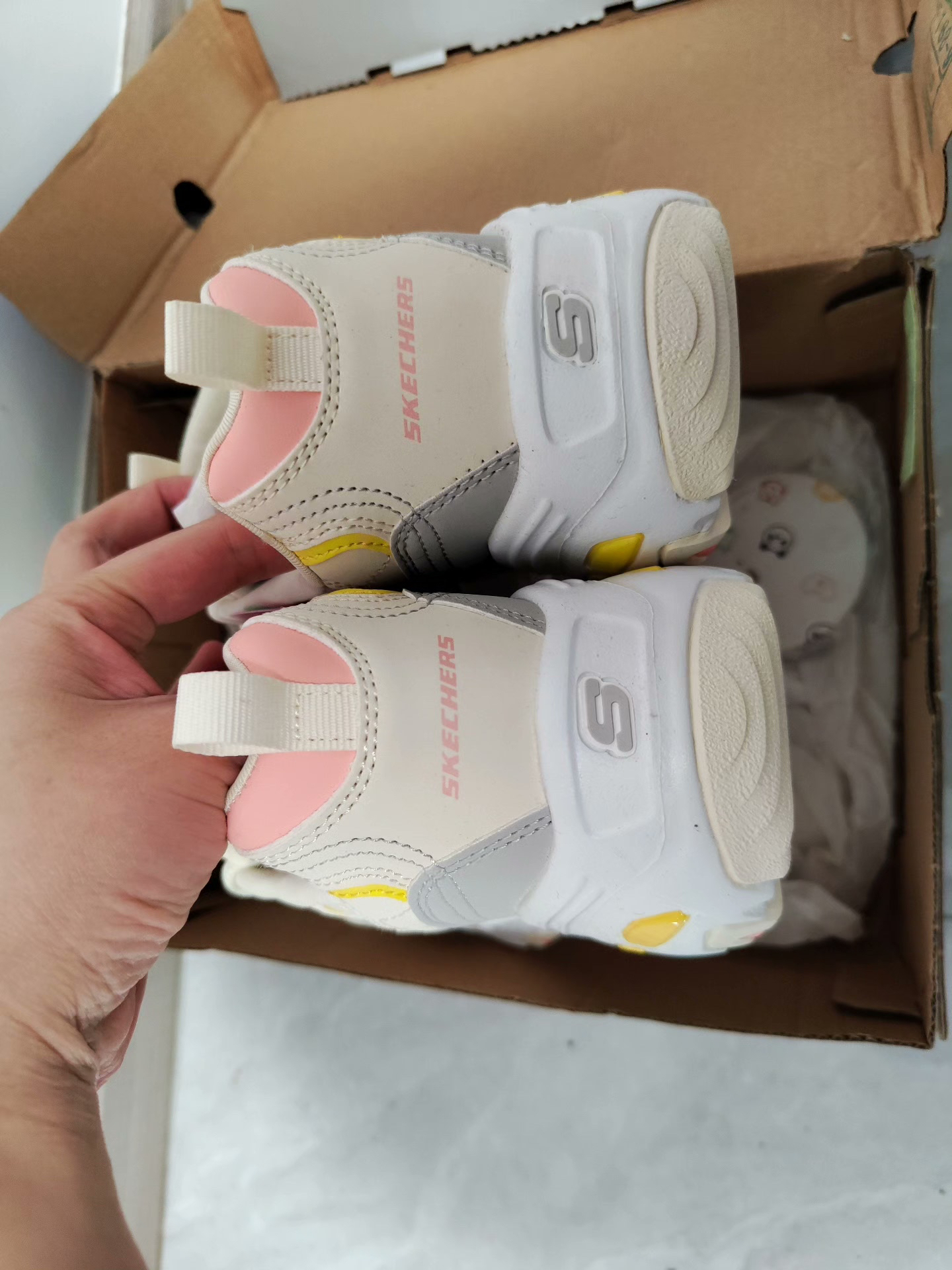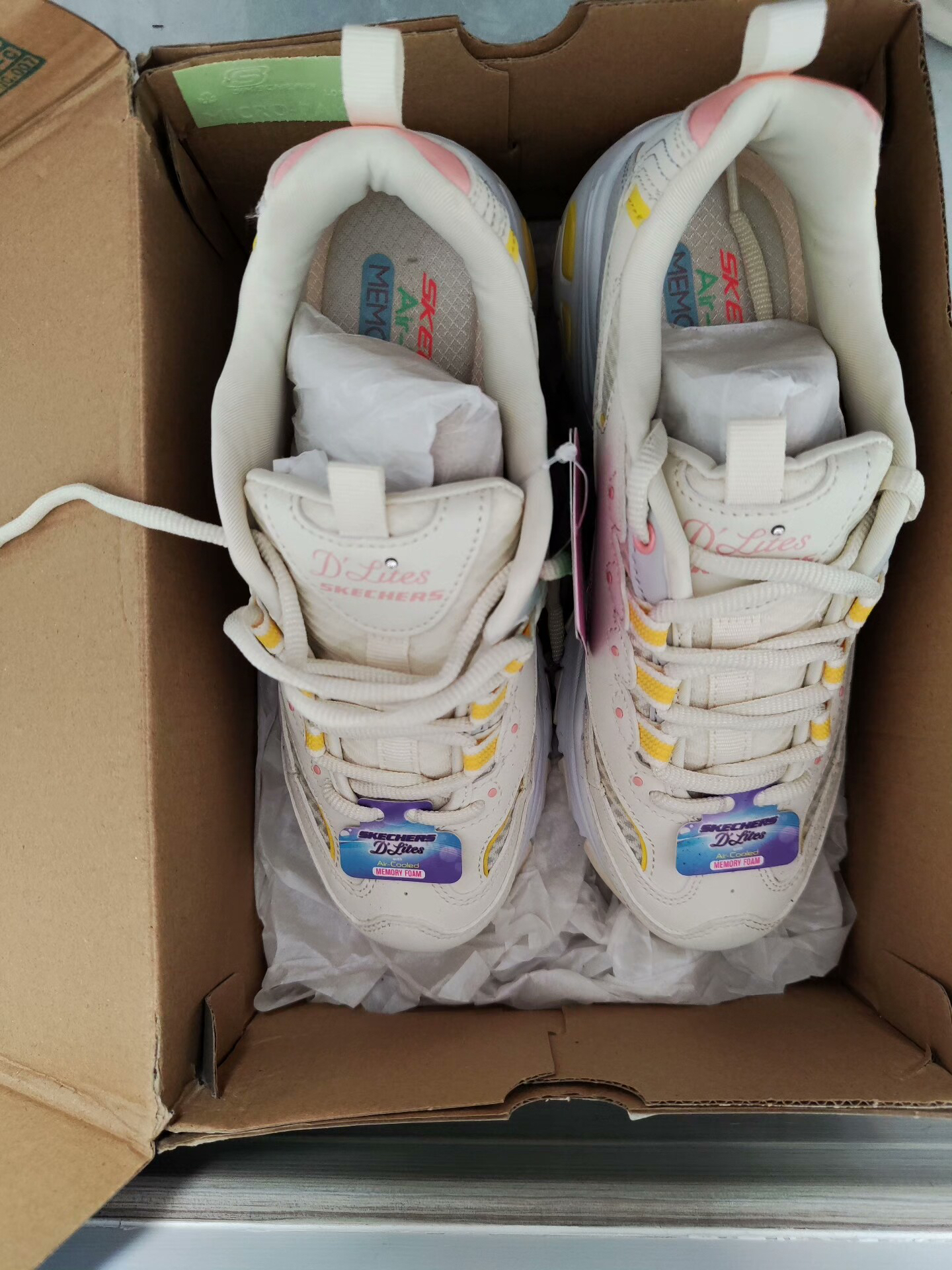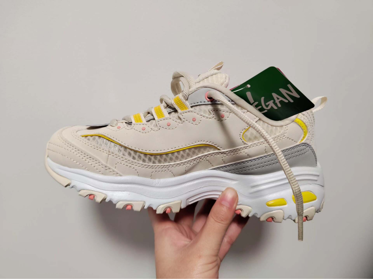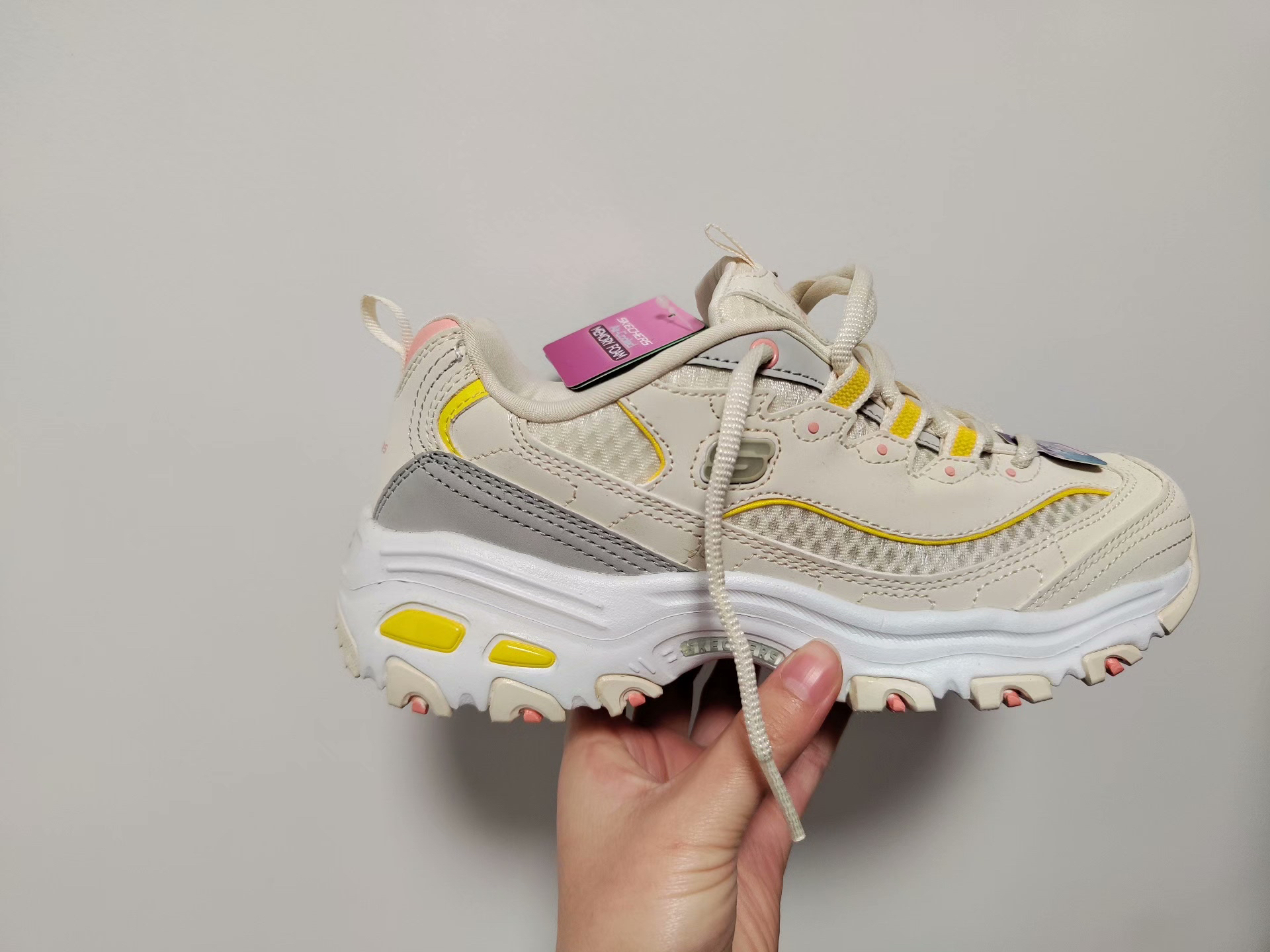 谁懂啊!刷到这双斯凯奇D'Lites的时候,我直接被戳中少女心!奶白+柠檬黄+樱花粉的配色,简直是把春天穿在脚上,甜而不腻,温柔又元气~ ✨ 颜值细节 • 配色:米白主调+明黄线条+粉粉的鞋眼扣,甜妹DNA狠狠动了! • 材质:网布+皮革拼接,透气又有质感,夏天穿也不闷脚。 • 鞋型:经典老爹鞋轮廓,厚底设计悄悄增高5cm,腿长直接拉满,对小个子太友好了! 👟 上脚体验 • 脚感:记忆棉鞋...