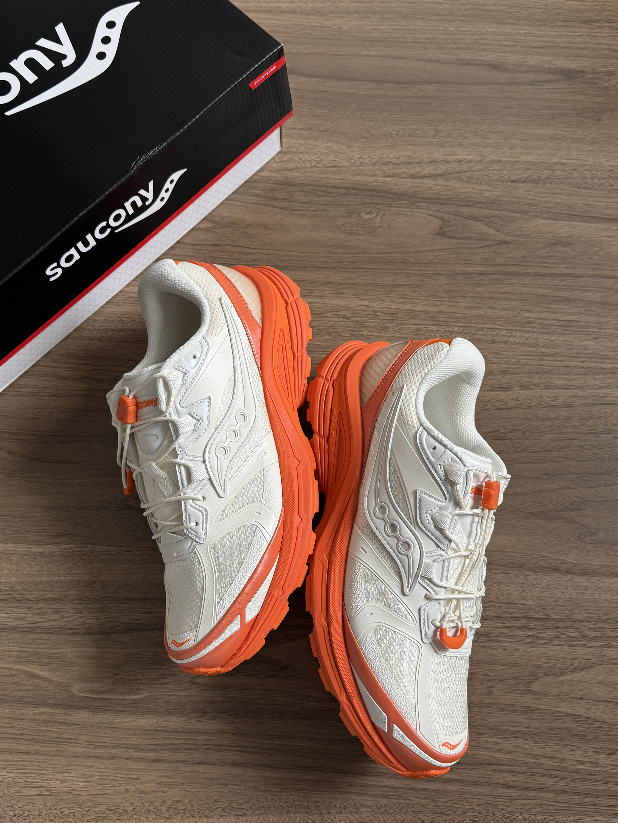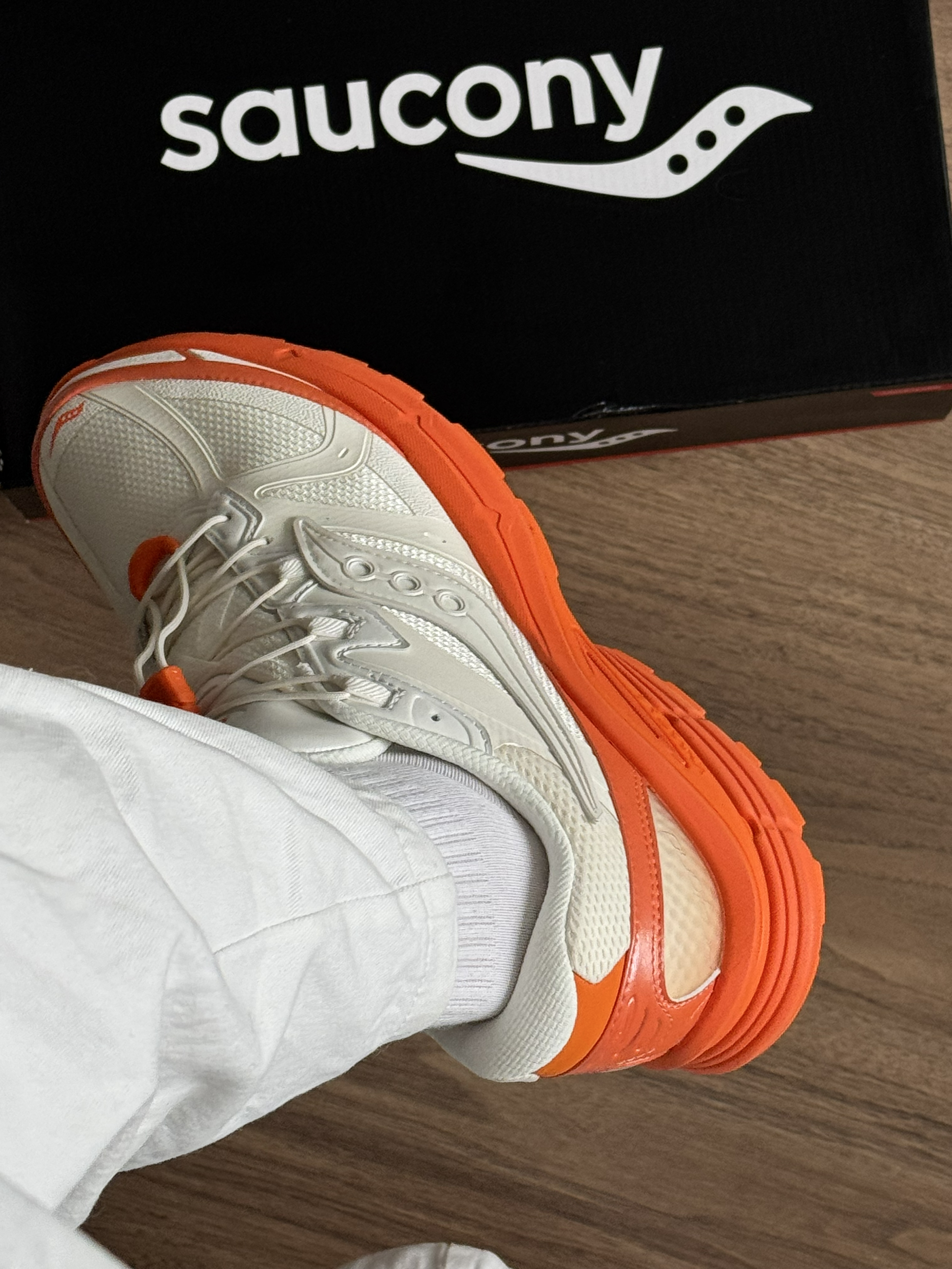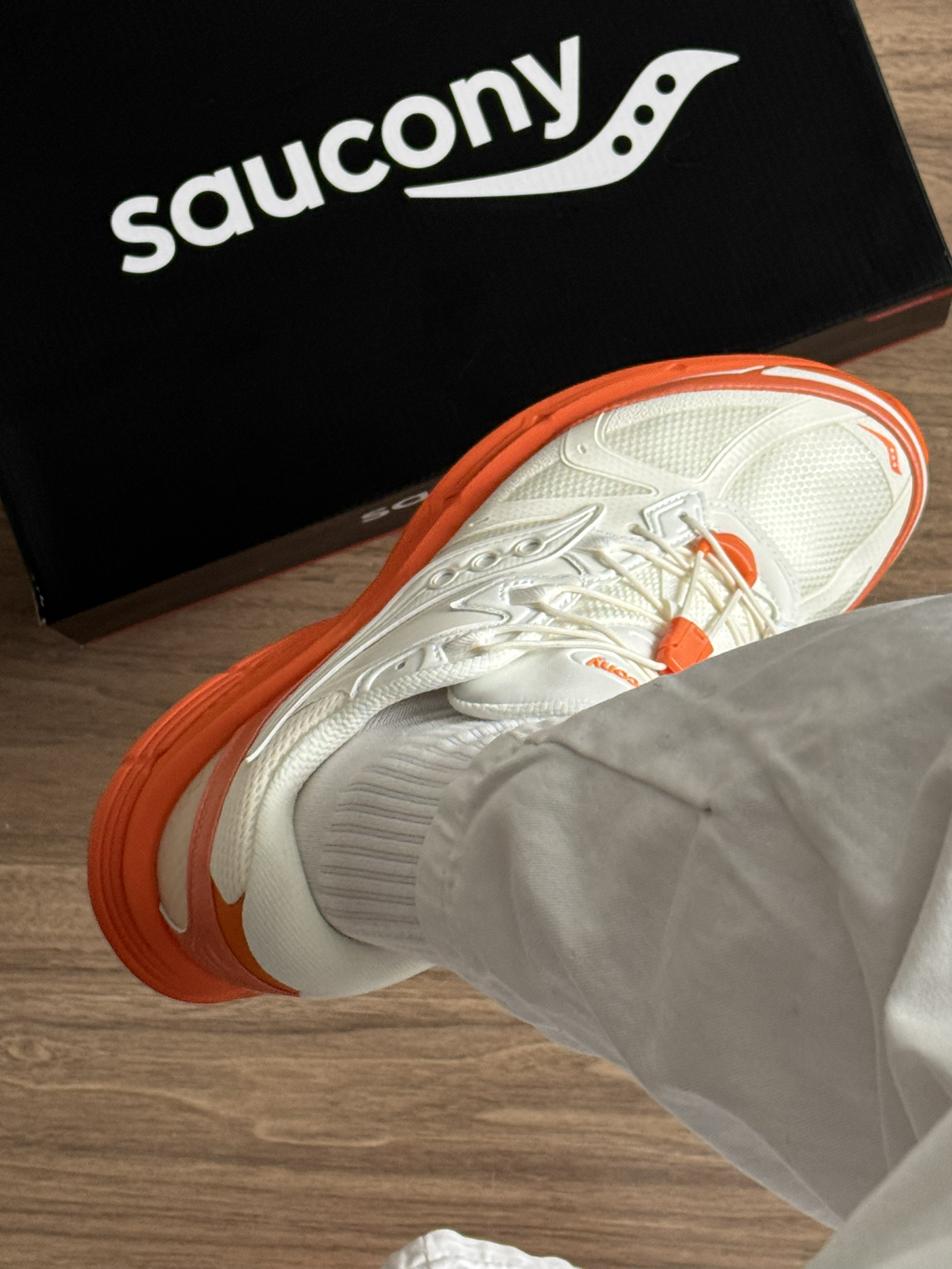 别再穿全白鞋了👋 这双Saucony的奶白+亮橙低饱和不挑皮🍊 上脚直接白两个度! 鞋底点缀活力,日常出街回头率超高📷