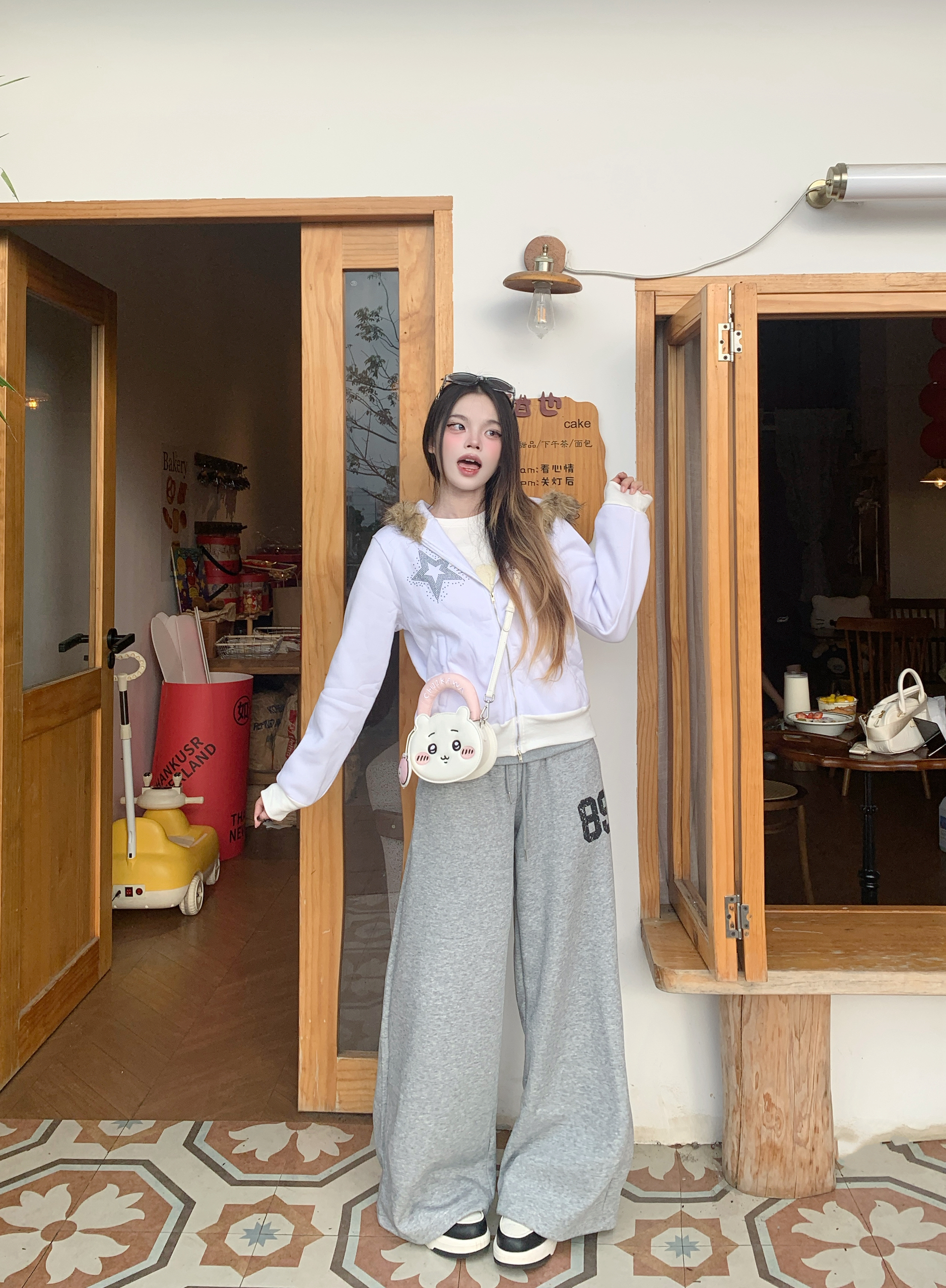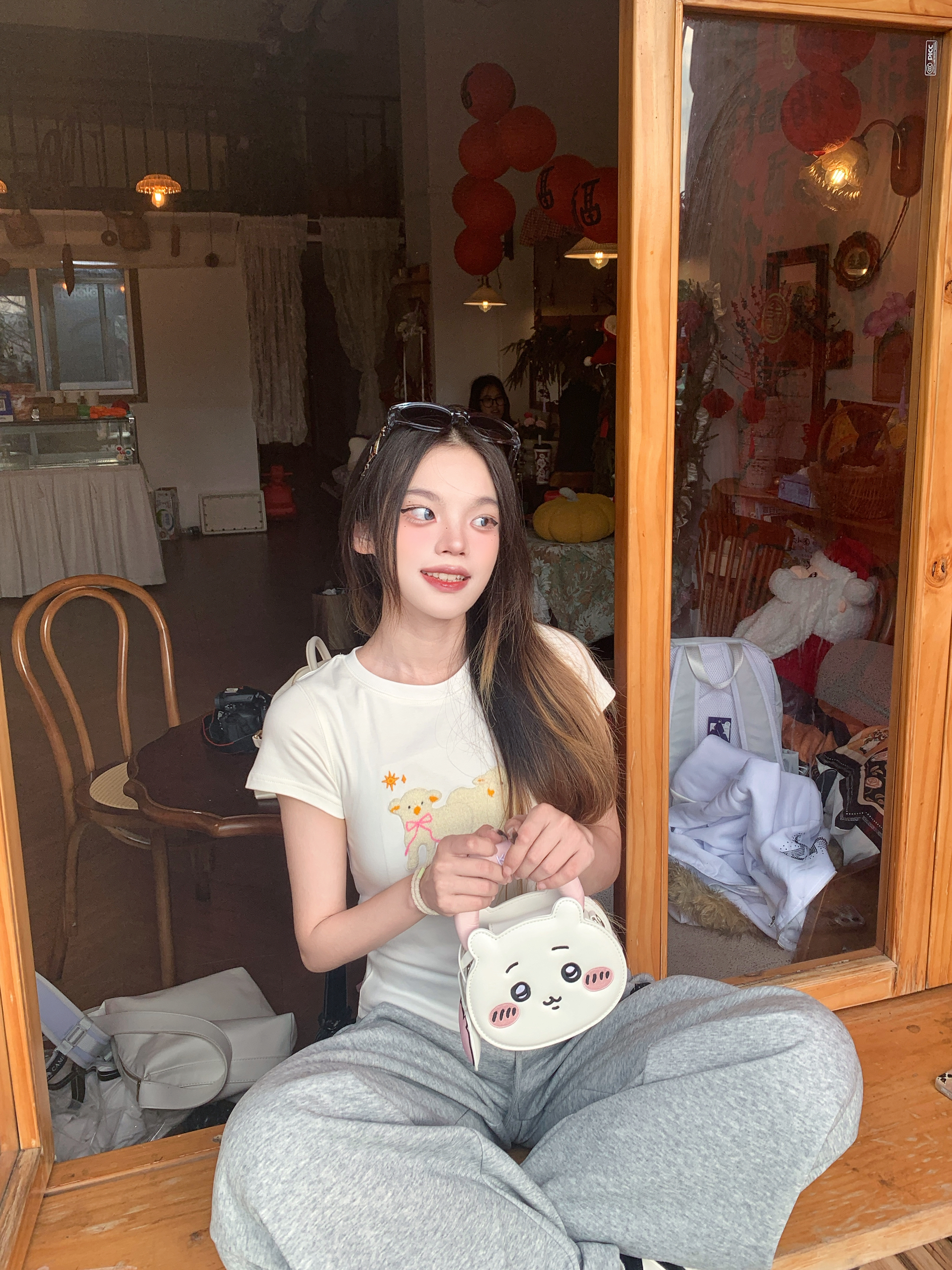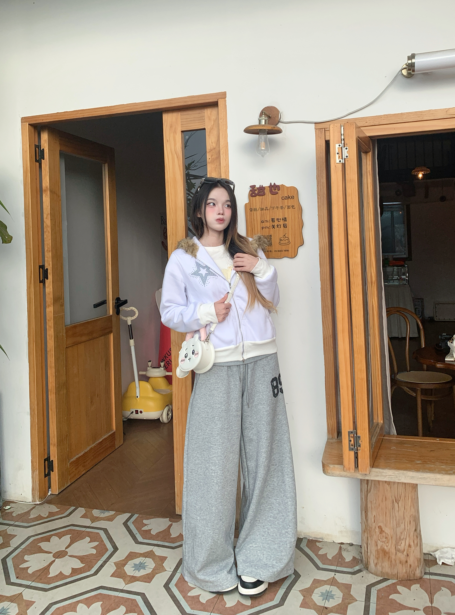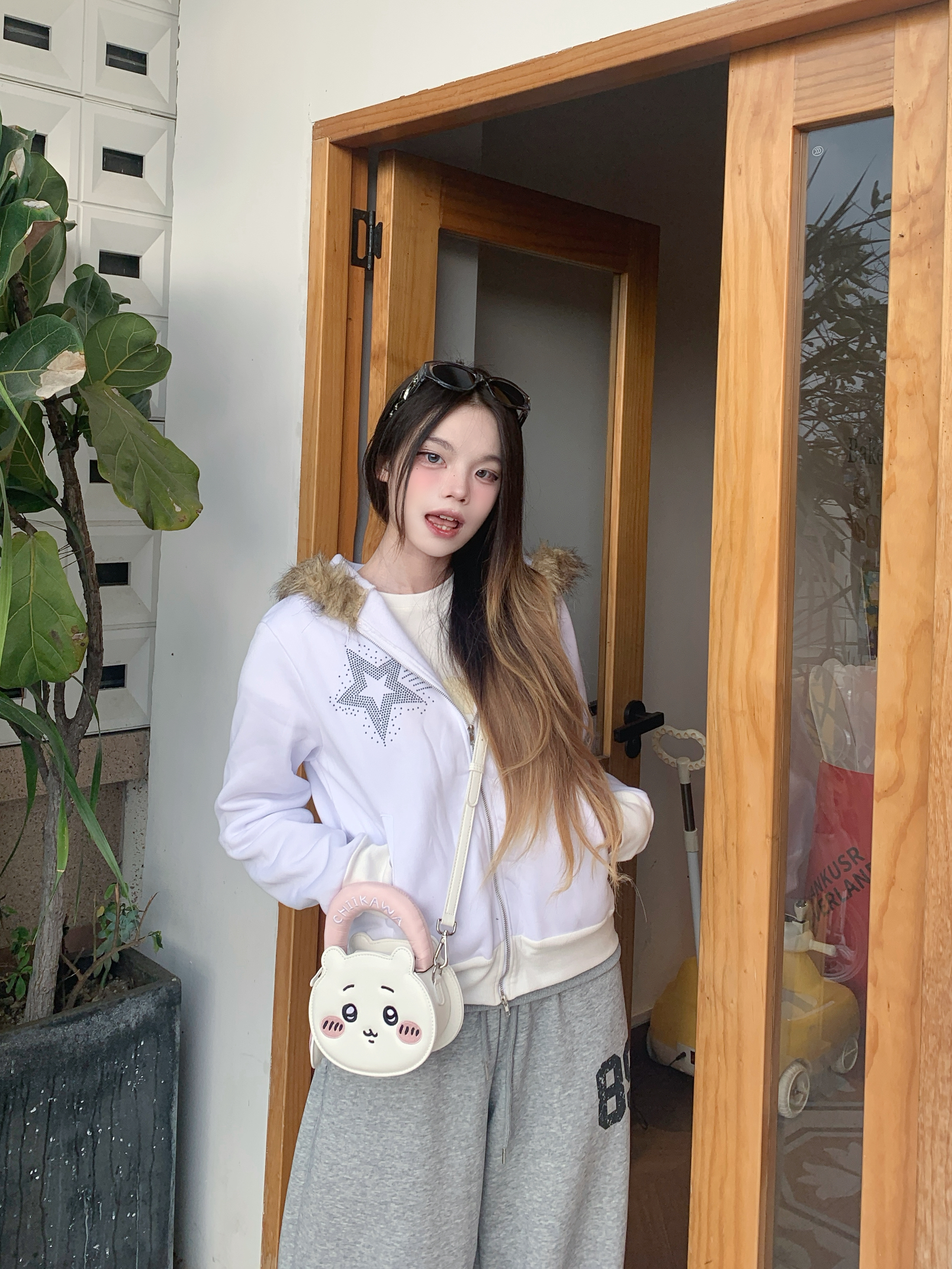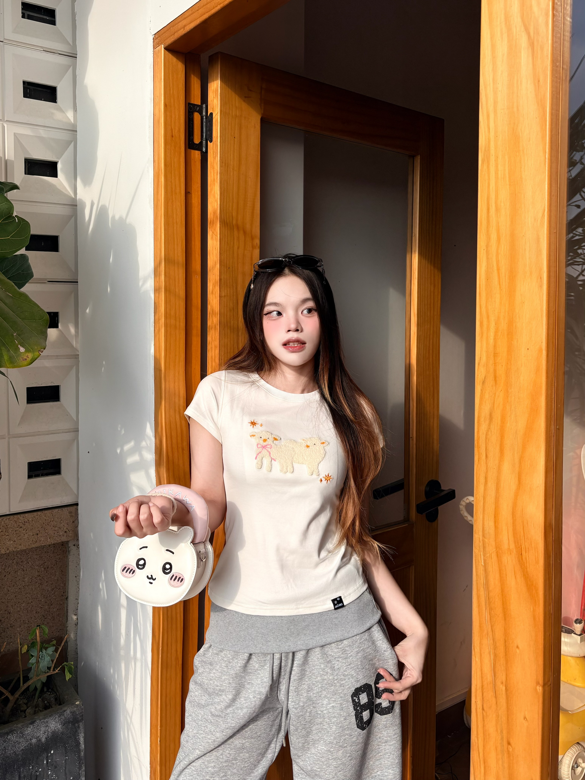 白T加卫裤的基础款,最怕穿得路人,还好有吉伊卡哇包包救场👛 奶白配色和上衣完美呼应,圆滚滚的造型真的太会了,挂在手上就是行走的可爱buff💗 包包主要起到了搭配作用 我平常出门装点口红💄都可以的