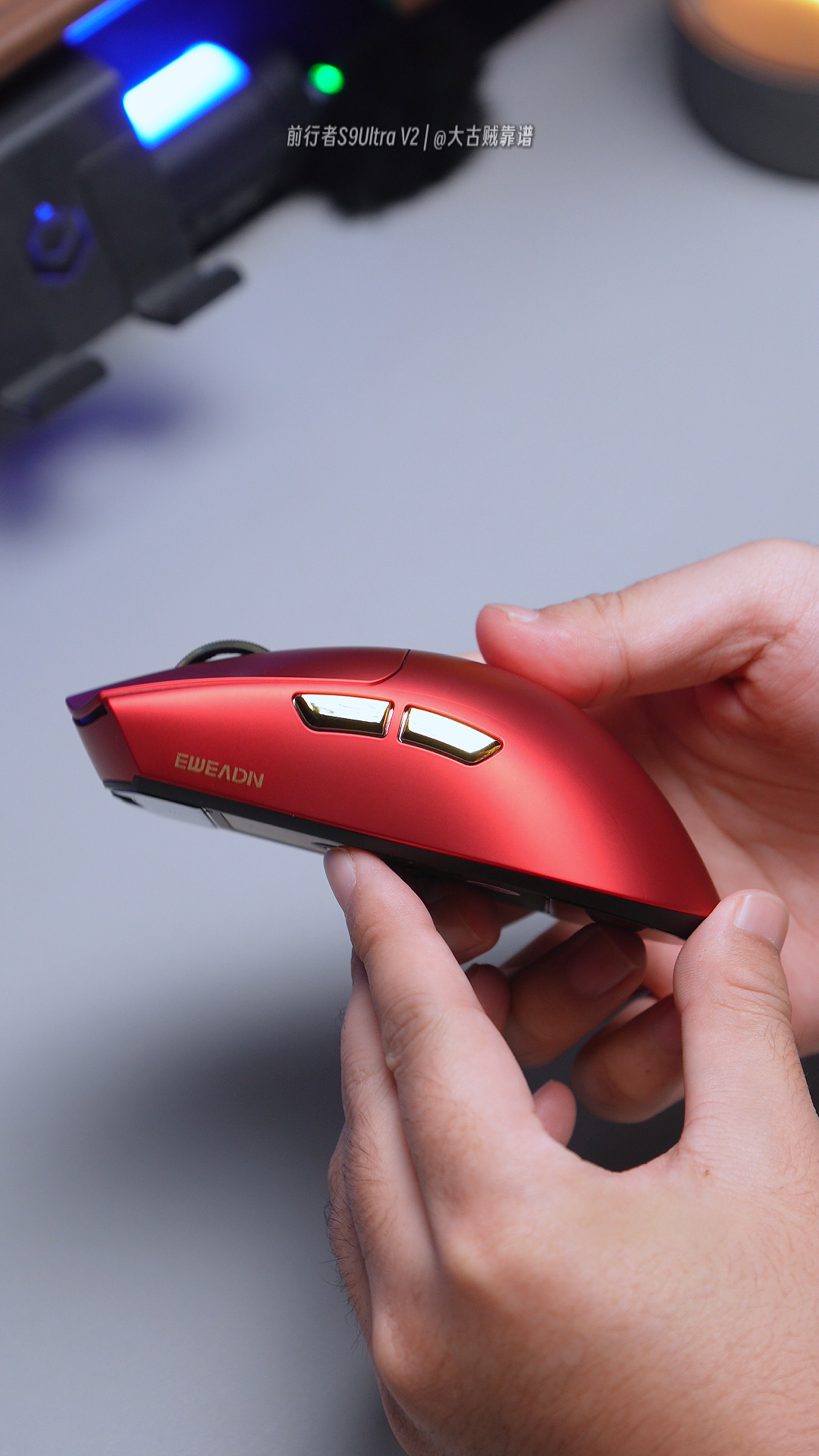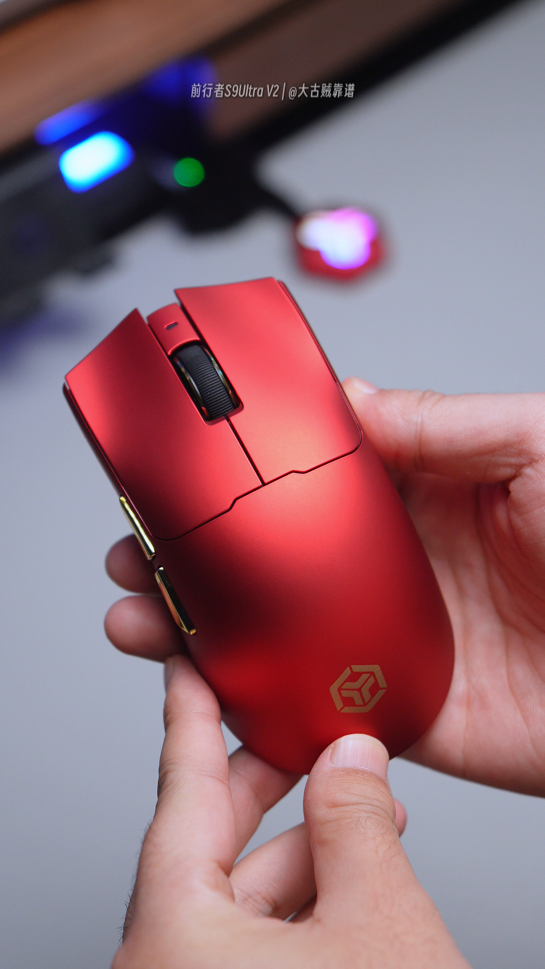 最近前行者S9Ultra V2风超大,说是毒蝰平替天花板~ 快过年了我入了赤焰红顶配版😎! 冰凝肤感涂层+金属漆,视觉和手感都很绝 类毒蝰模具对中大手友好,抓握趴握都有支撑👍。 去掉脚贴才66g左右,打游戏不累手~不到三张的价格,香到跺jio!