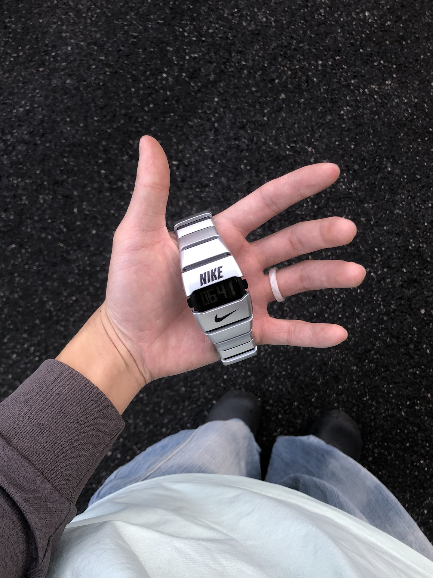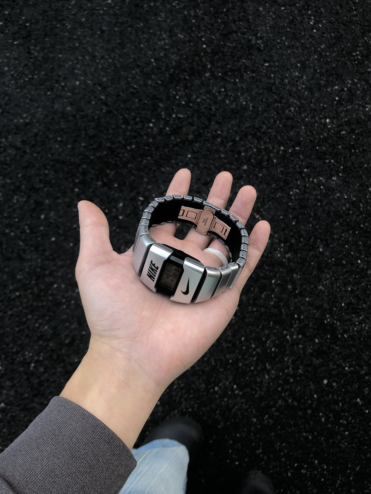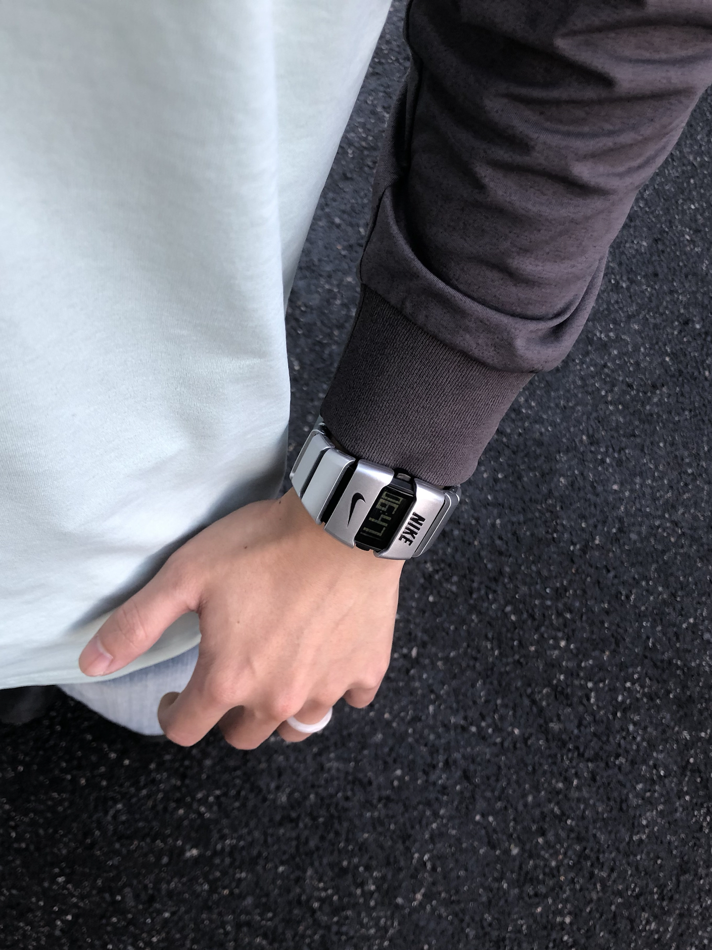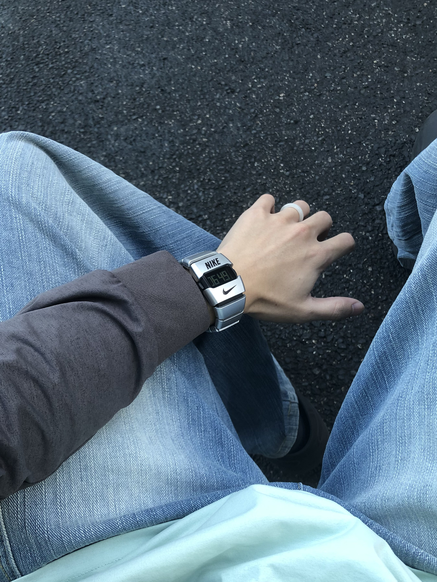 这块手表咋看起来这么像手环呢,确实还挺酷的哈 有点赛博朋克的感觉,表身是银色和黑色搭配着,是塑料的一个材质,还蛮轻的,佩戴上手也是酷酷的,今天天气挺好的,穿的长袖和牛仔裤,还挺合适的,圣诞来了,也可以安排安排, 潮流er可以冲!