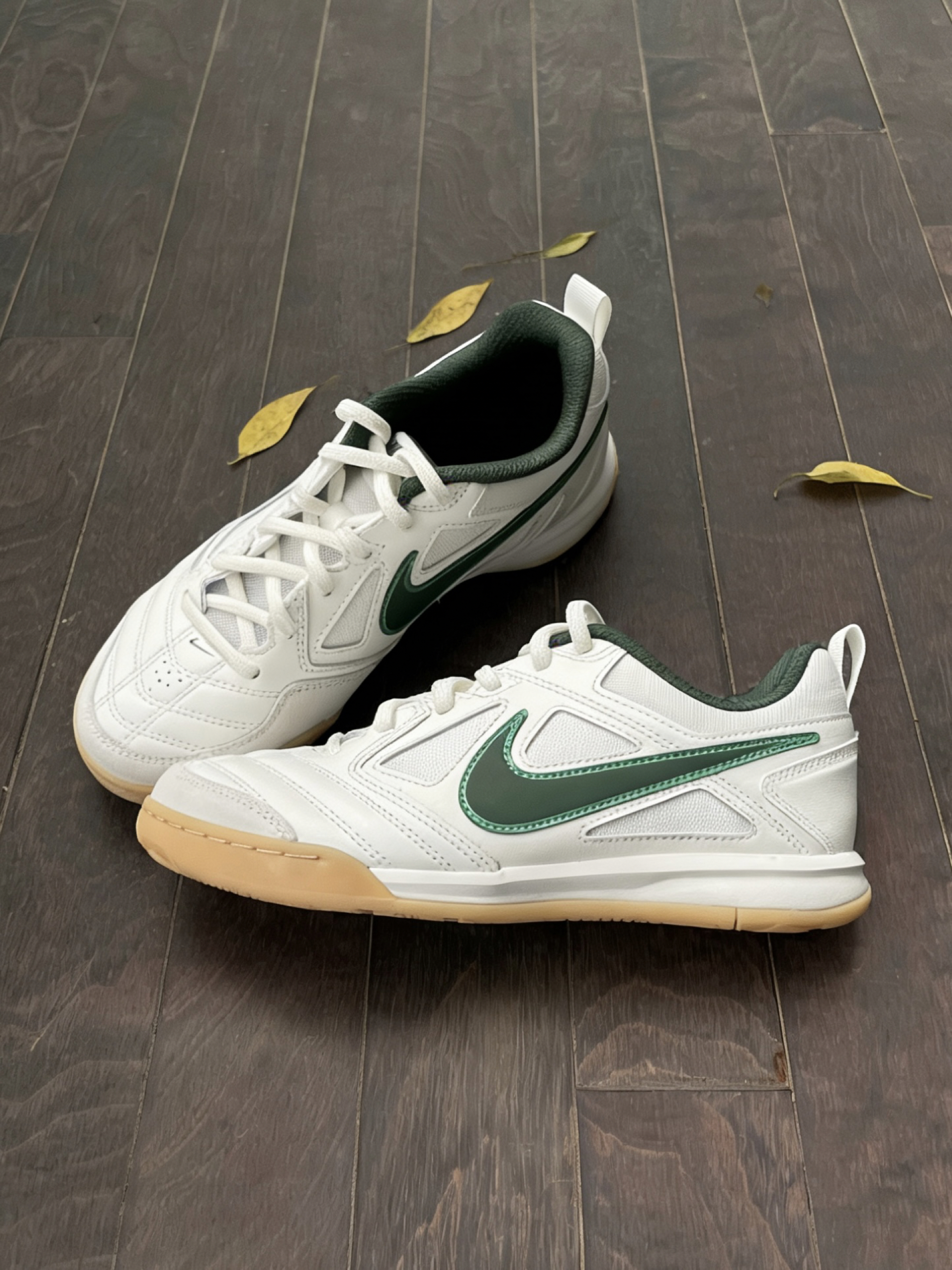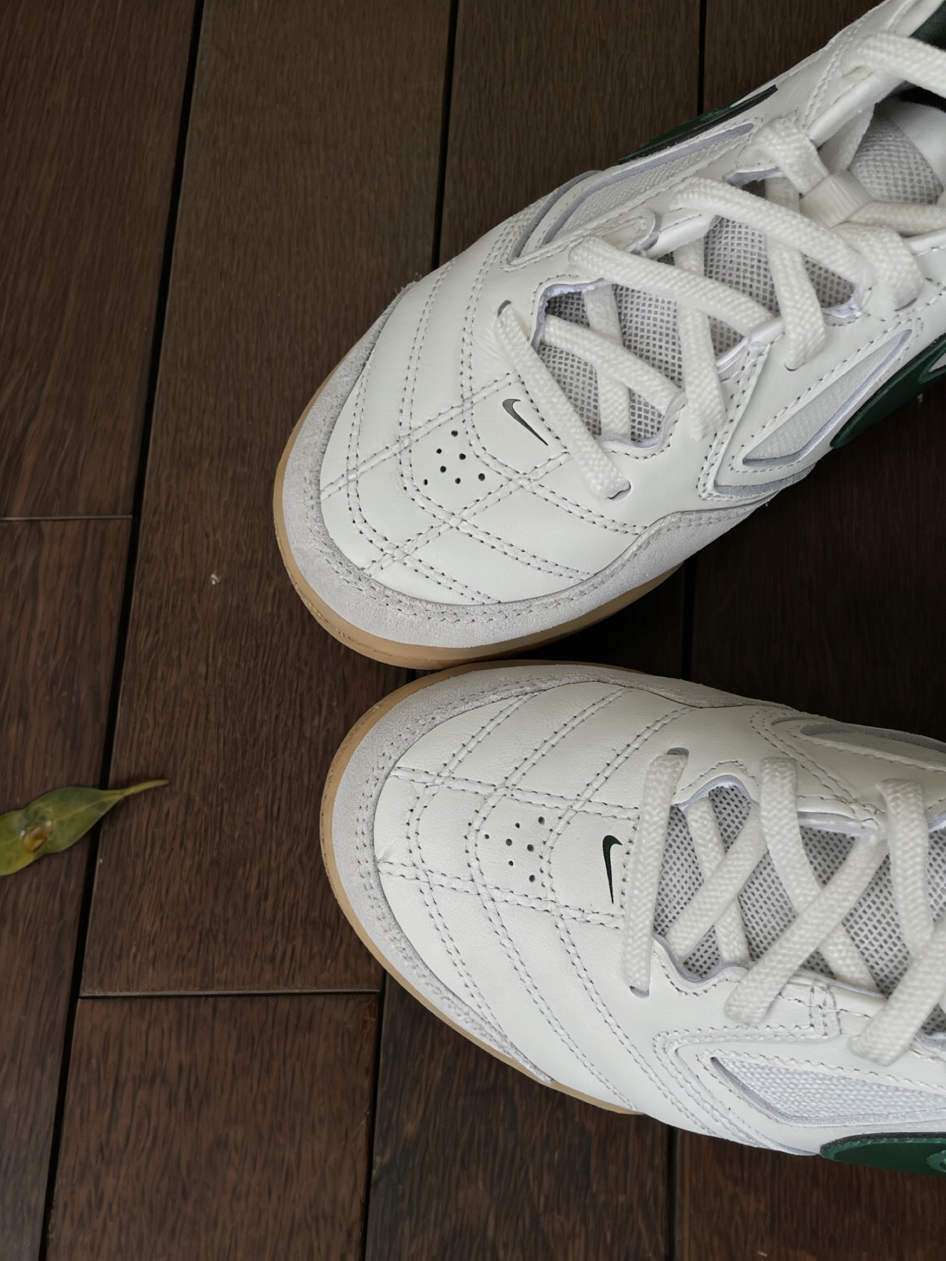 这双白绿生胶底的配色真的太戳人了!米白鞋身搭配质感满满的深绿Swoosh,再配上经典的生胶大底,低饱和度的调调自带日系复古滤镜,没有多余的花哨设计,全靠鞋型和细节撑场面,越看越有味道,上脚还巨显脚小,宽脚也能放心冲。鞋身是网布+皮革的拼接设计,鞋头还有足球鞋标志性的车线和透气孔,细节感直接拉满,既能保留复古球鞋的硬朗感,又不会显得笨重。