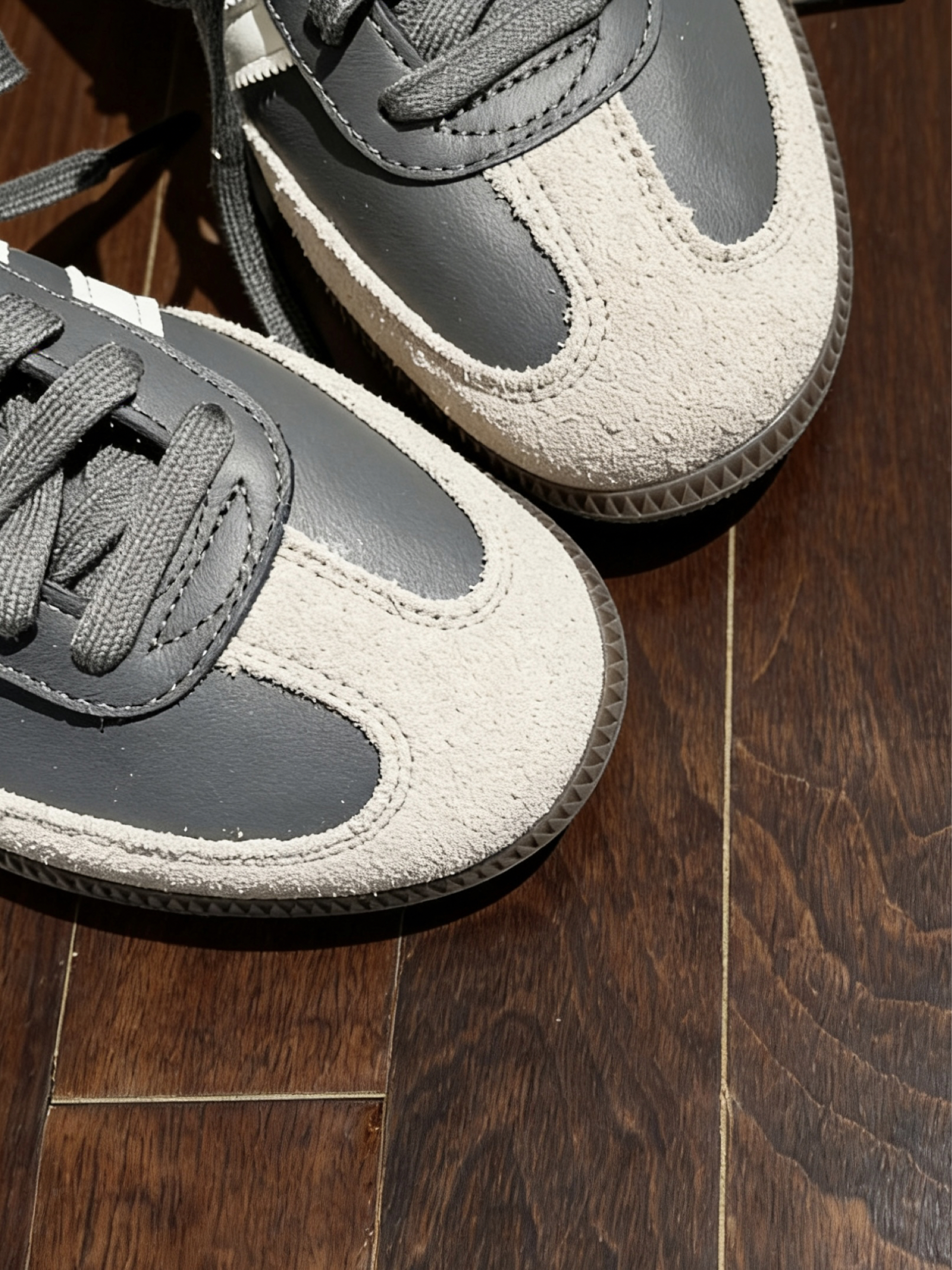 整双鞋以深灰色皮革为主调,搭配鞋头浅灰色麂皮,经典的三道杠以米白色呈现,再加上标志性的生胶大底,瞬间把人拉回70年代的足球赛场。鞋侧烫金的“SAMBA”字样,低调中透着精致,后跟的米白色装饰条则让整体层次更丰富