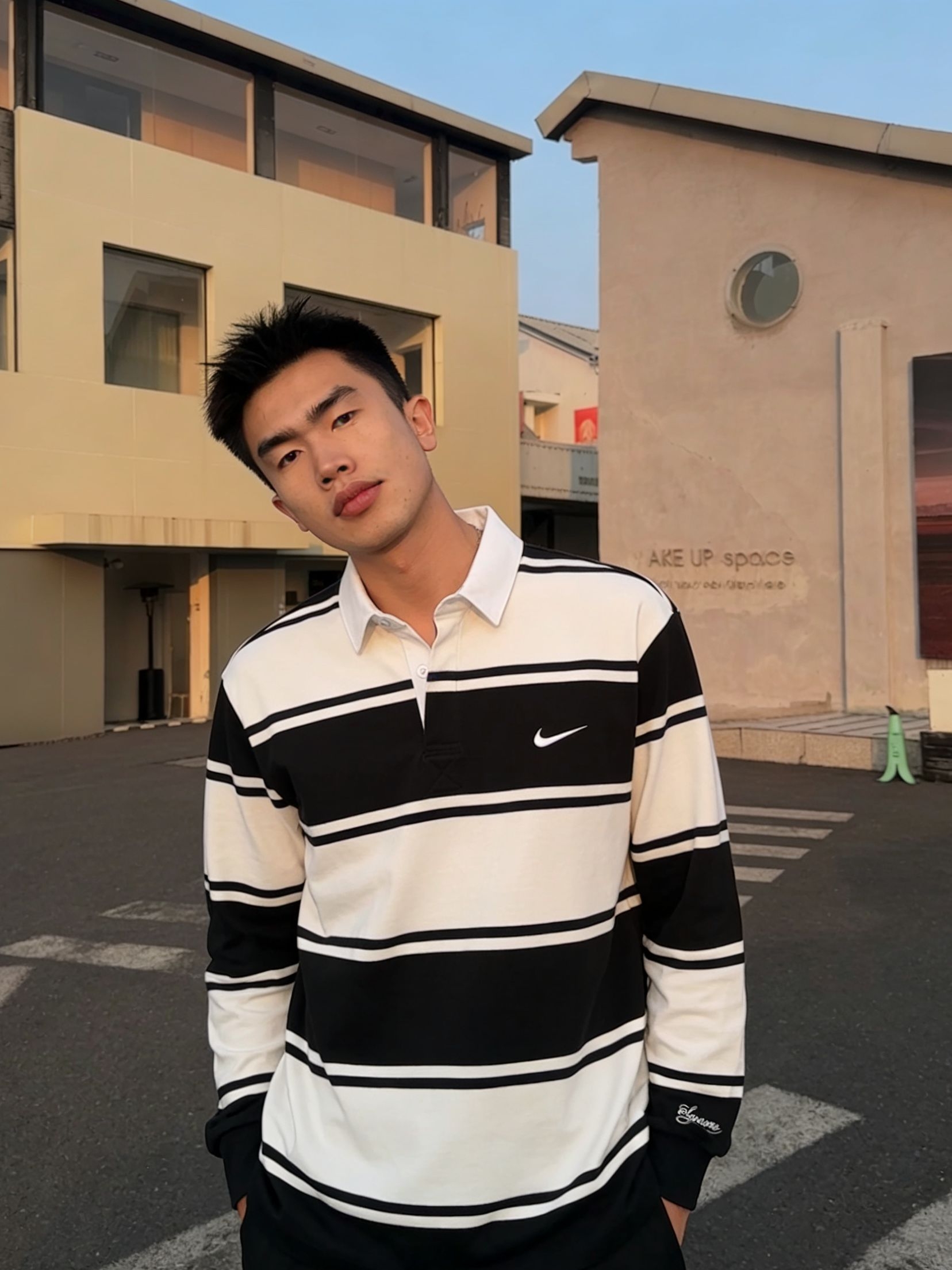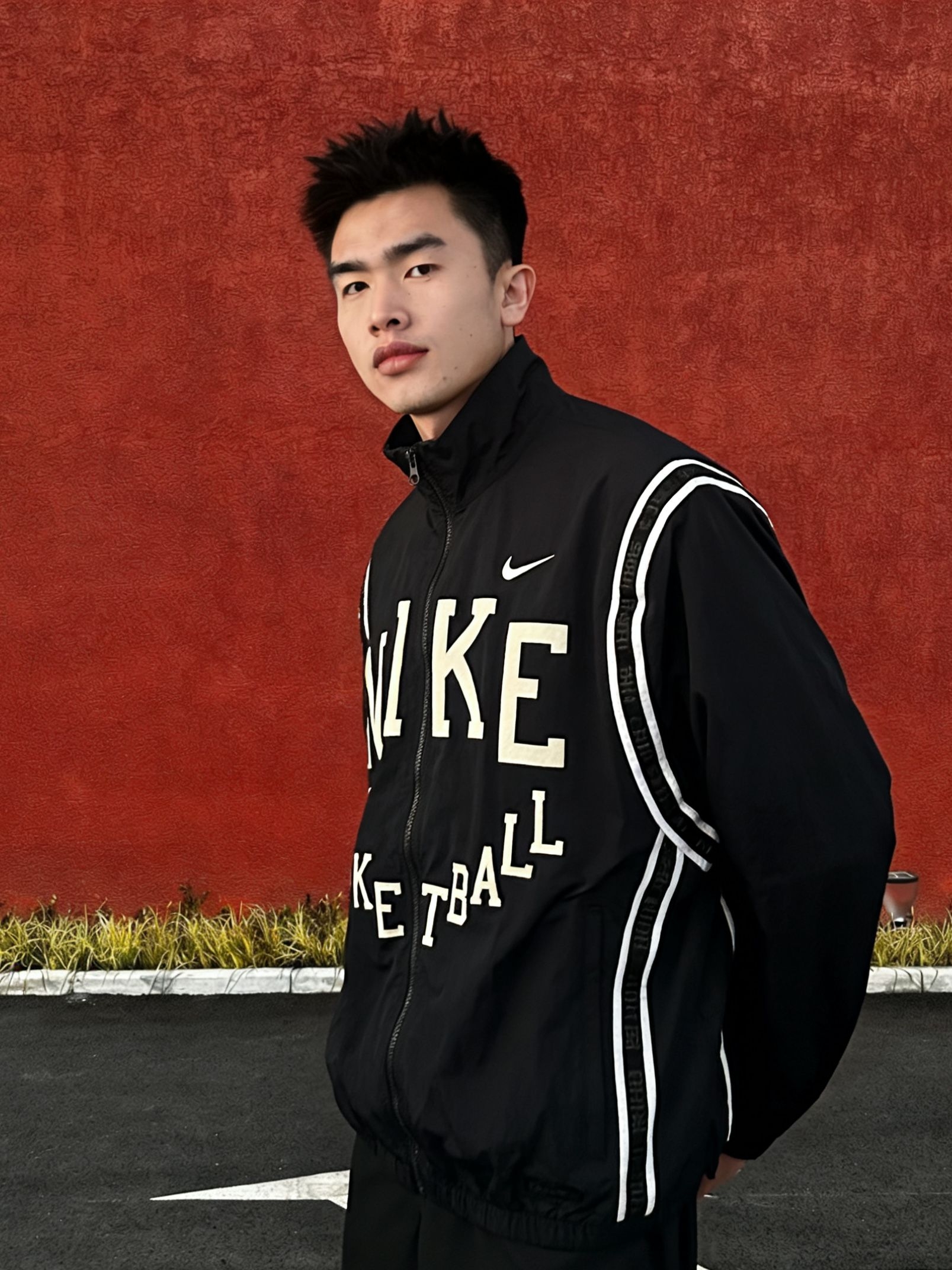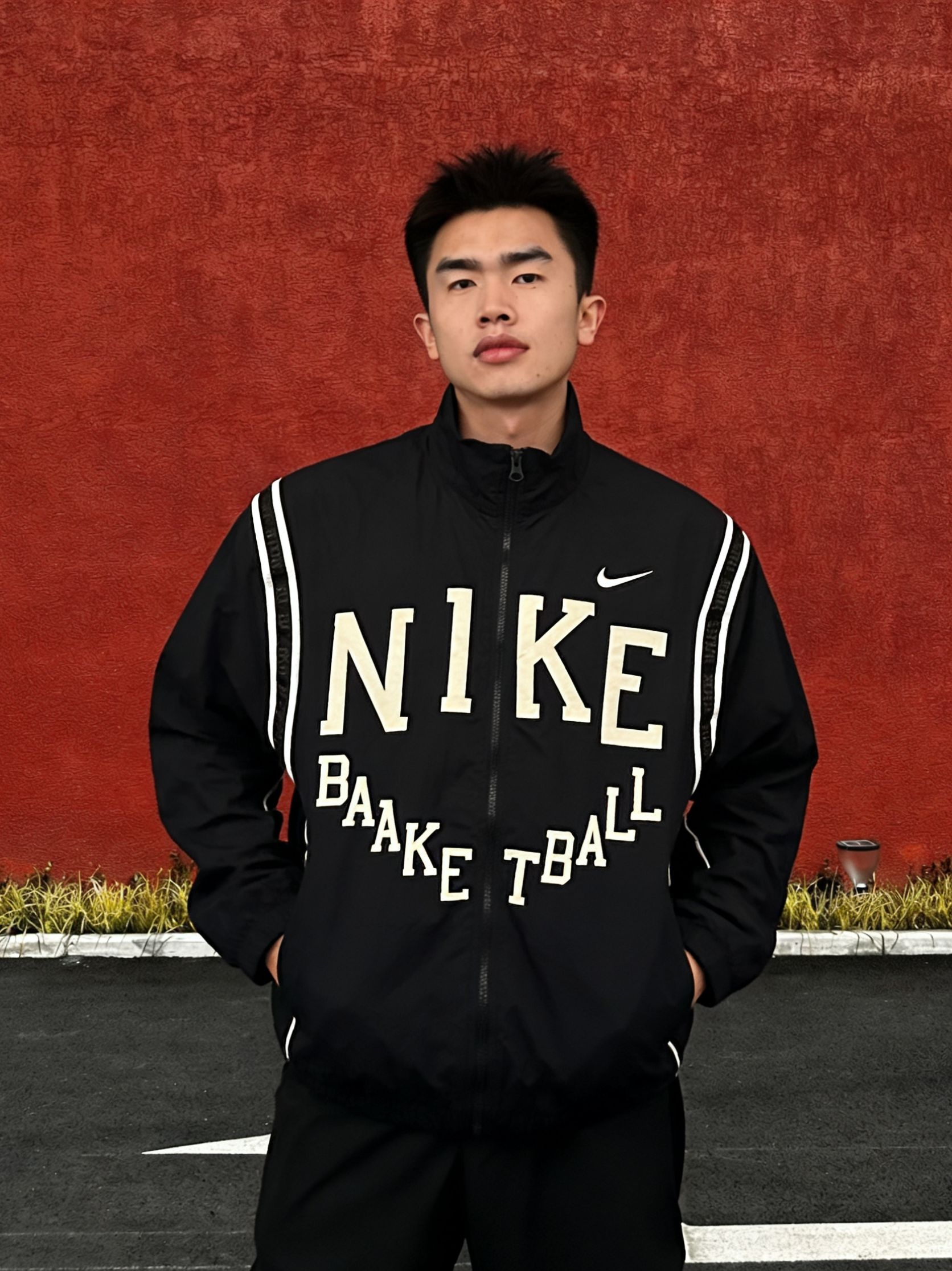 红墙背景下,这件Nike复古运动夹克的质感直接拉满。黑色轻薄面料自带垂坠感,胸前的大字母印花辨识度拉满,侧边的白色条纹在沉稳中透着少年气,美式运动氛围瞬间拿捏。 宽松的版型对183cm的身高格外友好,利落不拖沓,搭配黑色直筒裤,纵向线条被无限拉长,气场直接拉满。不管是返校通勤还是街头出片,这套All Black加字母点缀的穿搭,都能轻松兼顾辨识度与高级感,早春氛围感直接拉满。