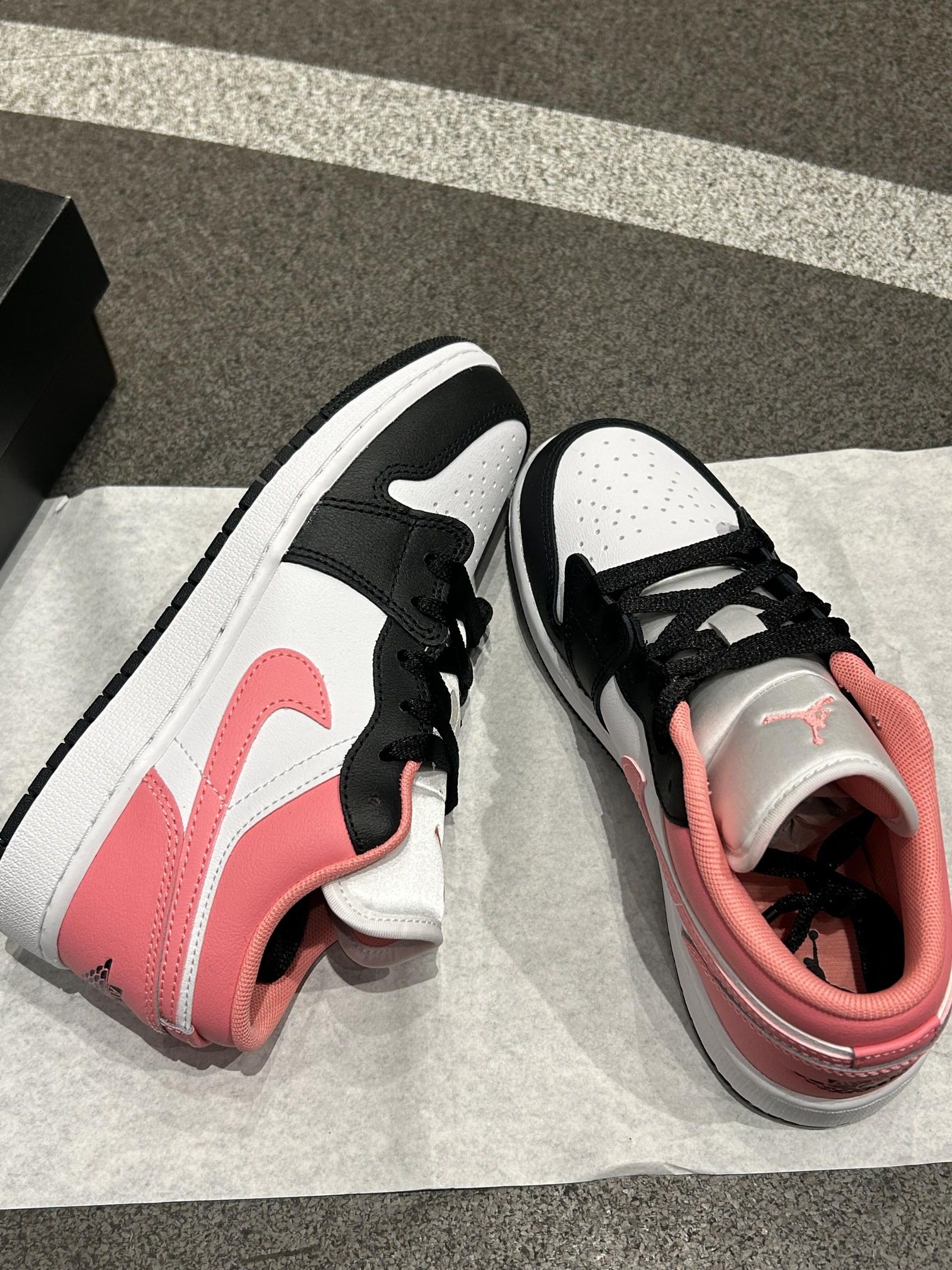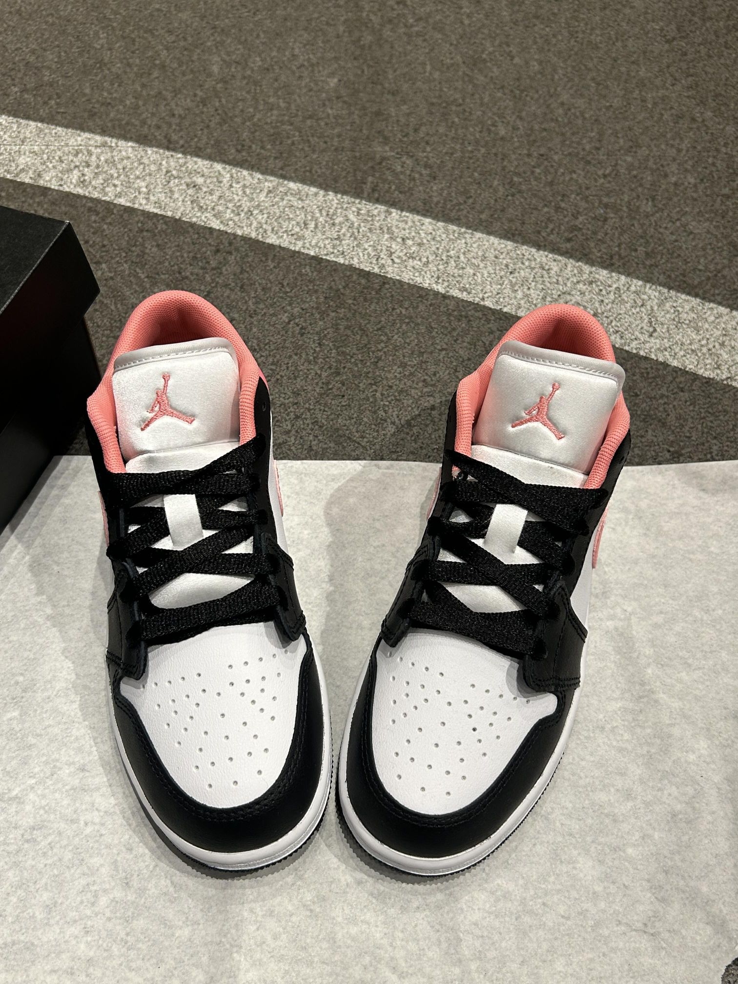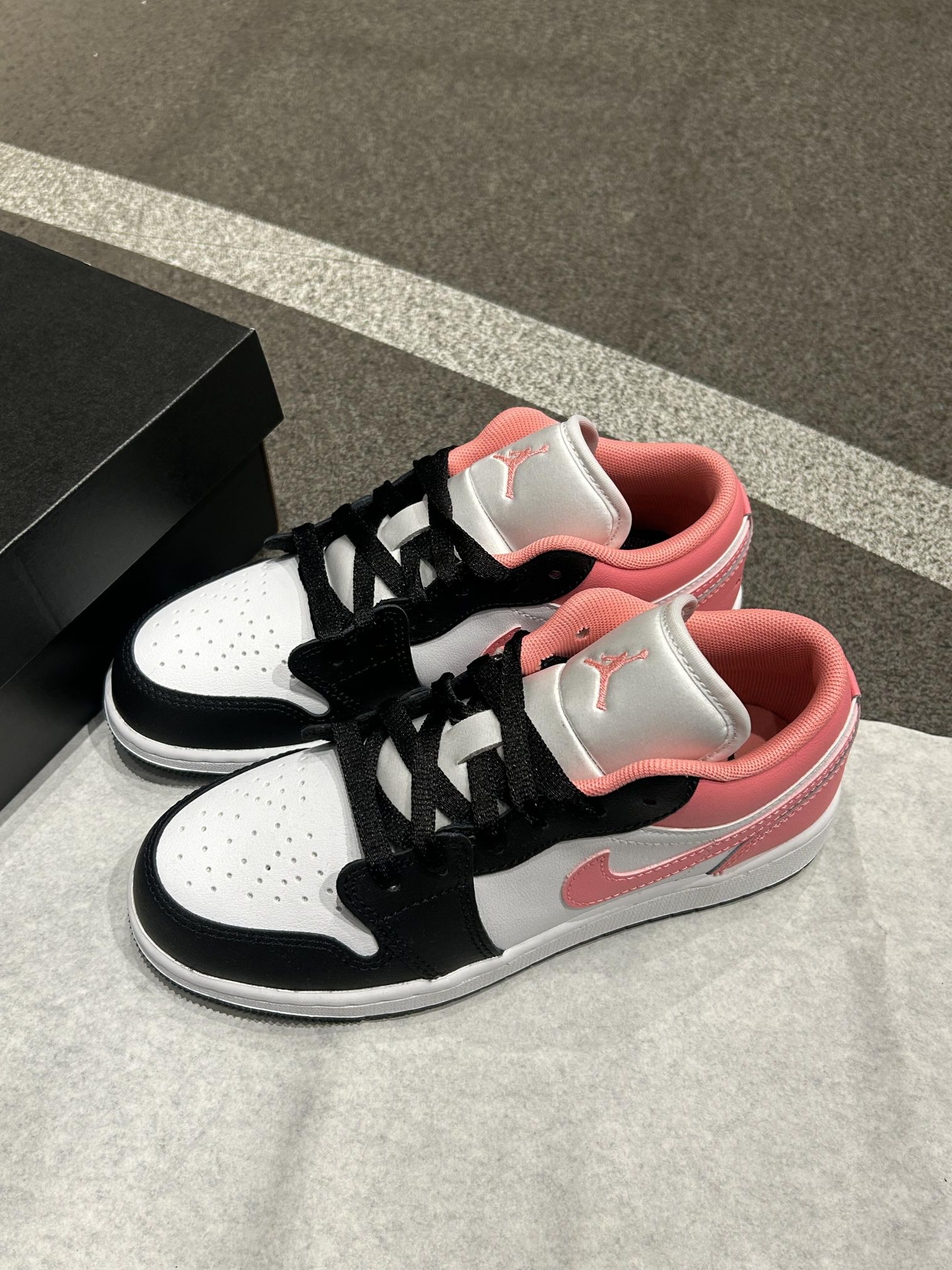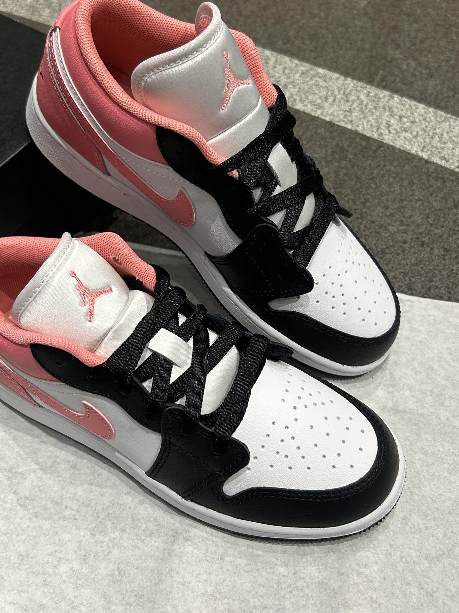 谁能拒绝黑粉👓撞色的AJ1啊! 黑白鞋身搭蜜桃粉🎈勾子和鞋帮, 甜酷感直接拉满,上脚巨显脚小~ 低帮设计日常穿超舒服,走路逛街都不累脚, 搭配牛仔裤、运动裤都贼百搭, 春夏穿这个配色真的太吸睛啦✨
