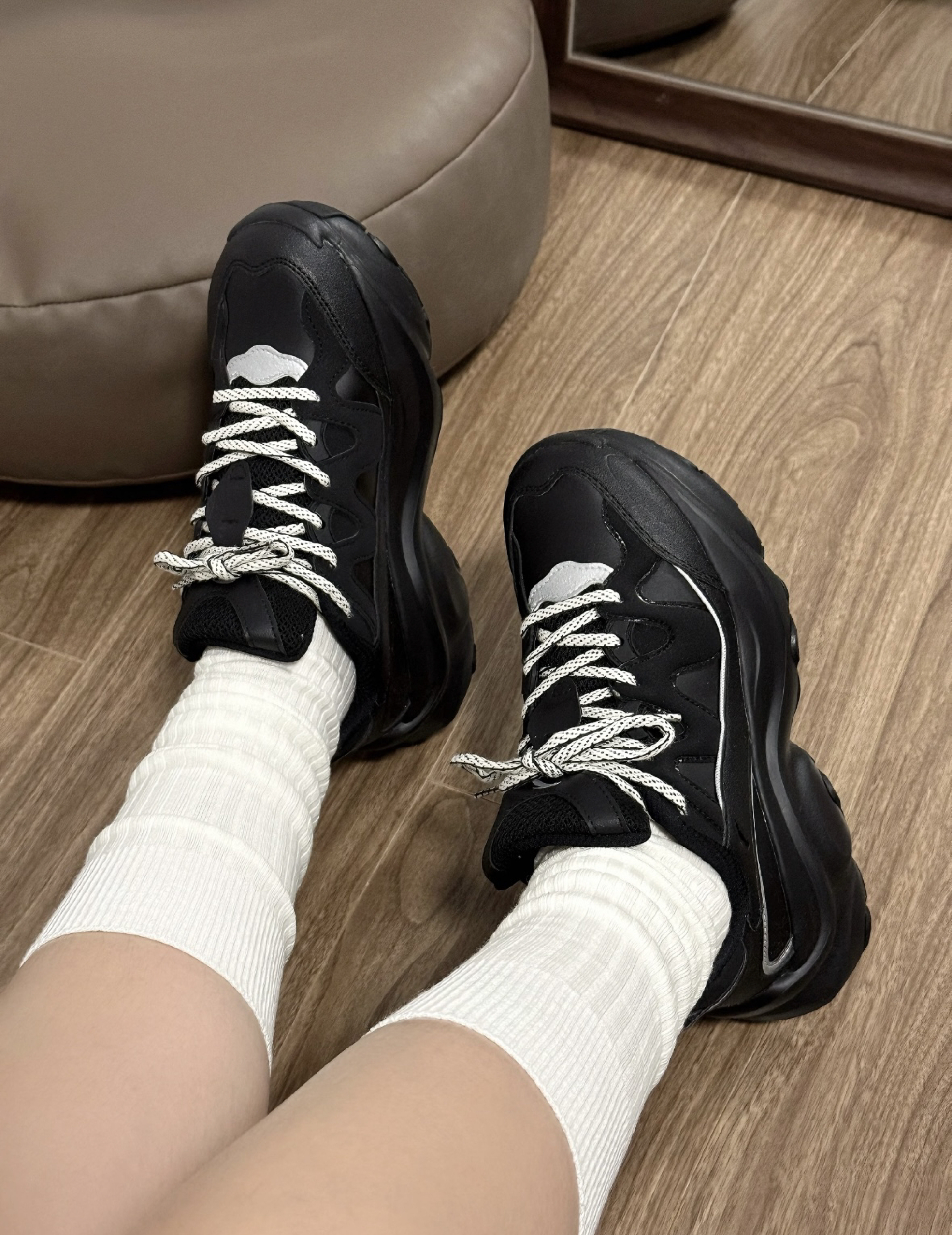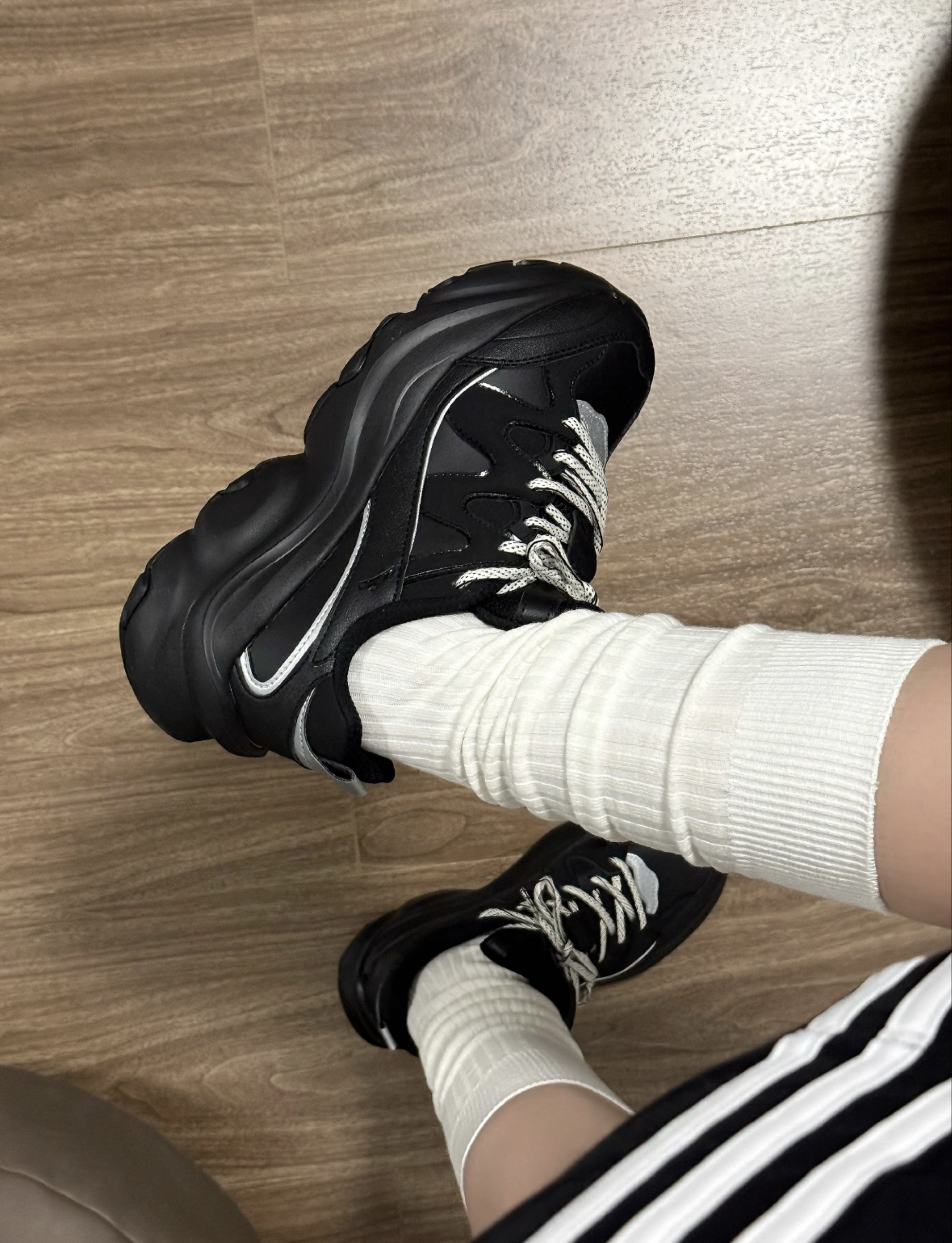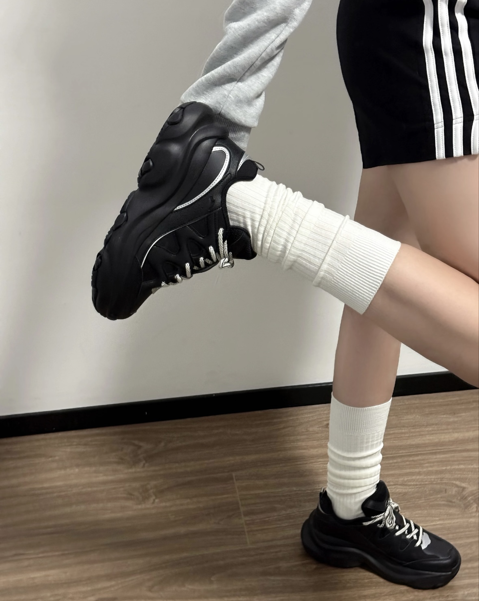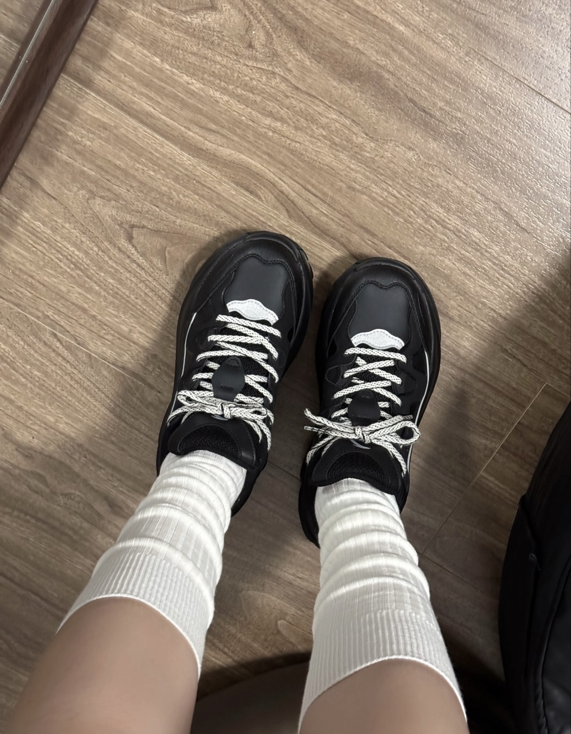 • 颜值细节:鞋身的流线型设计和银色反光条,在光线下超有质感;厚底的凹凸纹路,既有辨识度又能悄悄增高,视觉上直接把腿拉长5cm。 • 上脚体验:鞋底软弹,走路完全不磨脚,厚底设计还能缓冲减震,久穿不累。鞋型包裹性很好,显得脚踝很细,对脚宽的姐妹也很友好。 • 搭配性:我搭了白色堆堆袜和运动风下装,又酷又有层次感。配工装裤、牛仔裙、辣妹裙也超合适,甜酷、机能、休闲风都能hold住,属于“闭眼搭都...