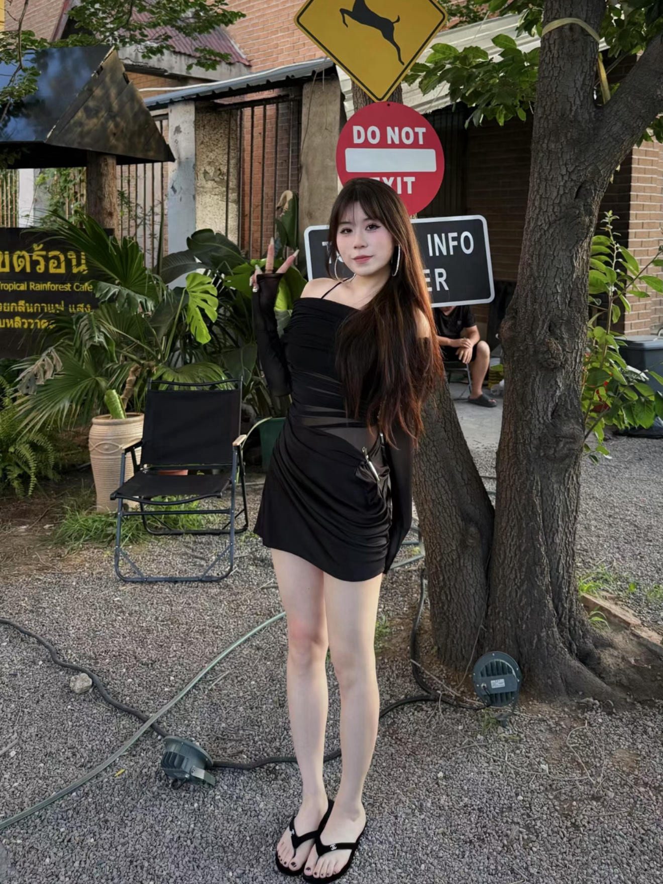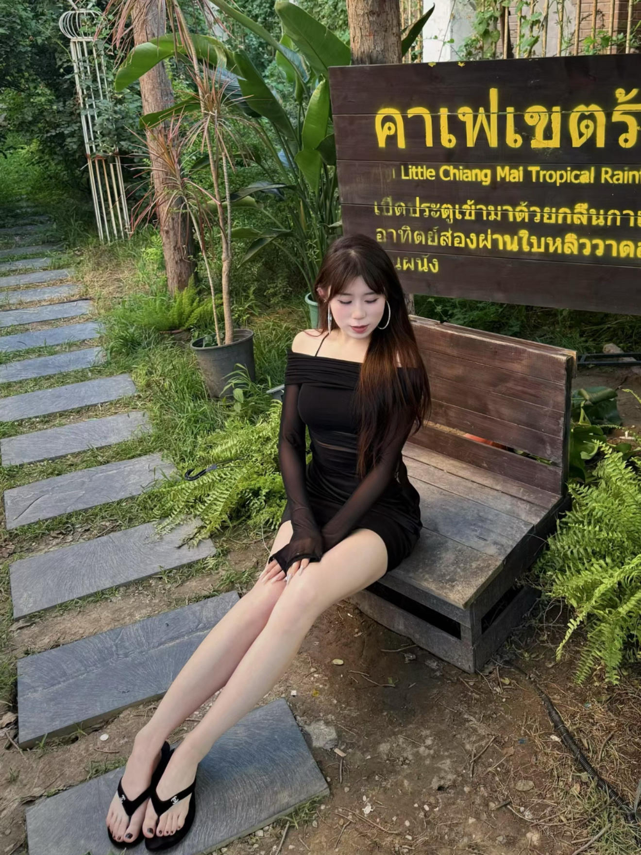 黑色的修身连衣裙 上面的网纱袖很有设计感 露肤的地方也刚好 配一双简约的人字拖 一下子就把精致感变得慵懒起来 走在路上随便摆个姿势 都能拍出满满的度假氛围感~ 中和了裙子的精致感 跟泰式街头的随性劲儿特别搭 懒懒散散的又很妩媚 随便拍都出片