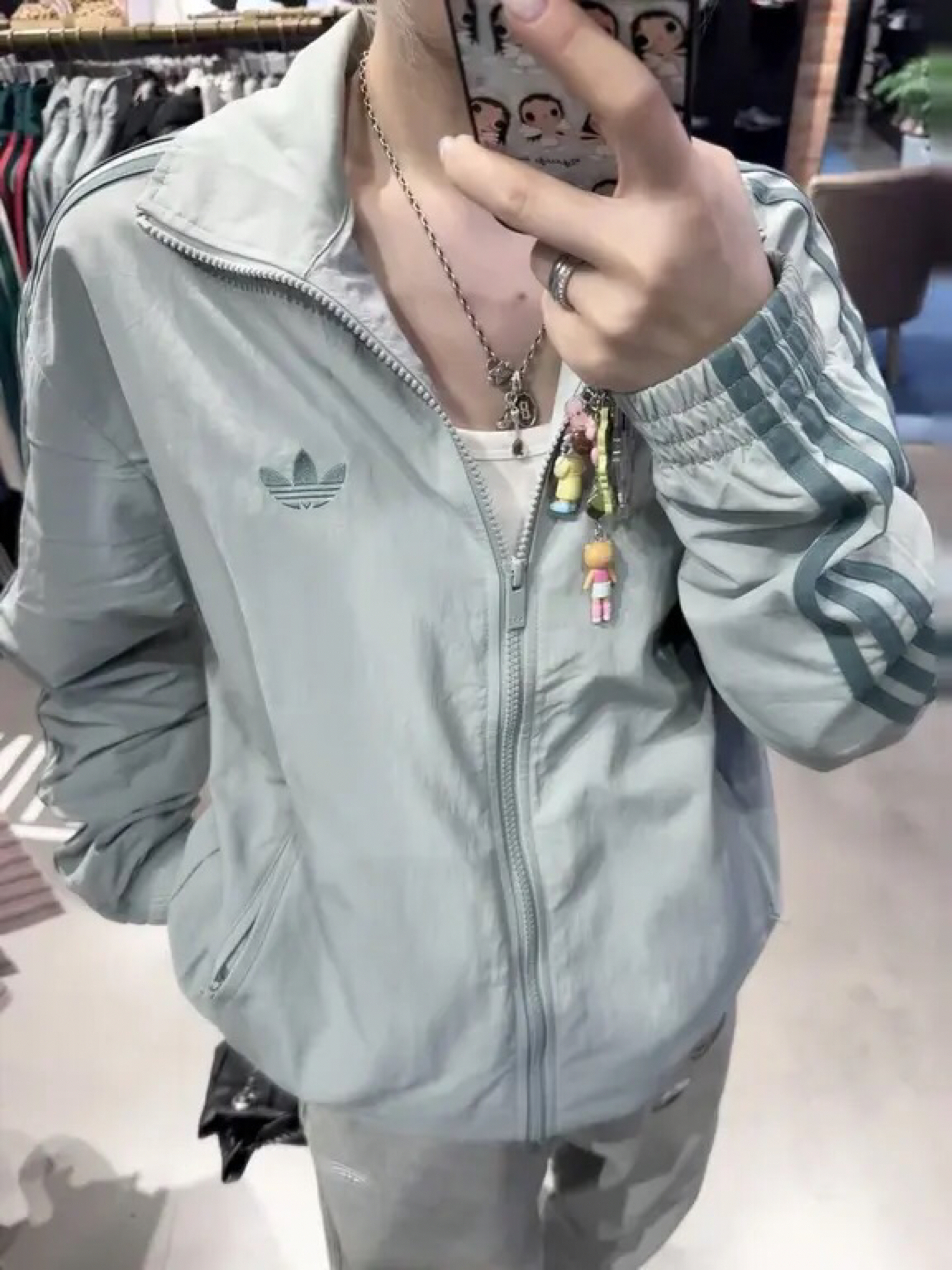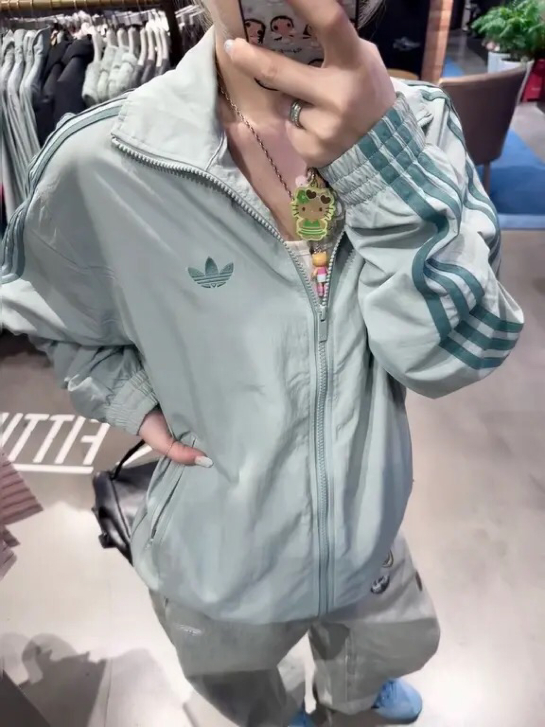 别再只看颜值了!这件三叶草夹克才是真正的“百搭神器”👇 ✅ 复古感:经典三条杠+立领设计,一秒回到90年代运动风 ✅ 轻薄透气:尼龙面料,春天穿不闷汗,夏天还能当防晒衣 ✅ 版型友好:宽松落肩剪裁,藏肉显瘦,对各种身材都包容 ✅ 搭配无压力:浅蓝+深绿撞色,搭白T、牛仔裤、百褶裙都好看 一衣搞定校园、通勤、出街,性价比直接拉满!