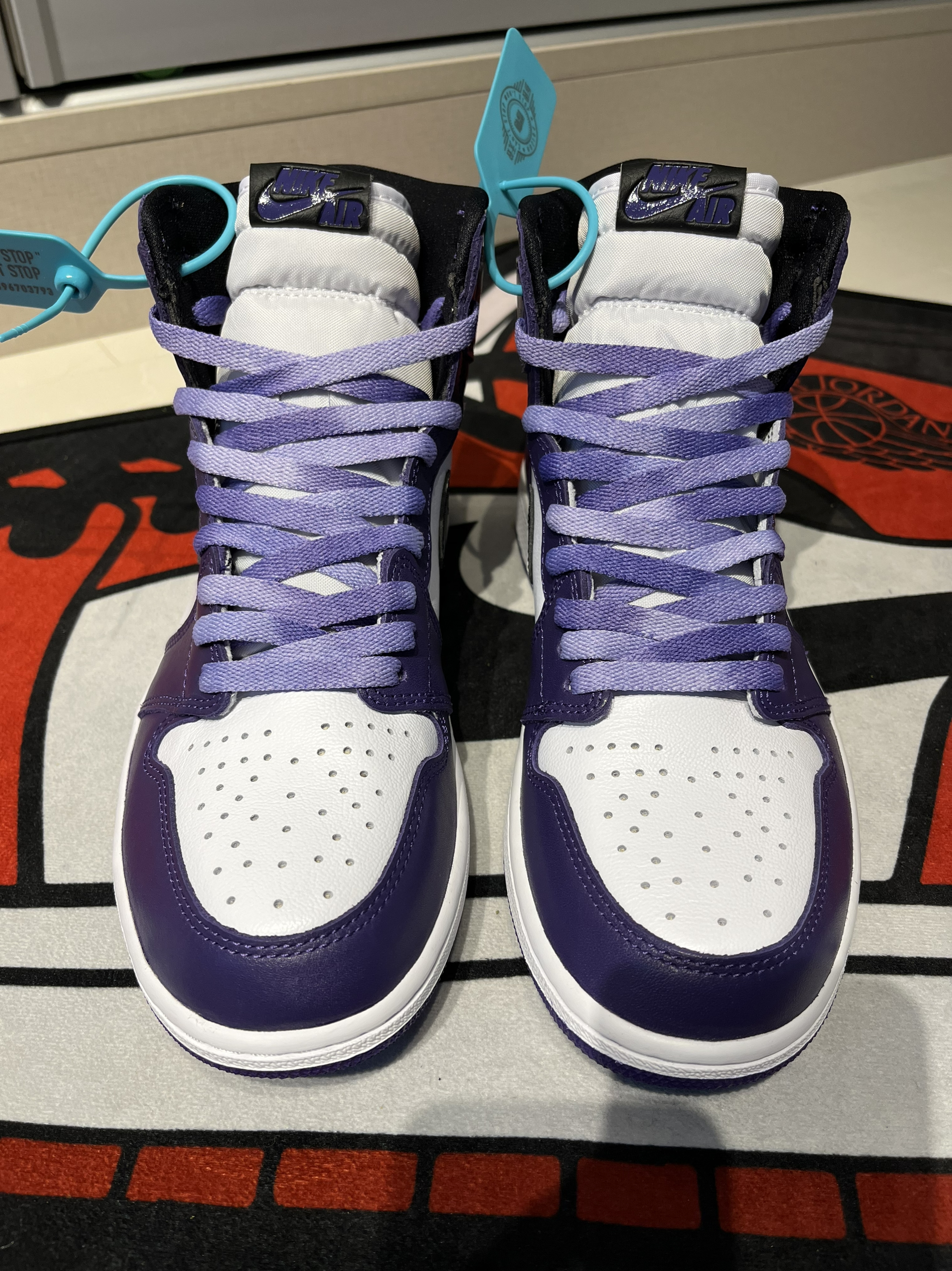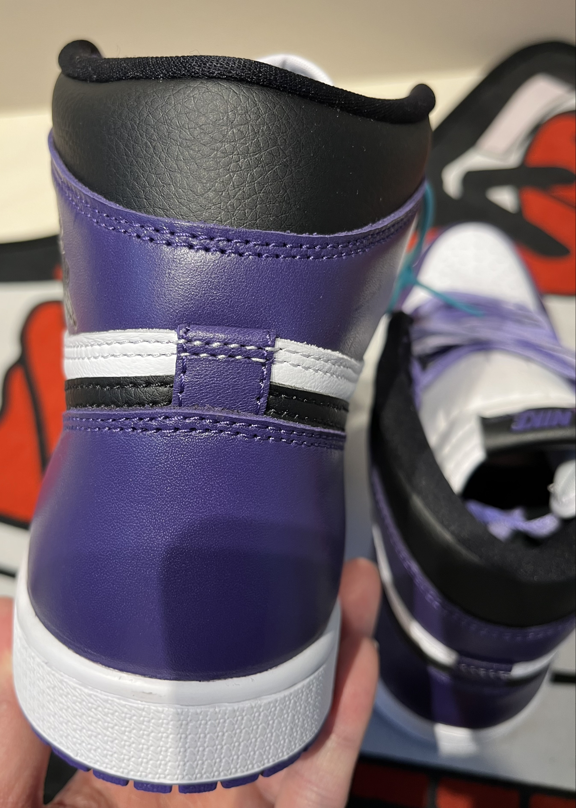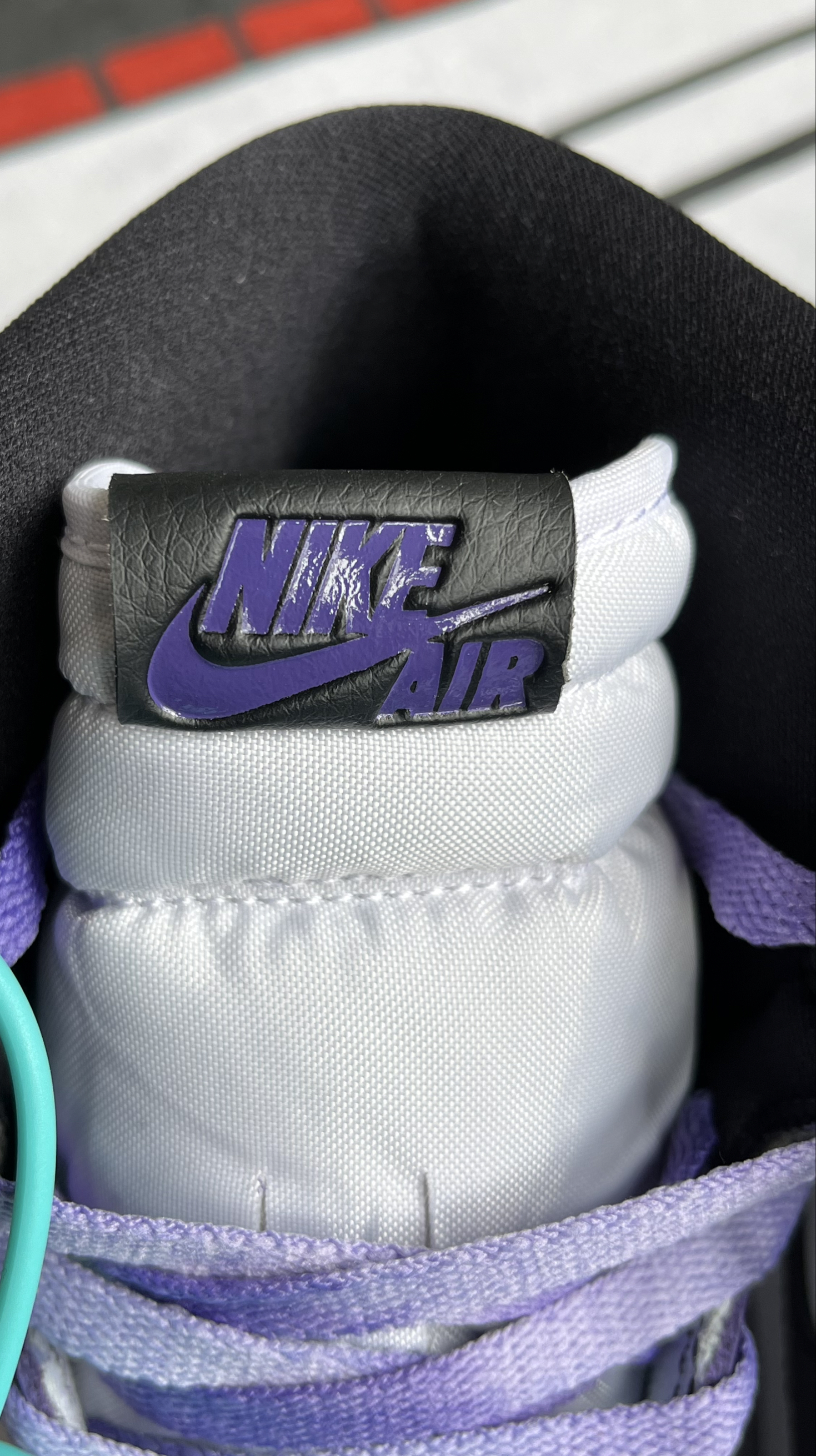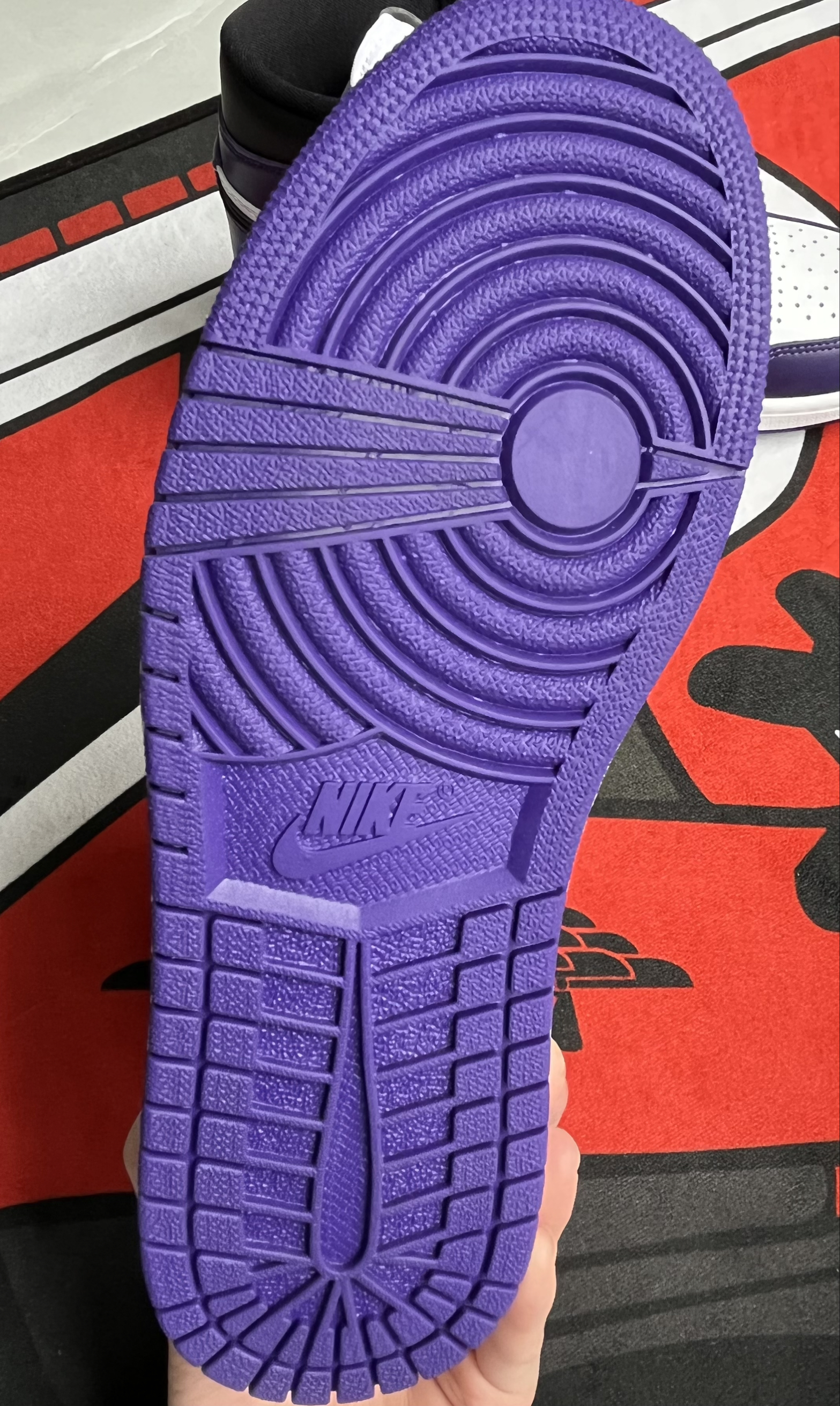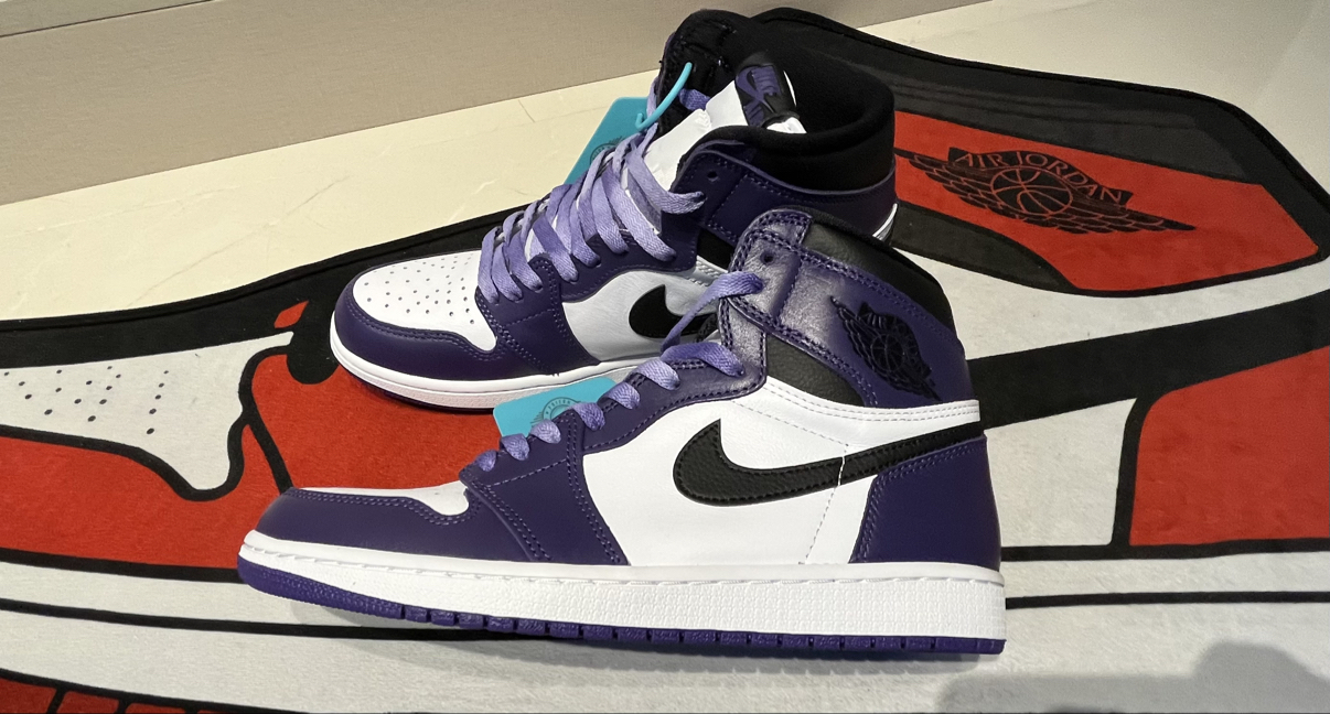 这个配色个人觉得最适合新年穿,紫气东来!黑白紫搭配低调又耐看,这种皮质也容易打理,不过AJ1的鞋脚感偏硬都是通病,垫一双小半码鞋垫就完美解决!强烈种草