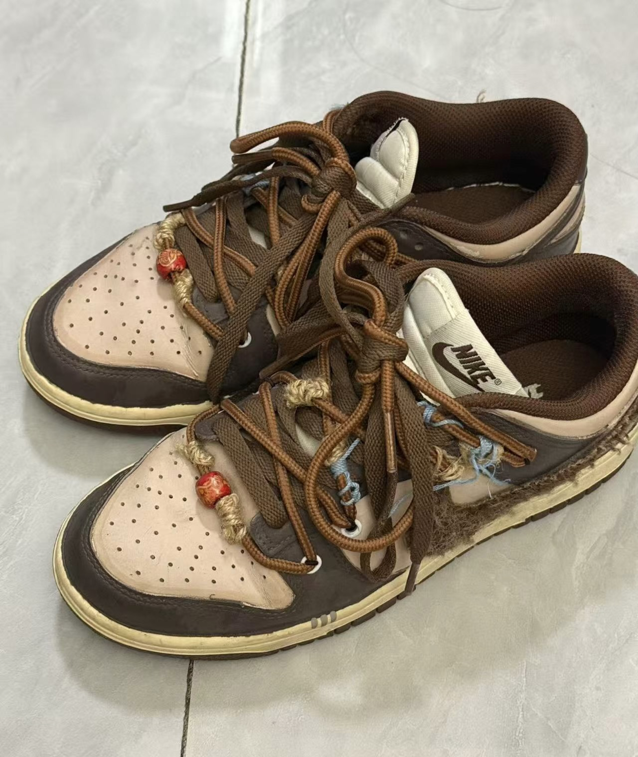 这双经典Nike Dunk街头风定制鞋也太好看了吧,棕色的配色特别适合秋冬,搭配牛仔裤休闲裤都很好看,做旧设计创作感十足,是谁还没有拥有