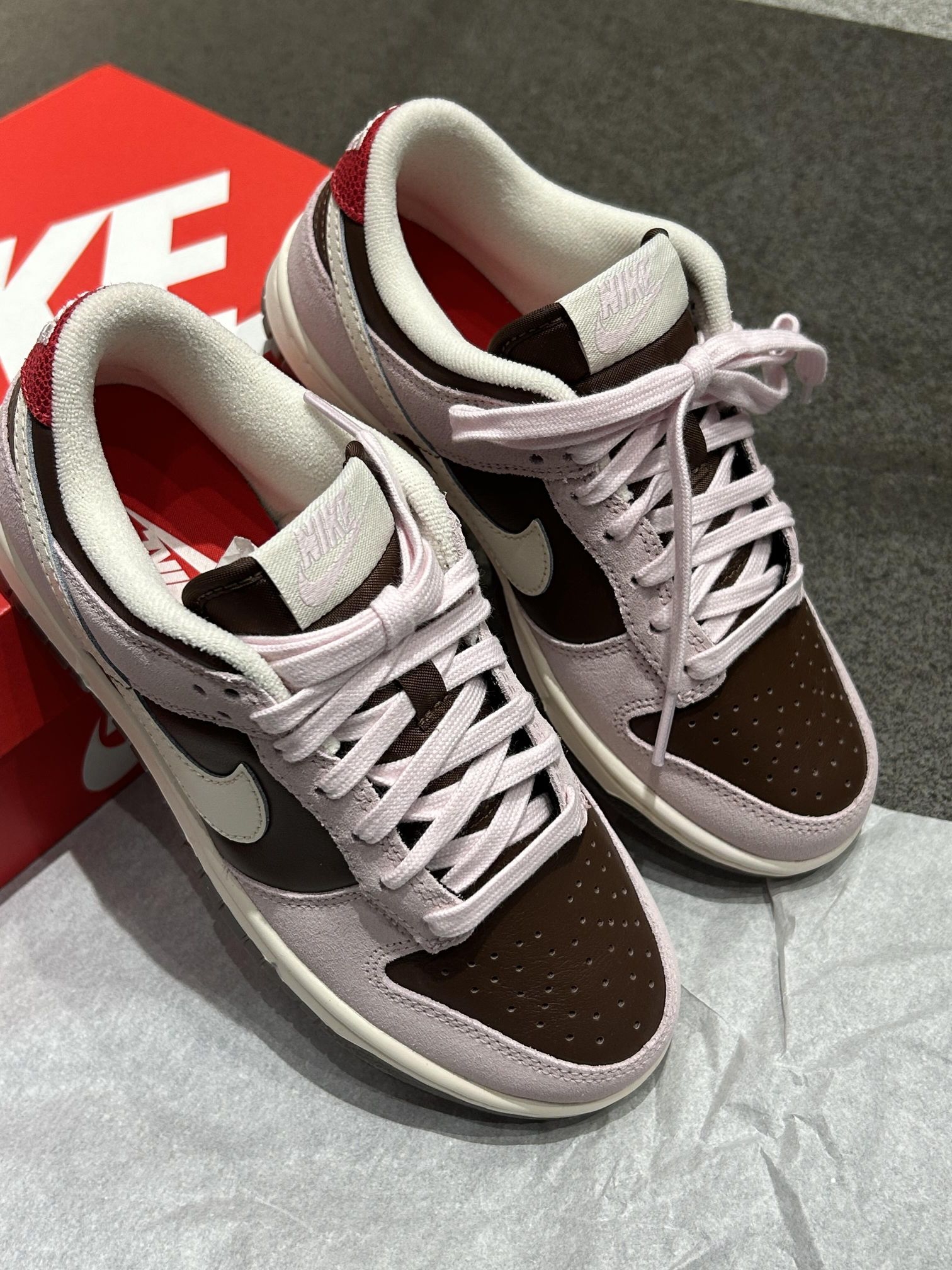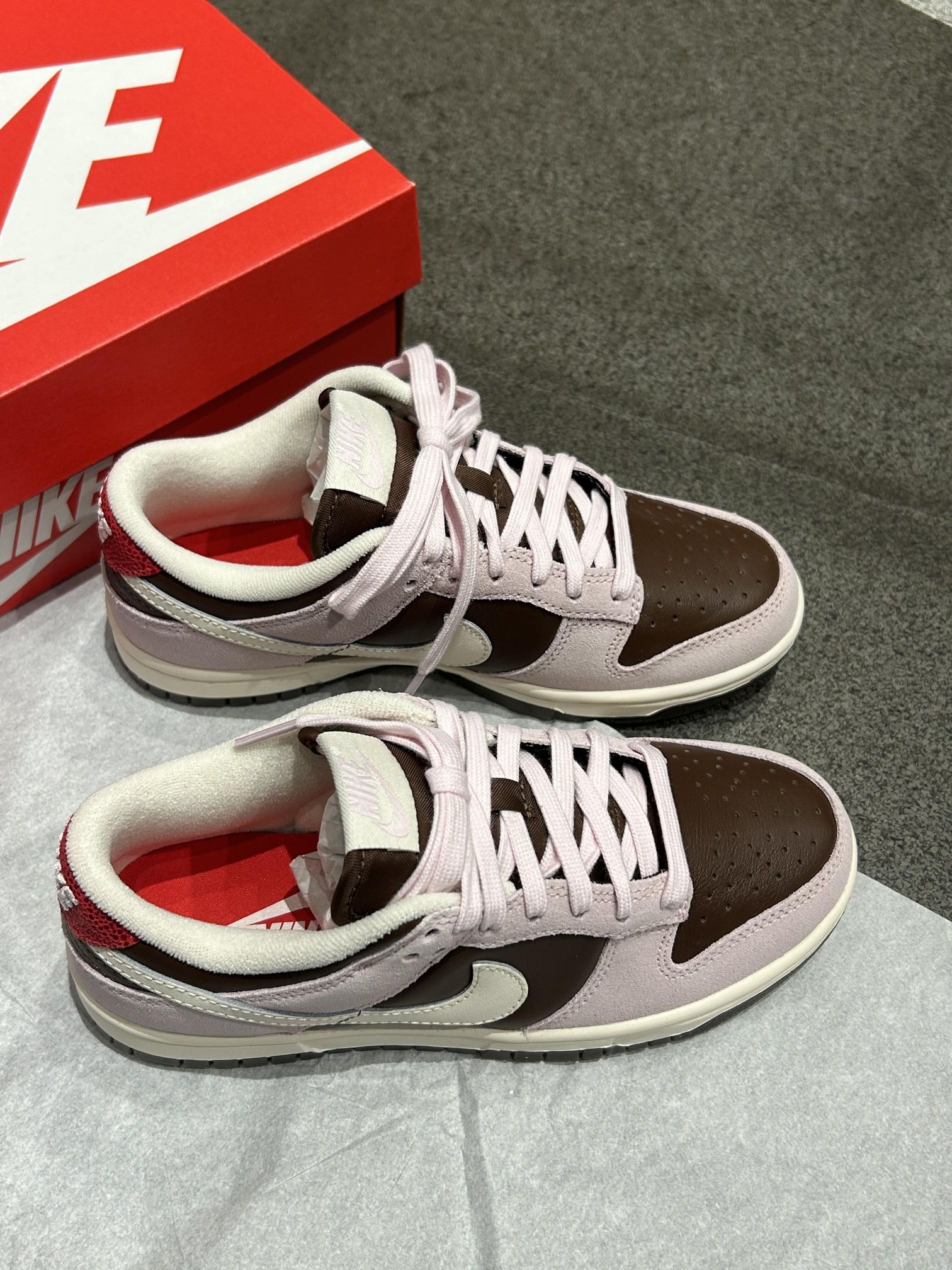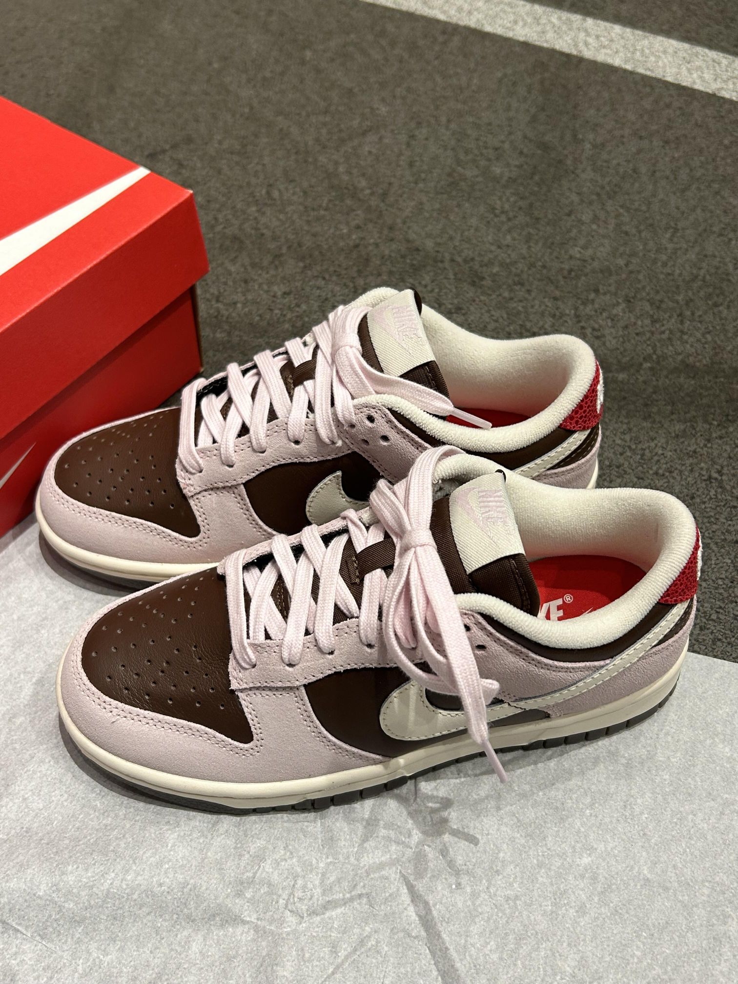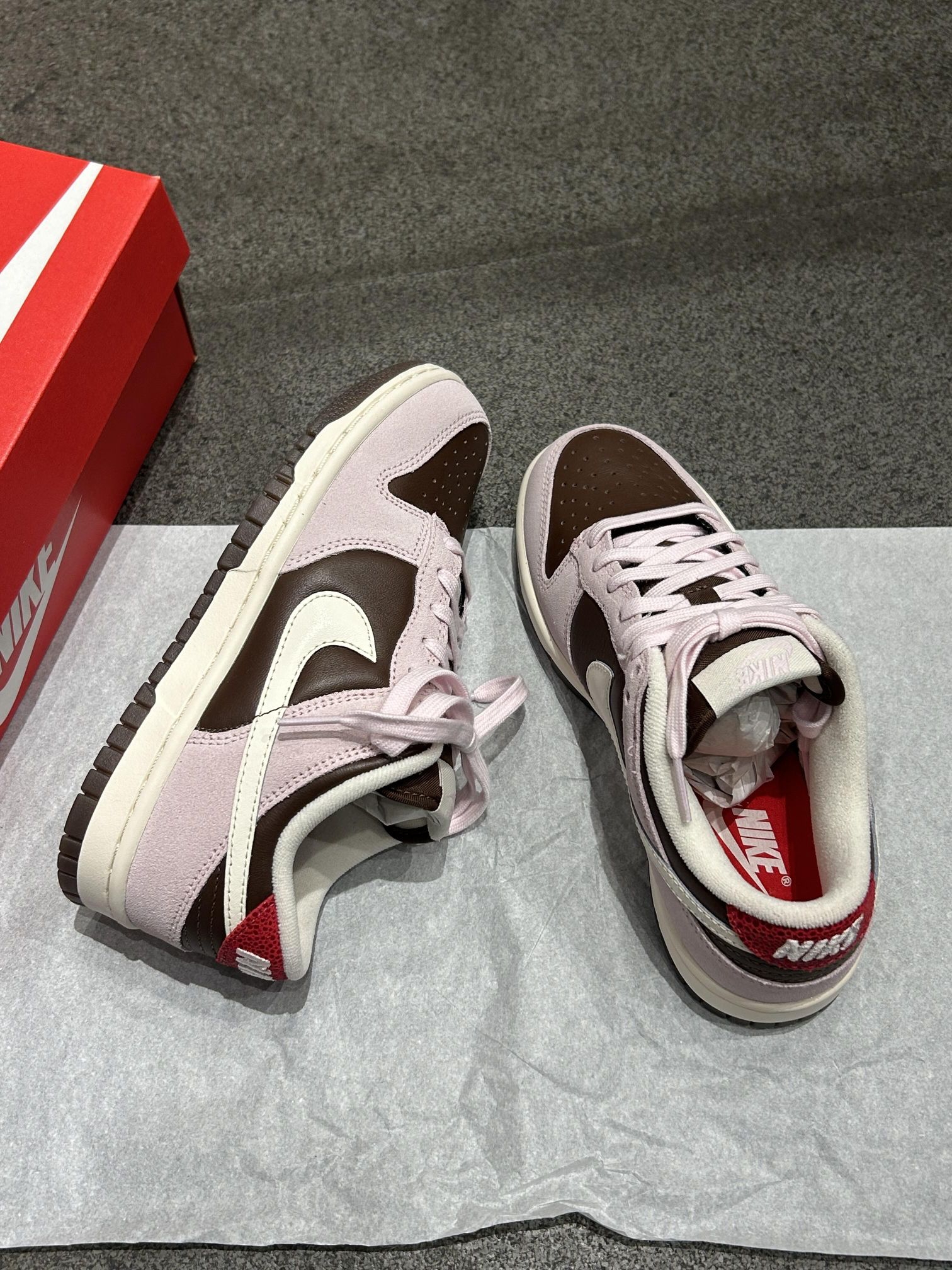 Nike|复古红棕色老爹鞋||谁能拒绝一双自带甜品氛围感的Dunk啊!🍫🍦 这双Neapolitan配色真的把那不勒斯冰淇淋穿在脚上了,浅粉麂皮拼深棕皮革,奶fufu的米白Swoosh做点缀,鞋里的红底还藏了小惊喜,细节控直接爱住!