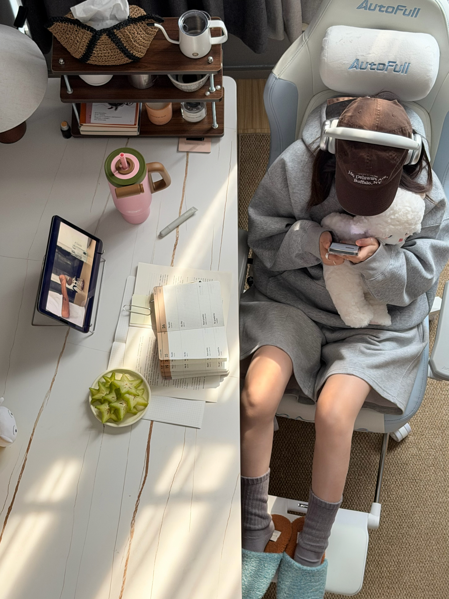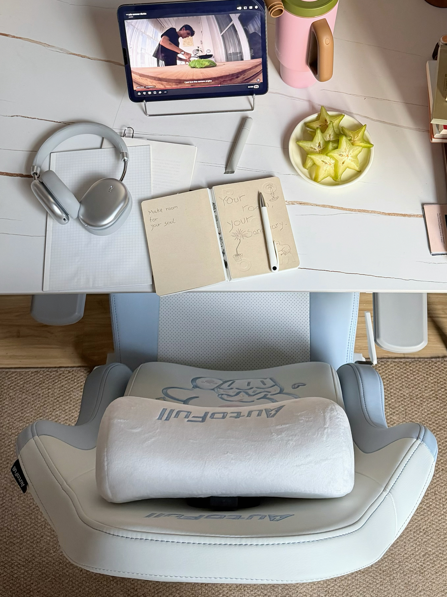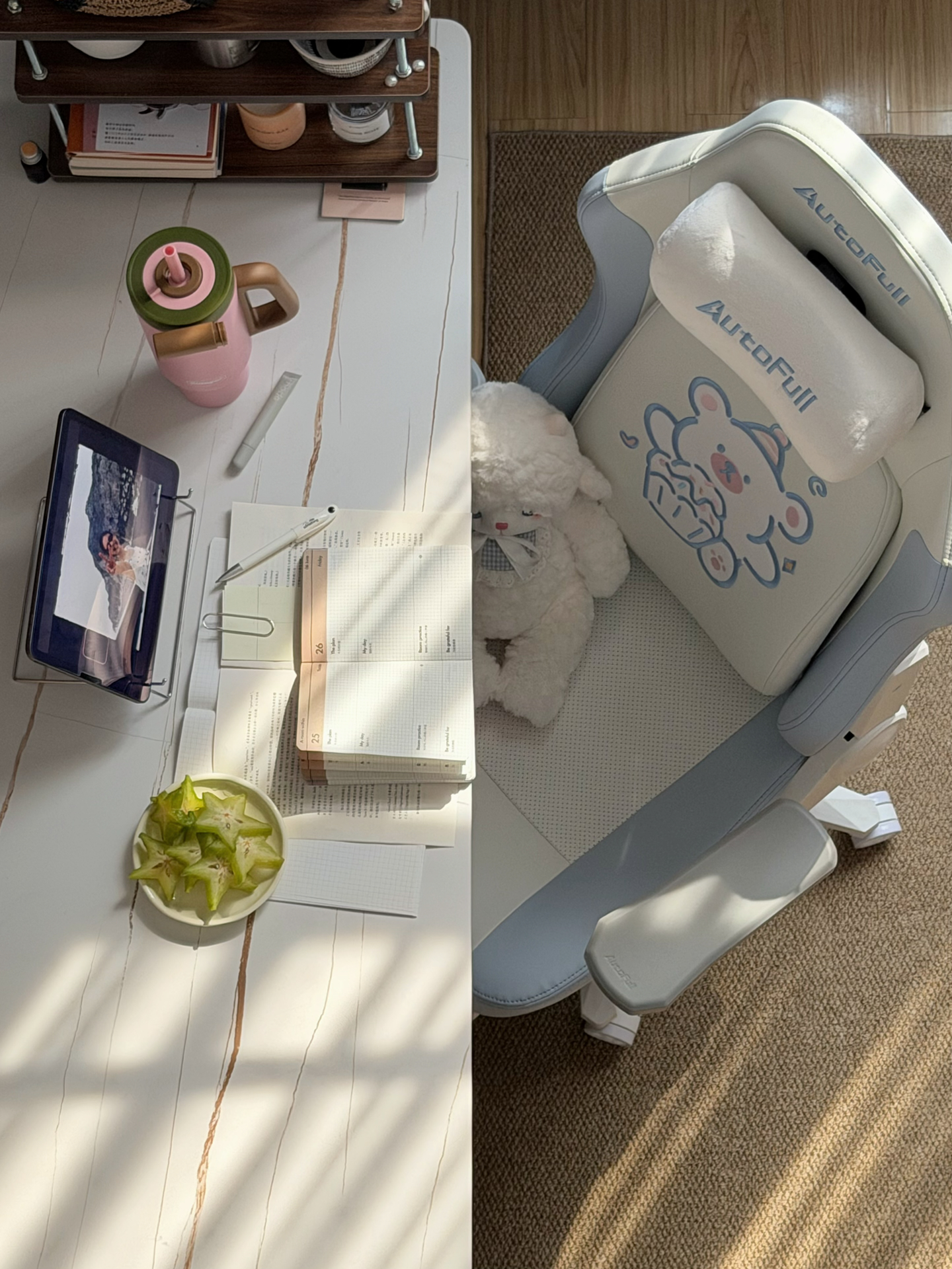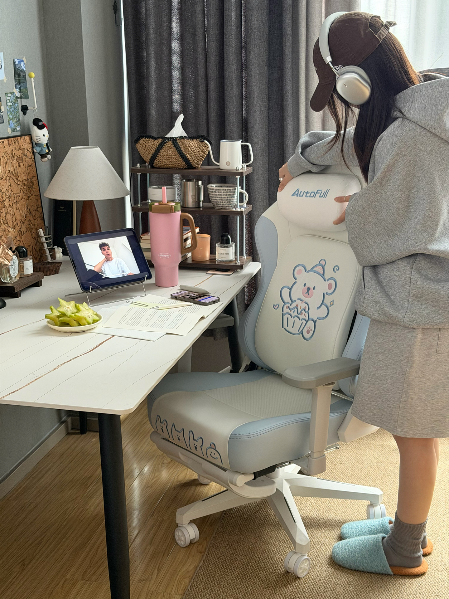 放假前想给书桌换把舒服椅子,被这蓝白配色+小白熊戳中审美~本南方小个子试了后发现,腰托固定还能前后调,颈枕最低档也能托住脖子,皮面坐垫有散热孔夏天不闷~就是价格对学生党不算低,但对久坐的我来说值!