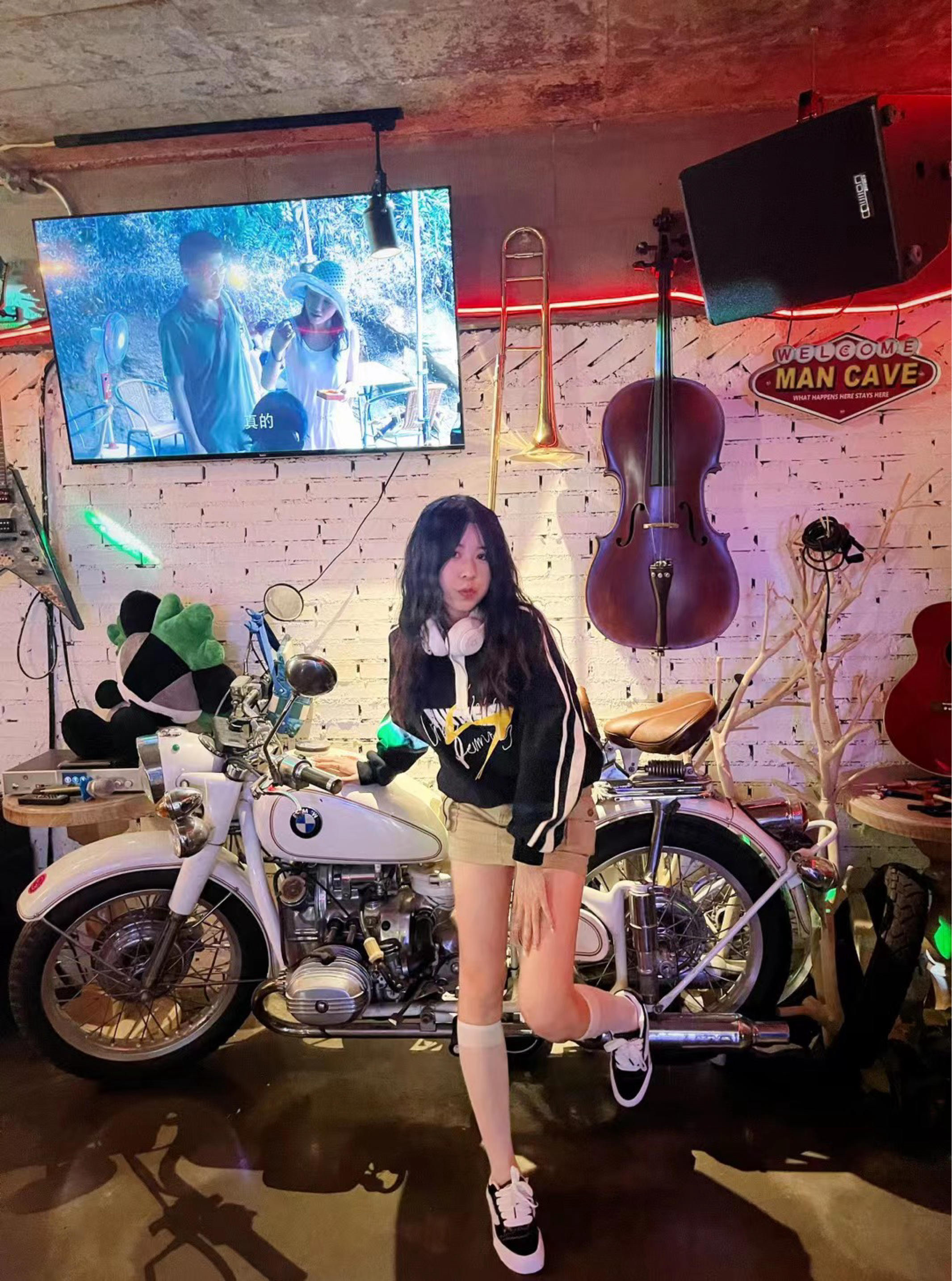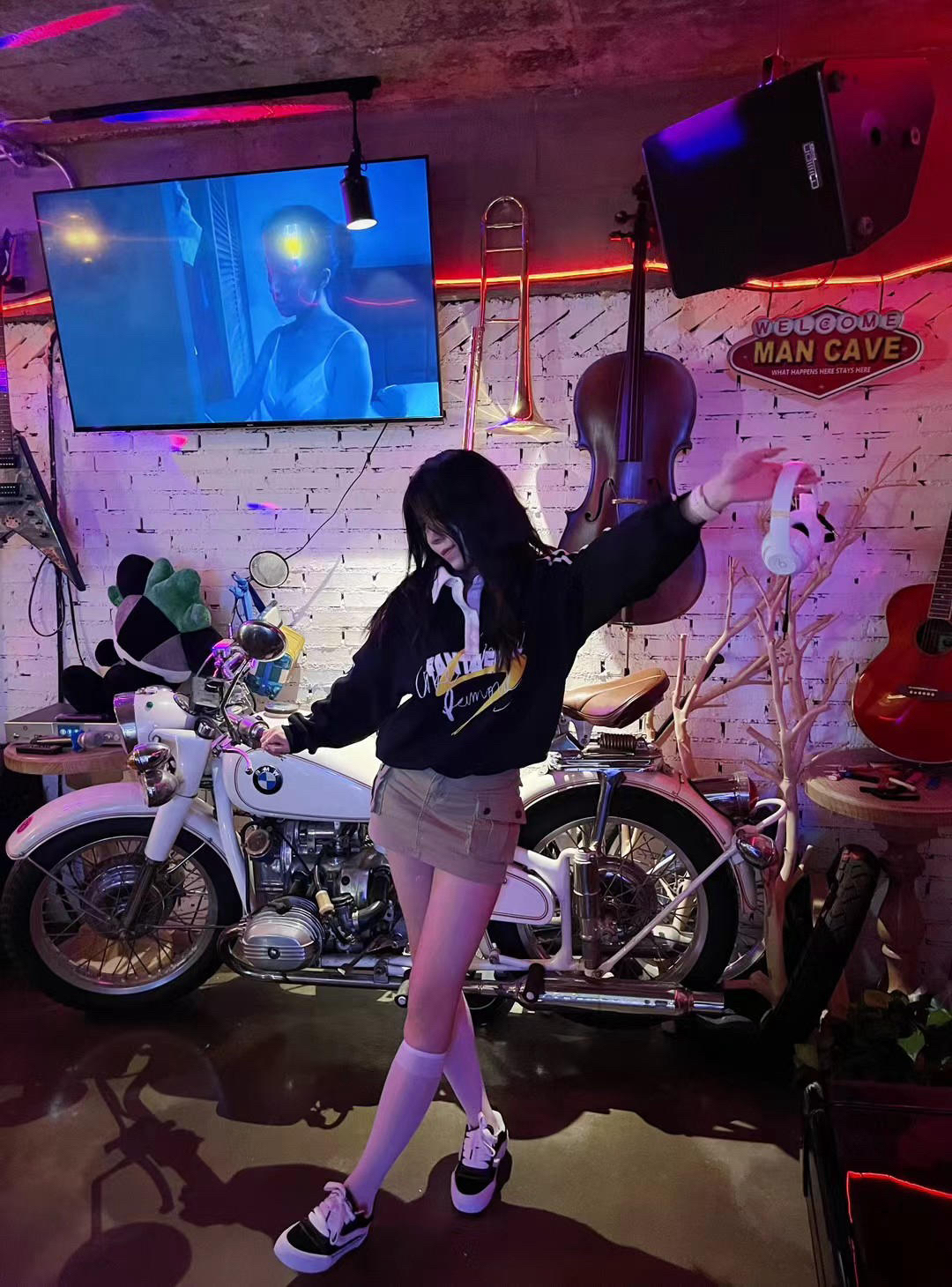 黑色印花卫衣搭配卡其色短裙 甜酷氛围感拉满! 宽松卫衣的慵懒中和了短裙的利落 搭配堆堆袜和万斯板鞋 随性又有街头感 在复古机车风的场景里 这身穿搭和霓虹光影相融 随手拍都是个性满满的大片~