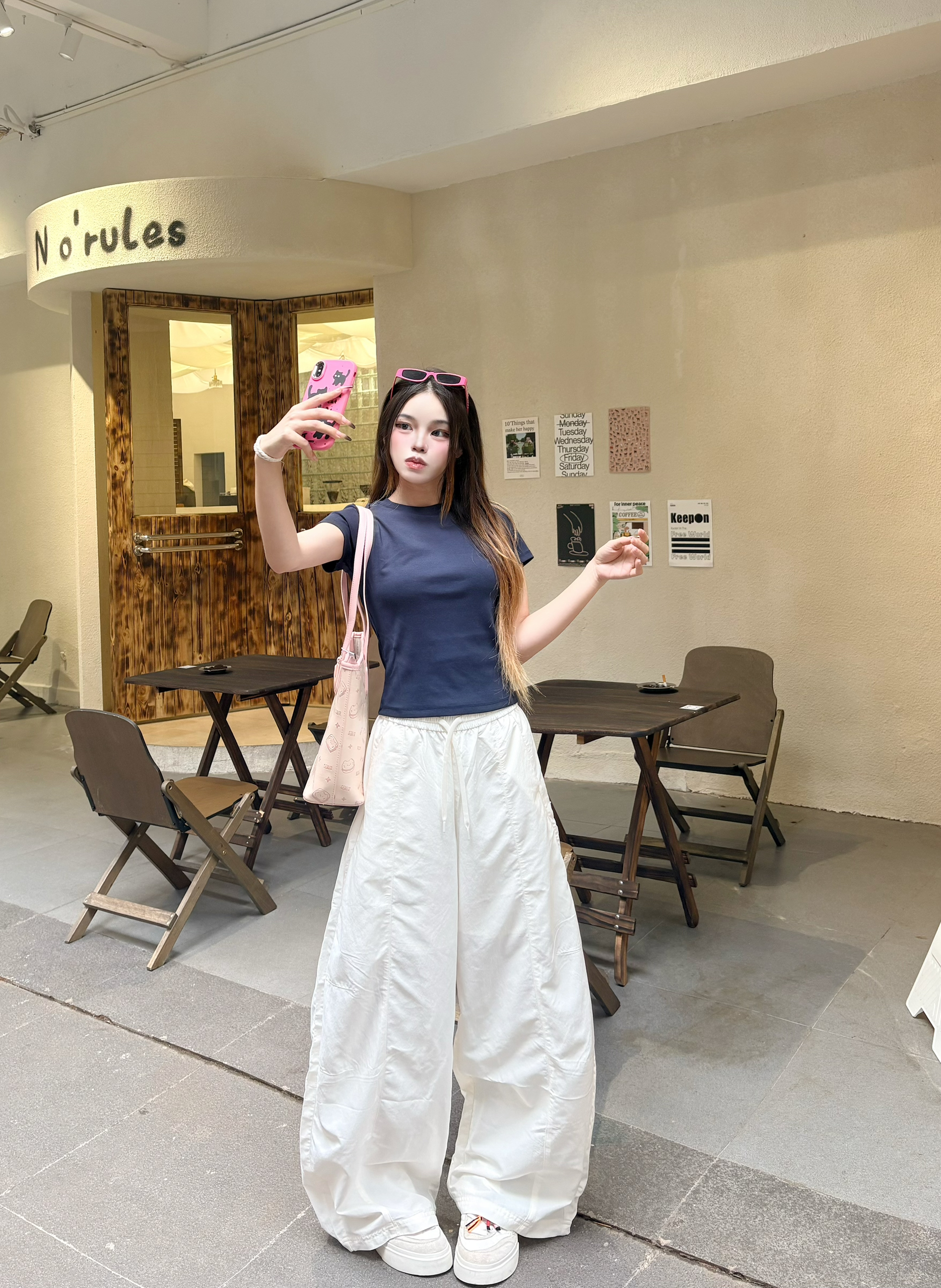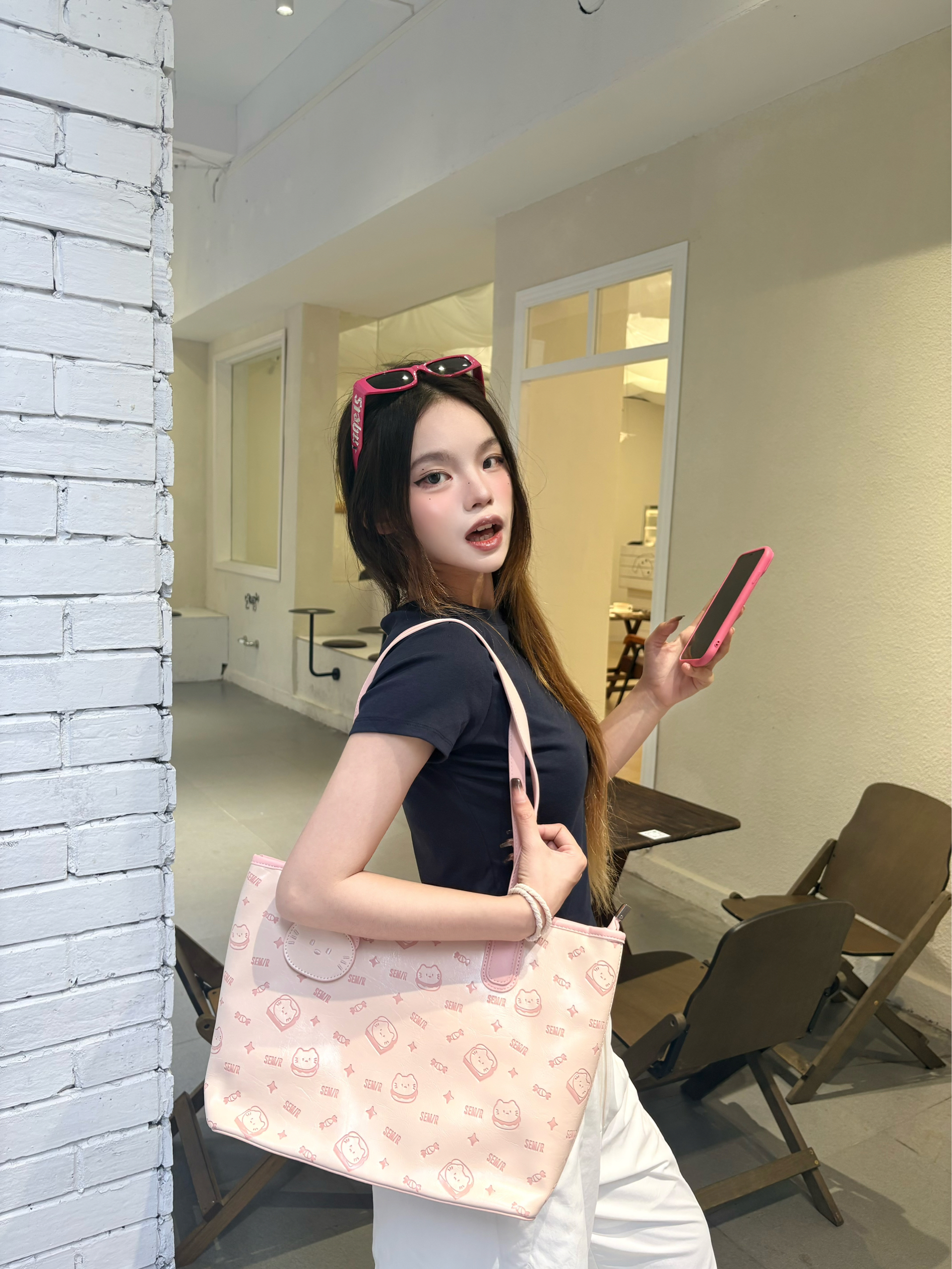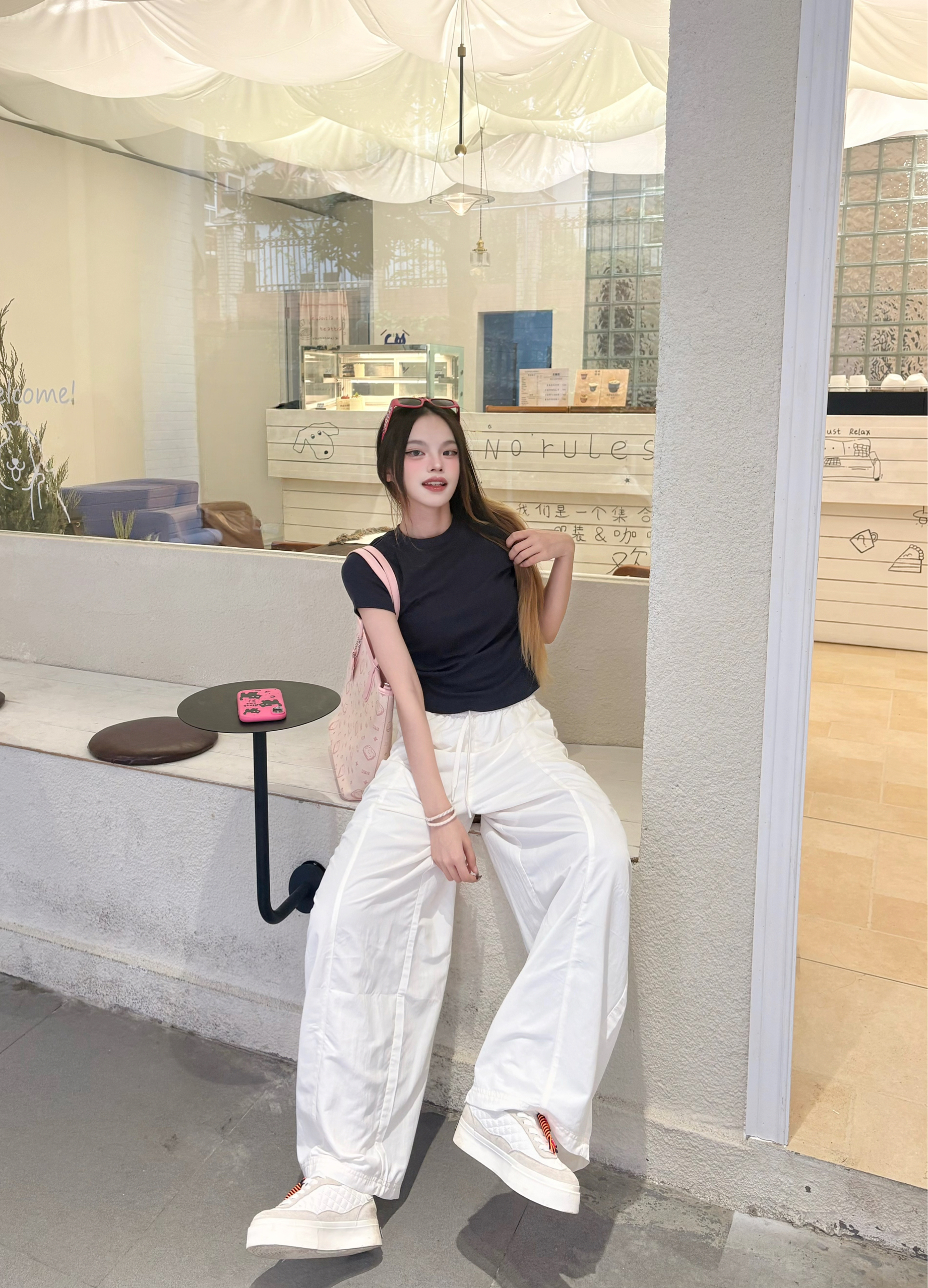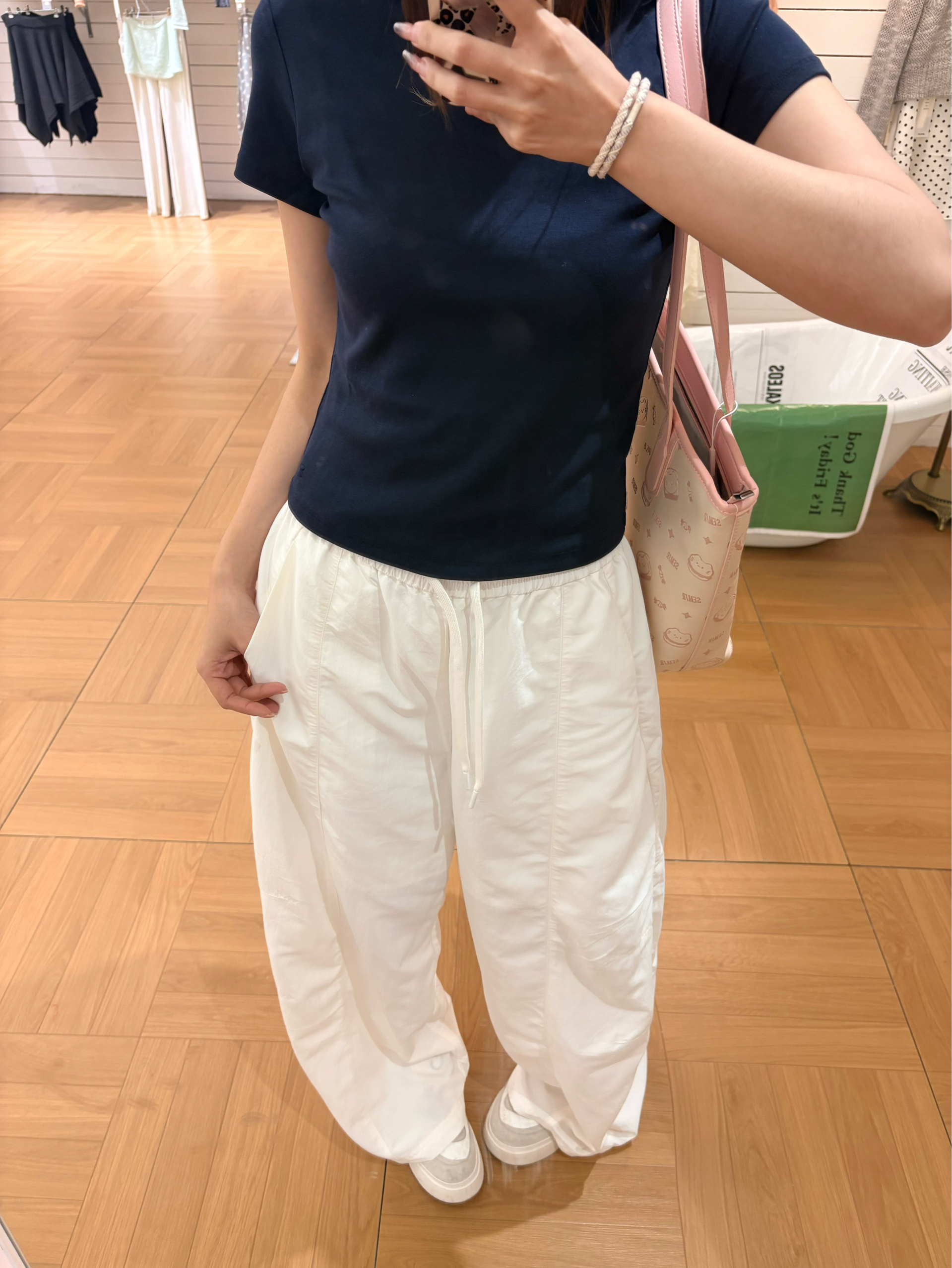 今天这套是我超爱的韩系松弛感思路✨ 我的上衣选了藏青正肩T,利落又显瘦,把身材比例衬得刚刚好。✨ 我下装搭了米白阔腿裤,垂感超绝,走路带风还藏肉,秒变纸片人。✅ 点睛之笔是这个粉粉的托特包,满印的小猫图案软萌又元气,和无彩色的衣装撞出少女感,瞬间点亮整个look。🐈 我165/96 穿的一套是m码🎀