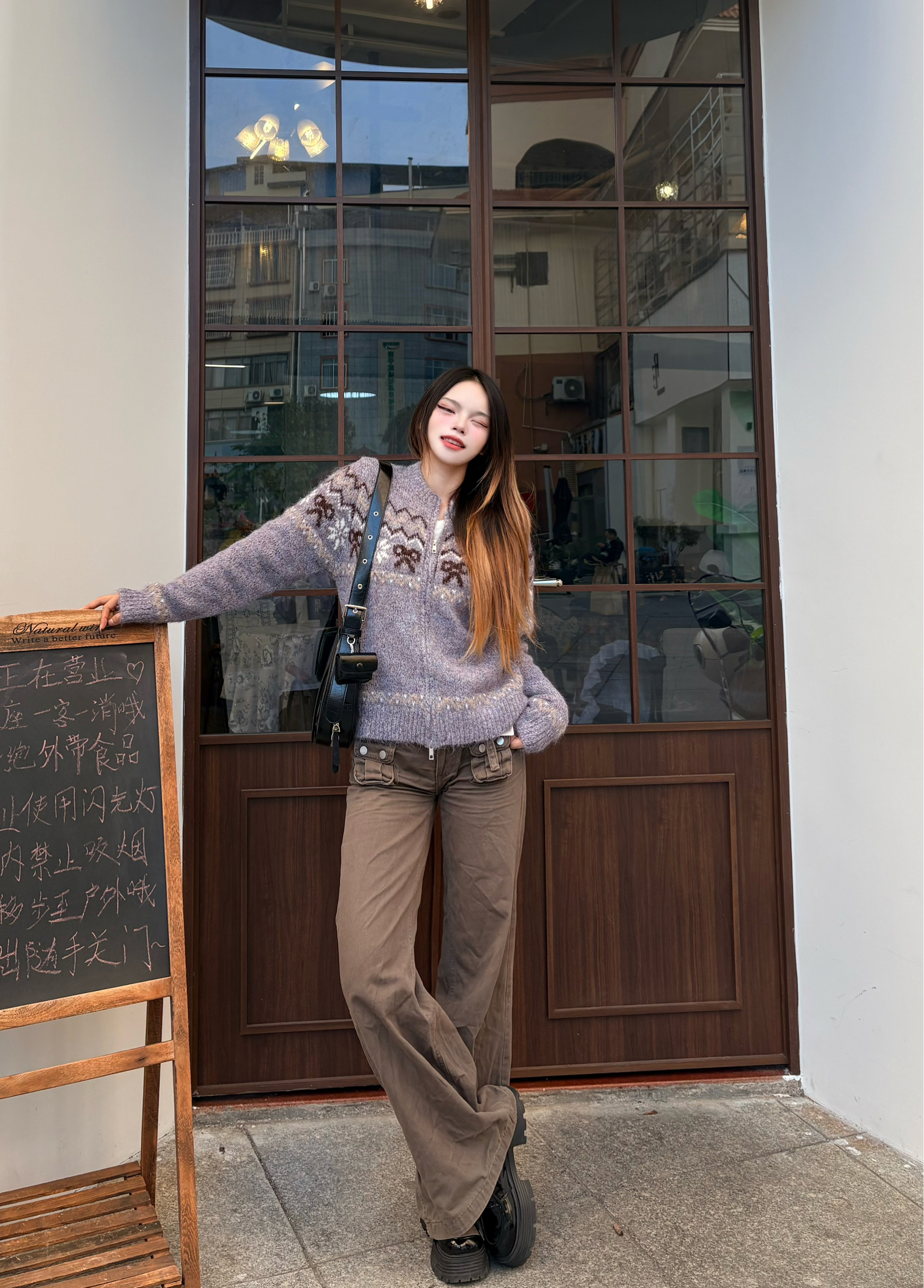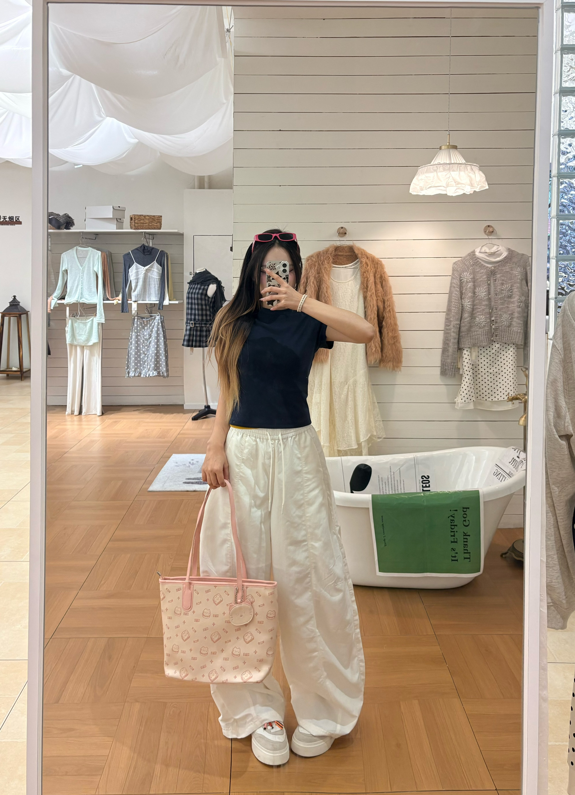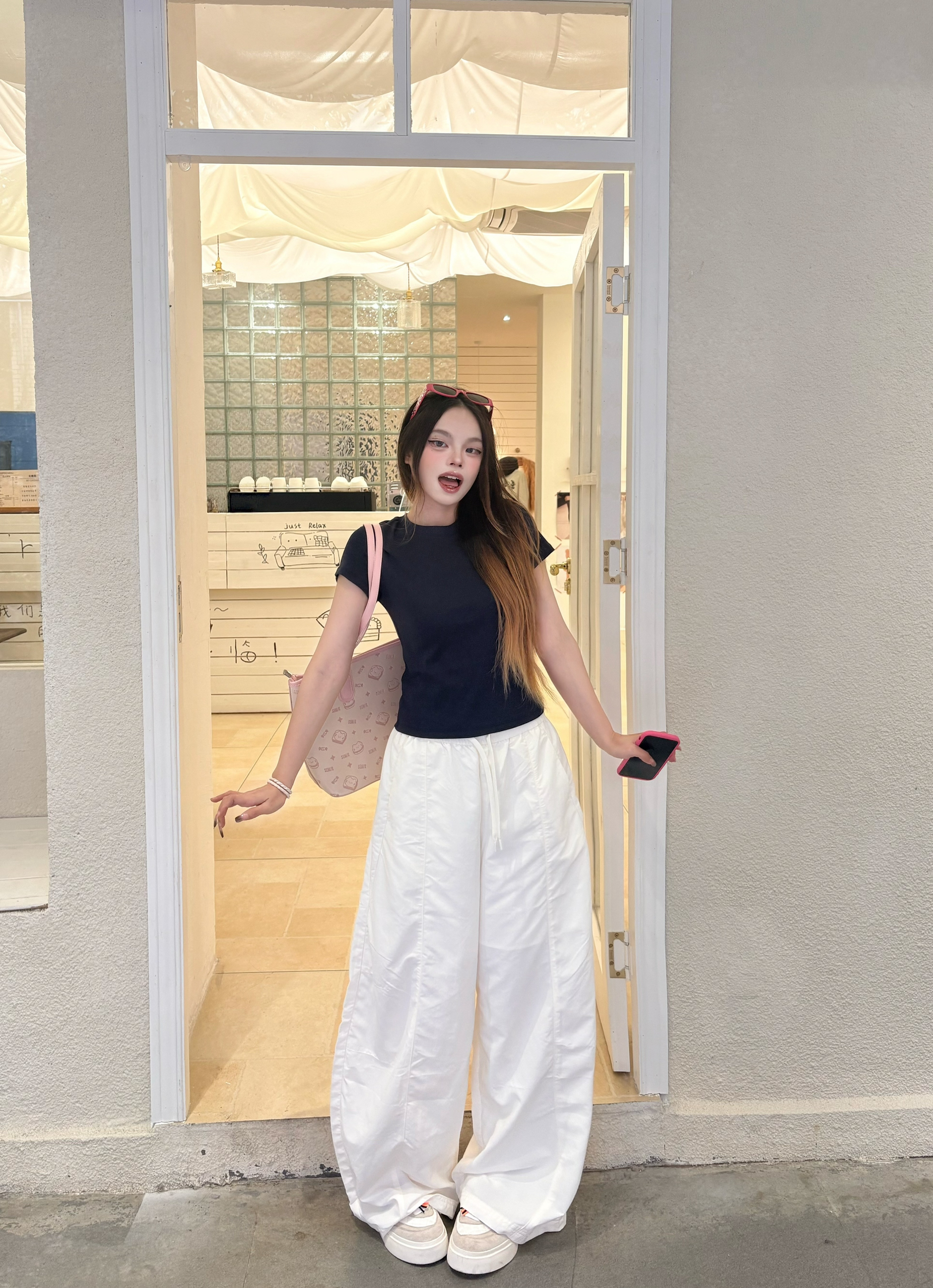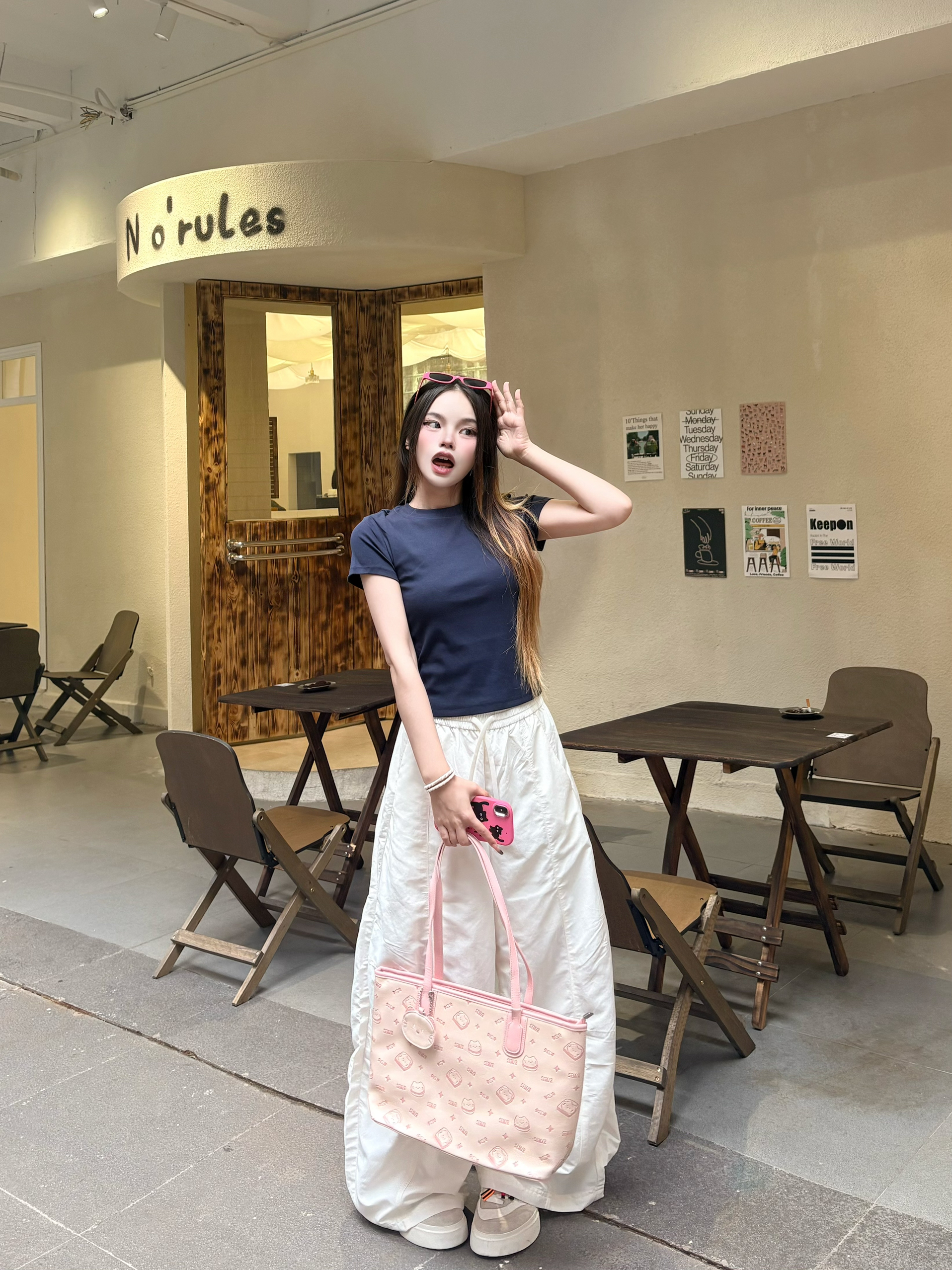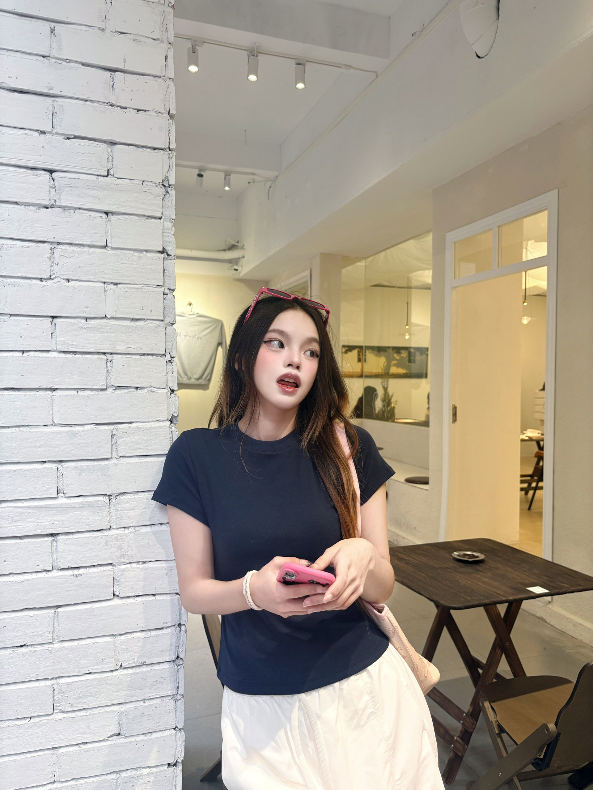 今天这套是我超爱的韩系松弛感思路✨ 我的上衣选了藏青正肩T,利落又显瘦,把身材比例衬得刚刚好。✨ 我下装搭了米白阔腿裤,垂感超绝,走路带风还藏肉,秒变纸片人。✅ 点睛之笔是这个粉粉的托特包,满印的小猫图案软萌又元气,和无彩色的衣装撞出少女感,瞬间点亮整个look。🐈 我165/96 穿的一套是m码🎀