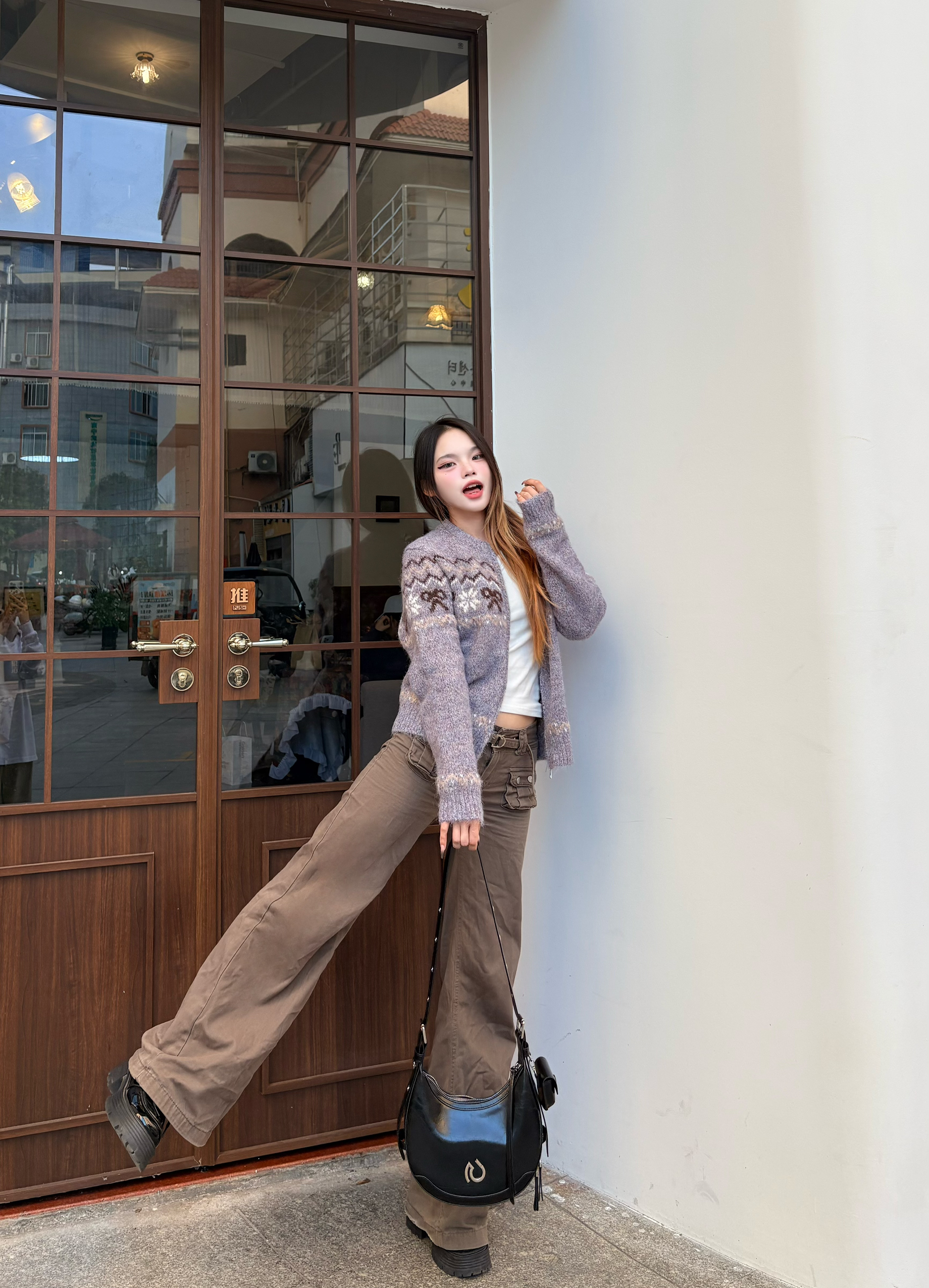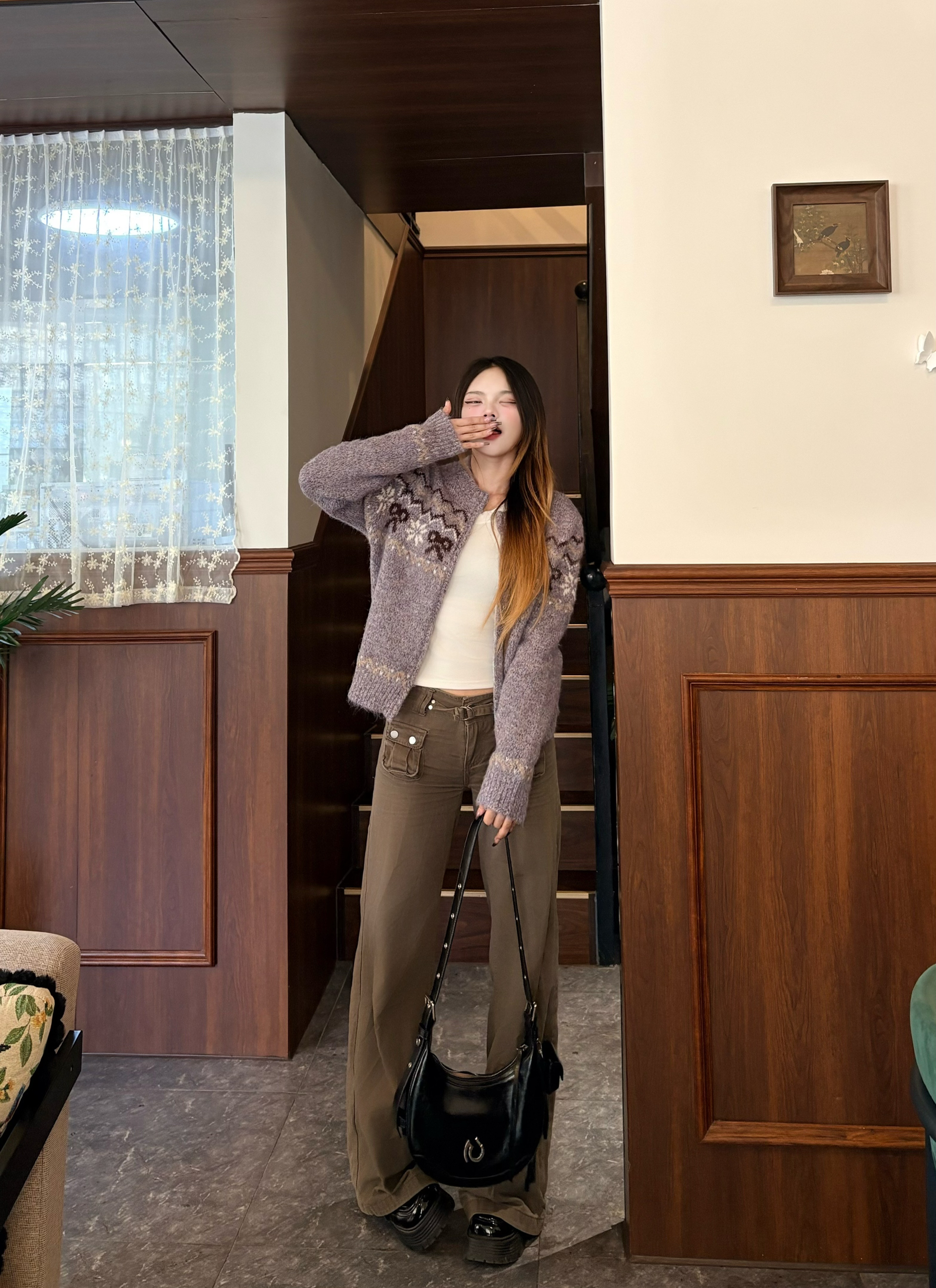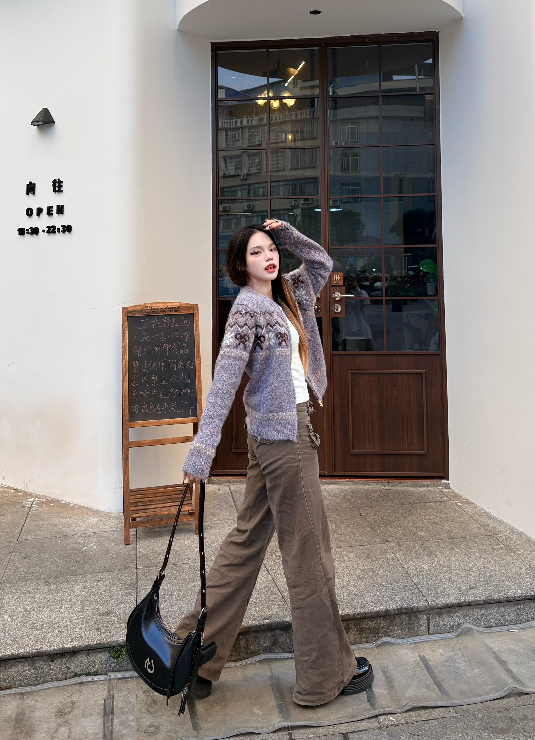 “这件紫灰色开衫我最近经常穿,花纹很特别,配条卡其阔腿裤,休闲又有点小复古。🤎 料子软软的,秋天穿刚好,不冷不热,关键是怎么搭都好看🍁 日常出门随便一穿就很有氛围感,我还挺喜欢这种随性的风格。💕 165/96 我穿的一套m