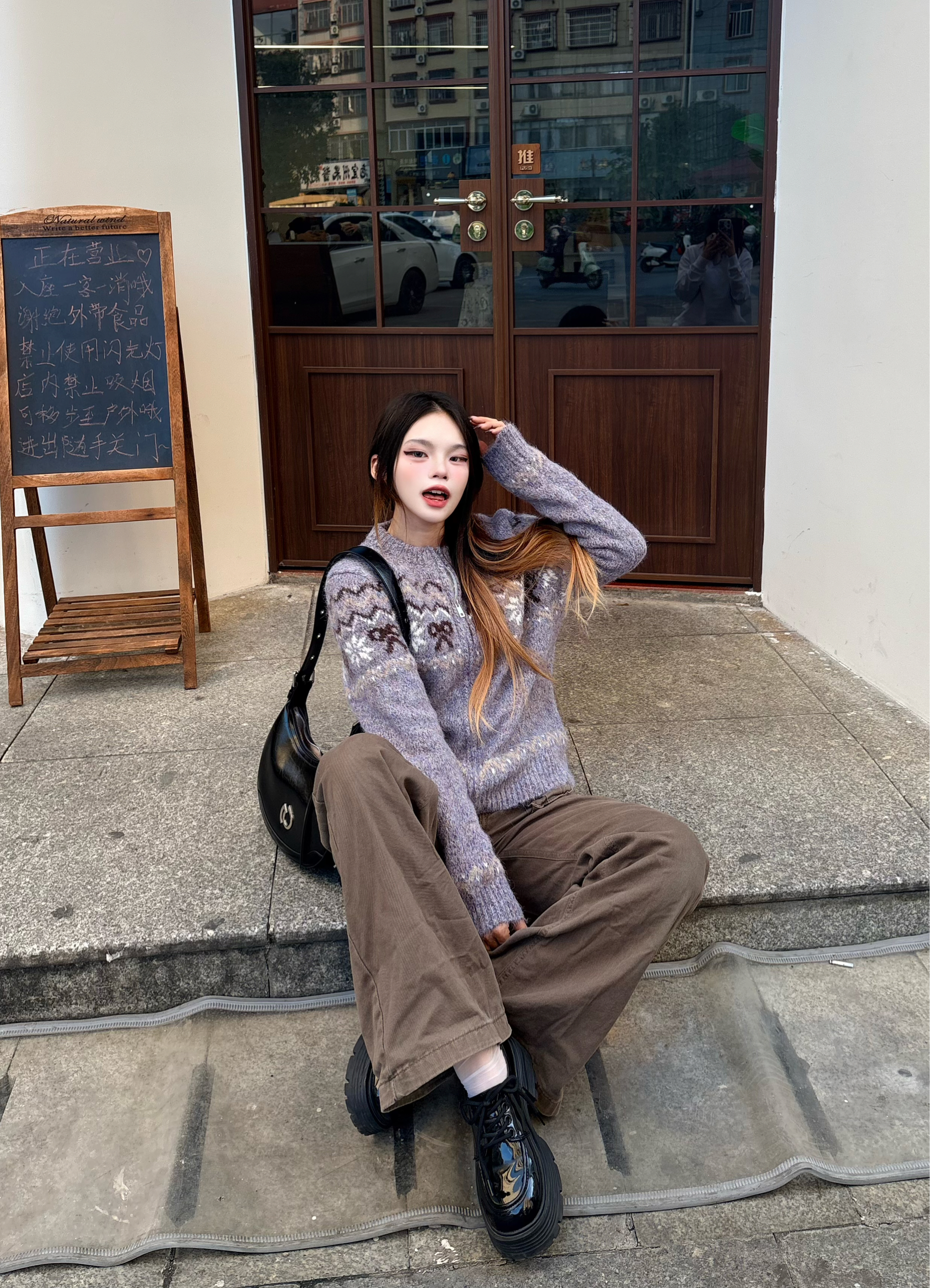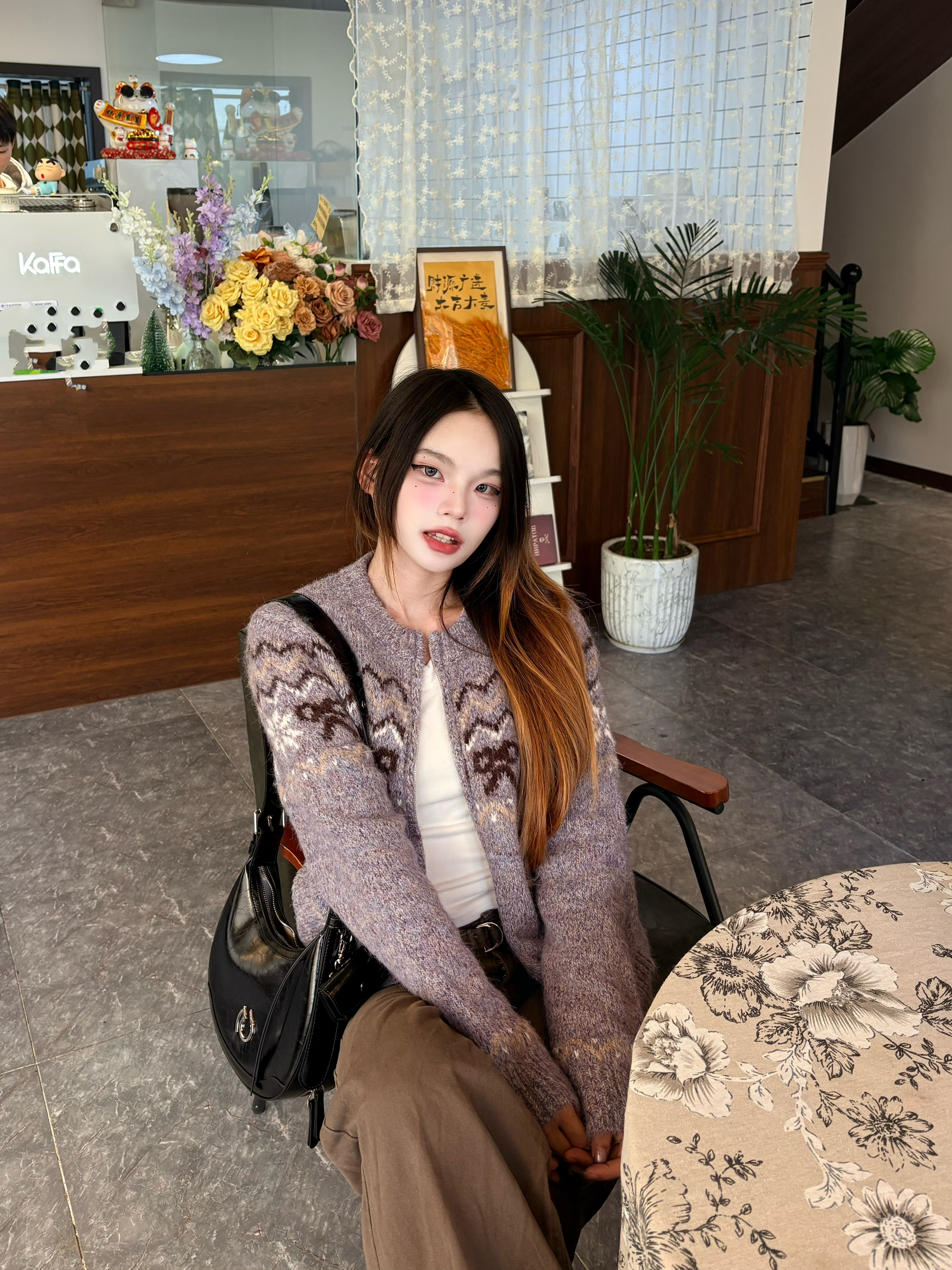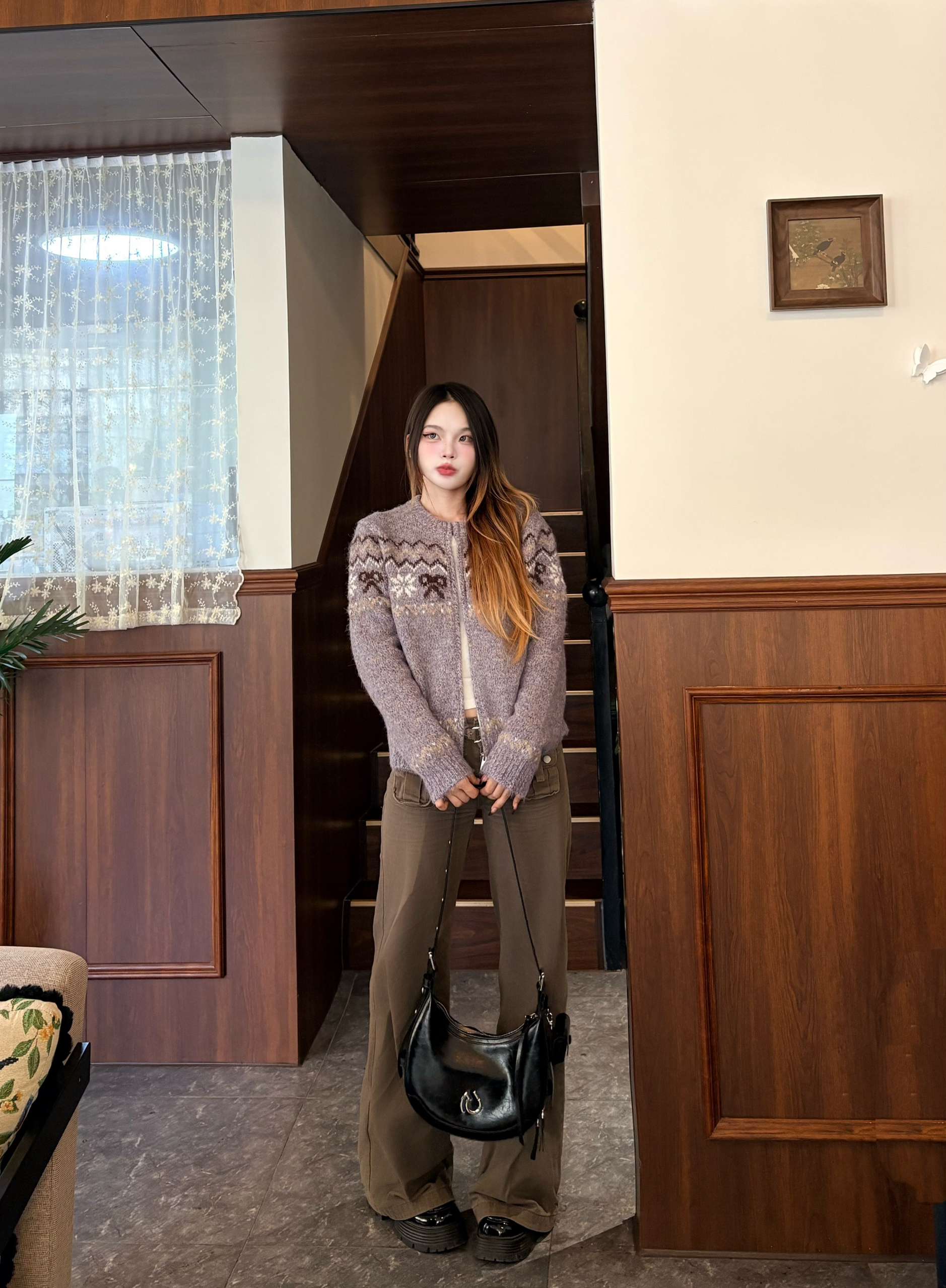 “这件紫灰色开衫我最近经常穿,花纹很特别,配条卡其阔腿裤,休闲又有点小复古。🤎 料子软软的,秋天穿刚好,不冷不热,关键是怎么搭都好看🍁 日常出门随便一穿就很有氛围感,我还挺喜欢这种随性的风格。💕 165/96 我穿的一套m