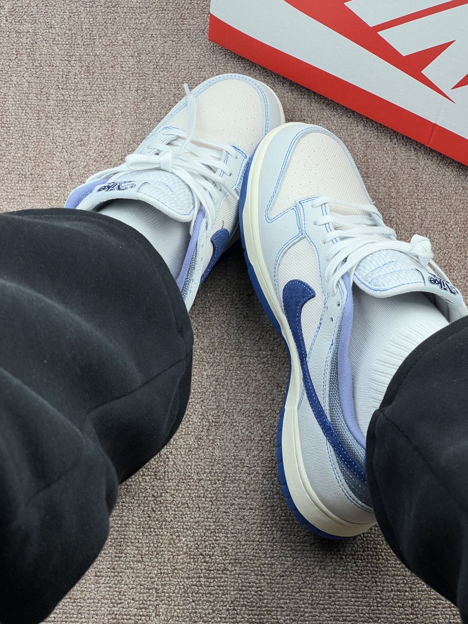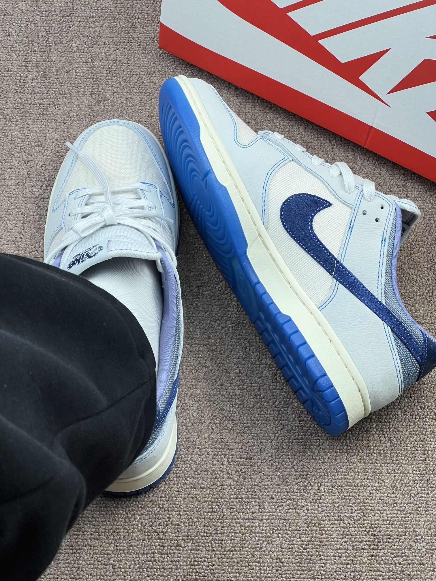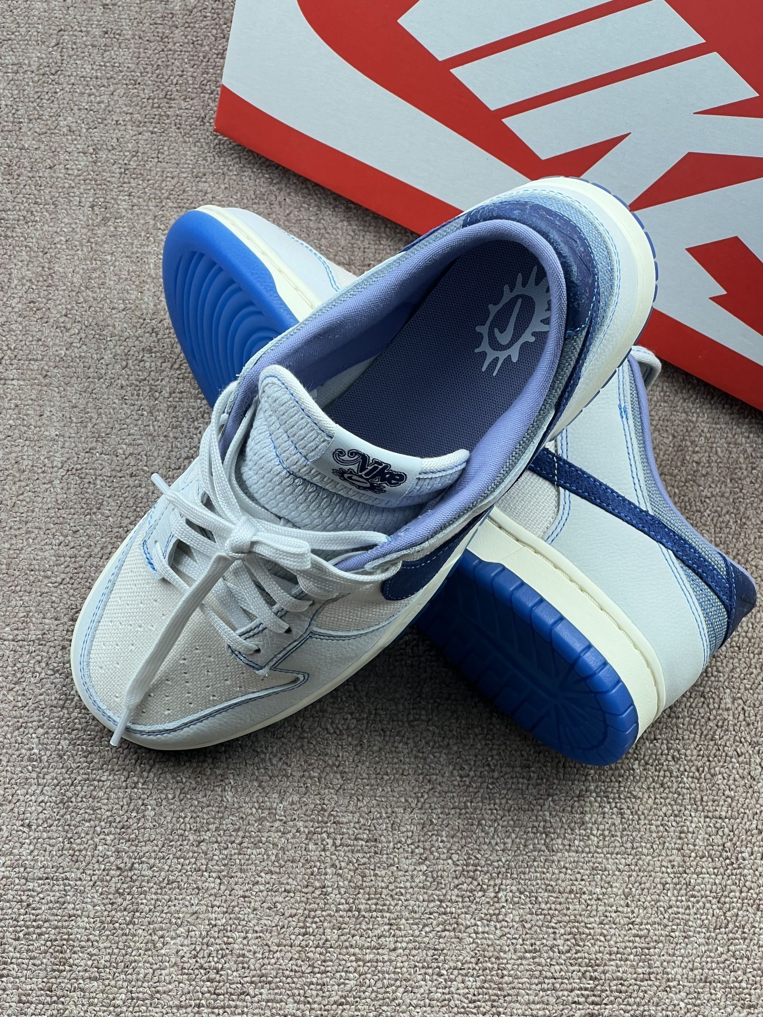 这双Dunk Low白蓝配色,是我近期穿得比较多的一双👟。 整体是米白+深浅蓝的拼接,帆布和荔枝皮的材质,视觉上挺有层次,日常搭牛仔裤、运动裤都不突兀。鞋舌的小太阳标和鞋垫的图案,算是小彩蛋,细节控会喜欢。 但缺点也挺明显:帆布部分容易显脏,而且不太好打理;鞋舌偏厚,夏天穿会有点闷脚;Dunk的通病——鞋底偏硬,长时间走路脚会有点酸,需要磨合。 买它主要是看中配色清爽,不是为了炒卖,就...