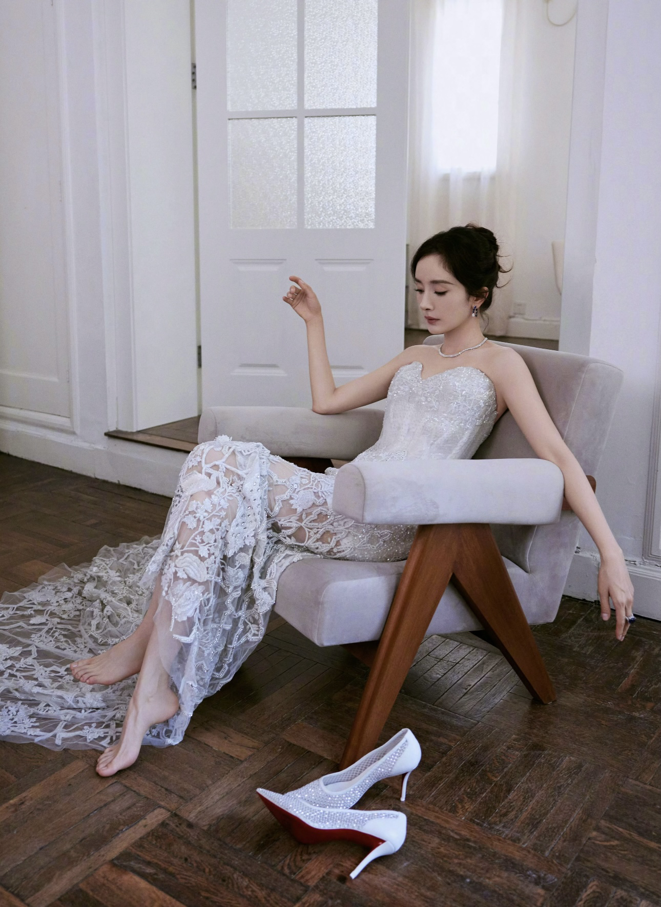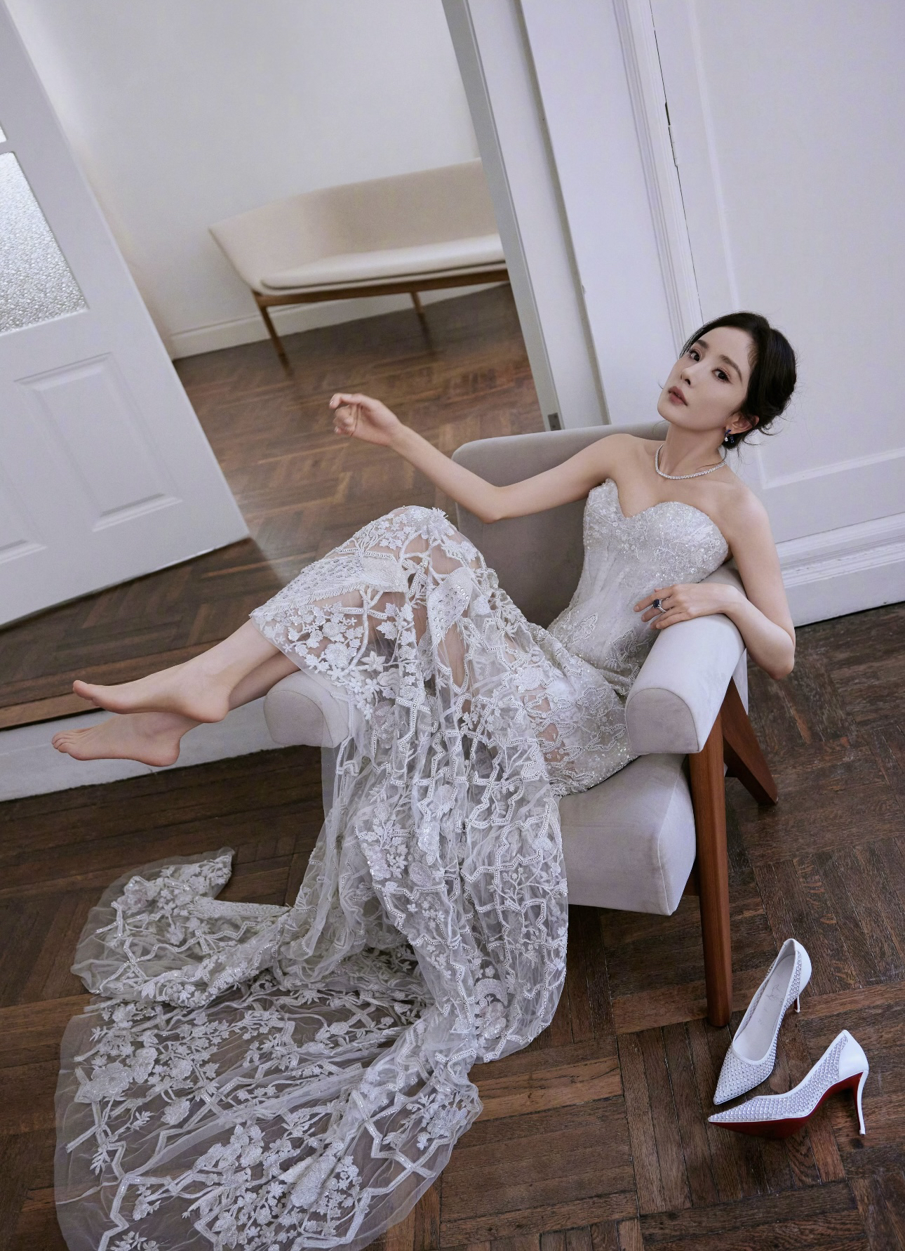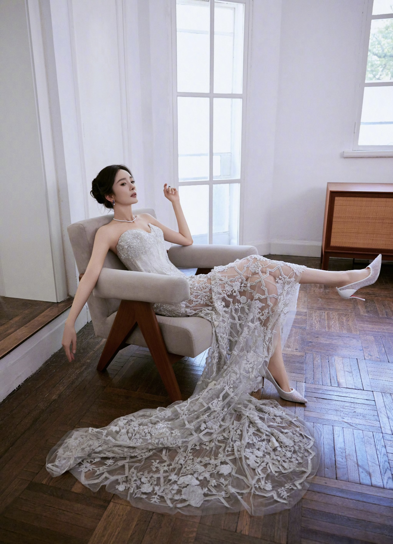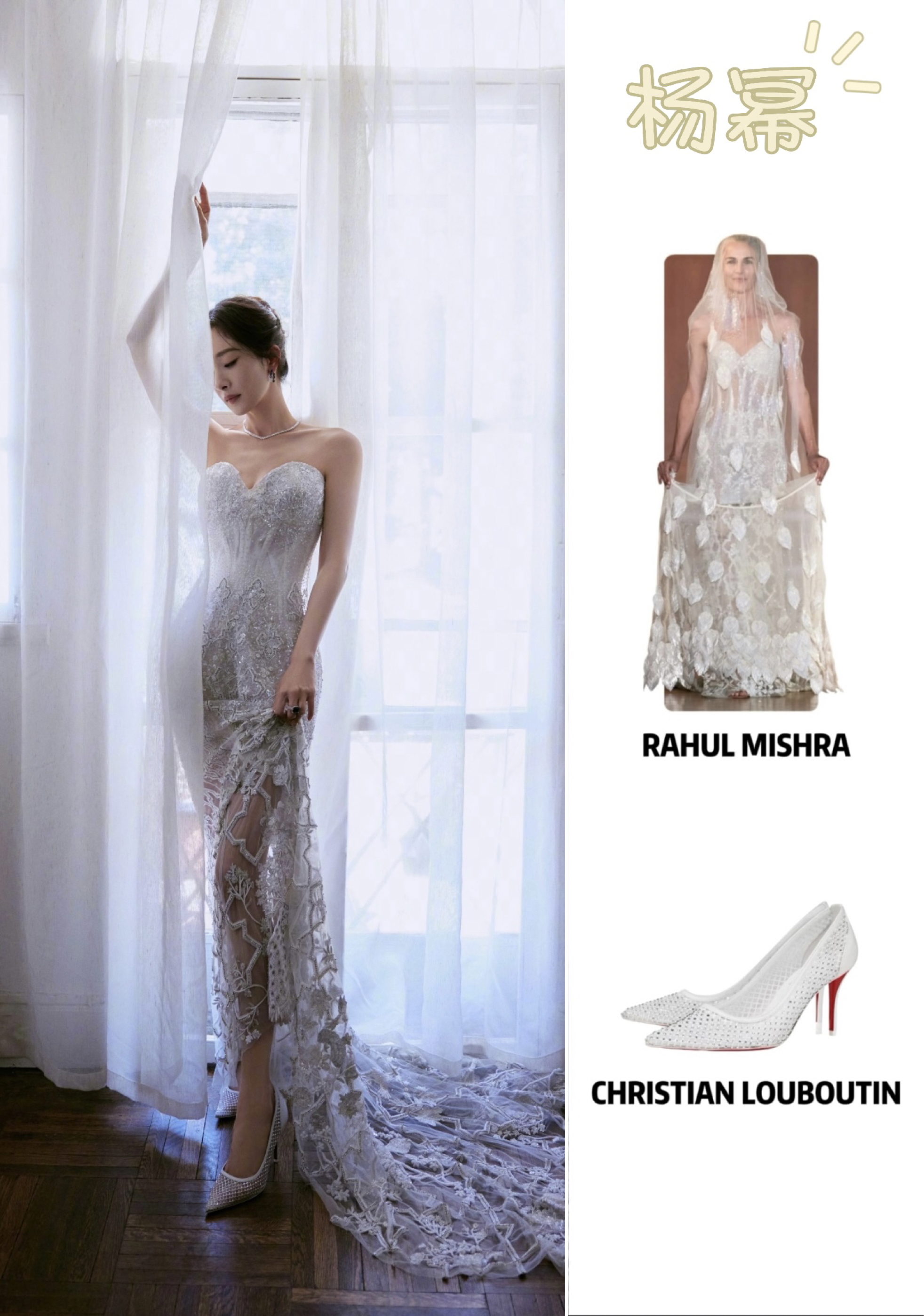 谁懂啊!杨幂这套造型真的美到失语,把高级感和柔媚感平衡得刚刚好,完全是红毯级别的心动暴击💫 👗 设计亮点 • 抹胸鱼骨收腰:完美勾勒腰线,秒变沙漏身材,对各种身形都很友好 • 重工蕾丝刺绣:立体花卉+透视网纱,若隐若现的腿部线条,又仙又欲 • 银白闪片面料:在光线下像流动的碎钻,自带打光板,拍照巨出片