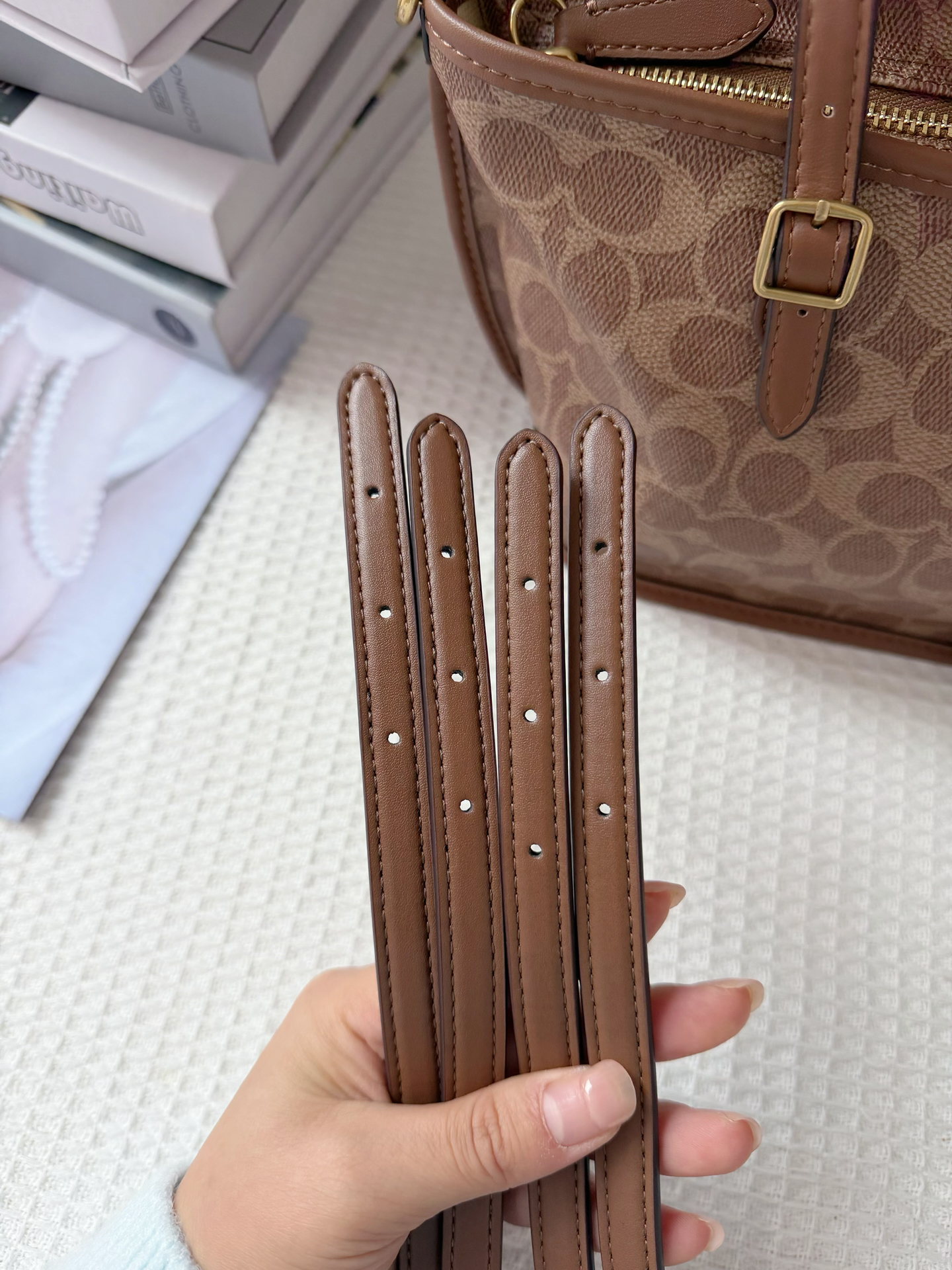 啊姐妹们!必须给大家分享我的蔻驰TAXI21包肩带做了改造,真的好实用啊。这只Coach包之前的肩带只能手拎着,拿久了胳膊酸不说,出门想解放双手都没辙。 现在给它换了根加长肩带,不光能单肩背,还能直接斜挎在身上,腾出手拿咖啡、玩手机都特方便。而且肩带上有好几个孔位,想调长调短随你意,不管是穿厚外套还是薄衣服,都能找到舒服的背法🥰🥰 图源网络,侵删