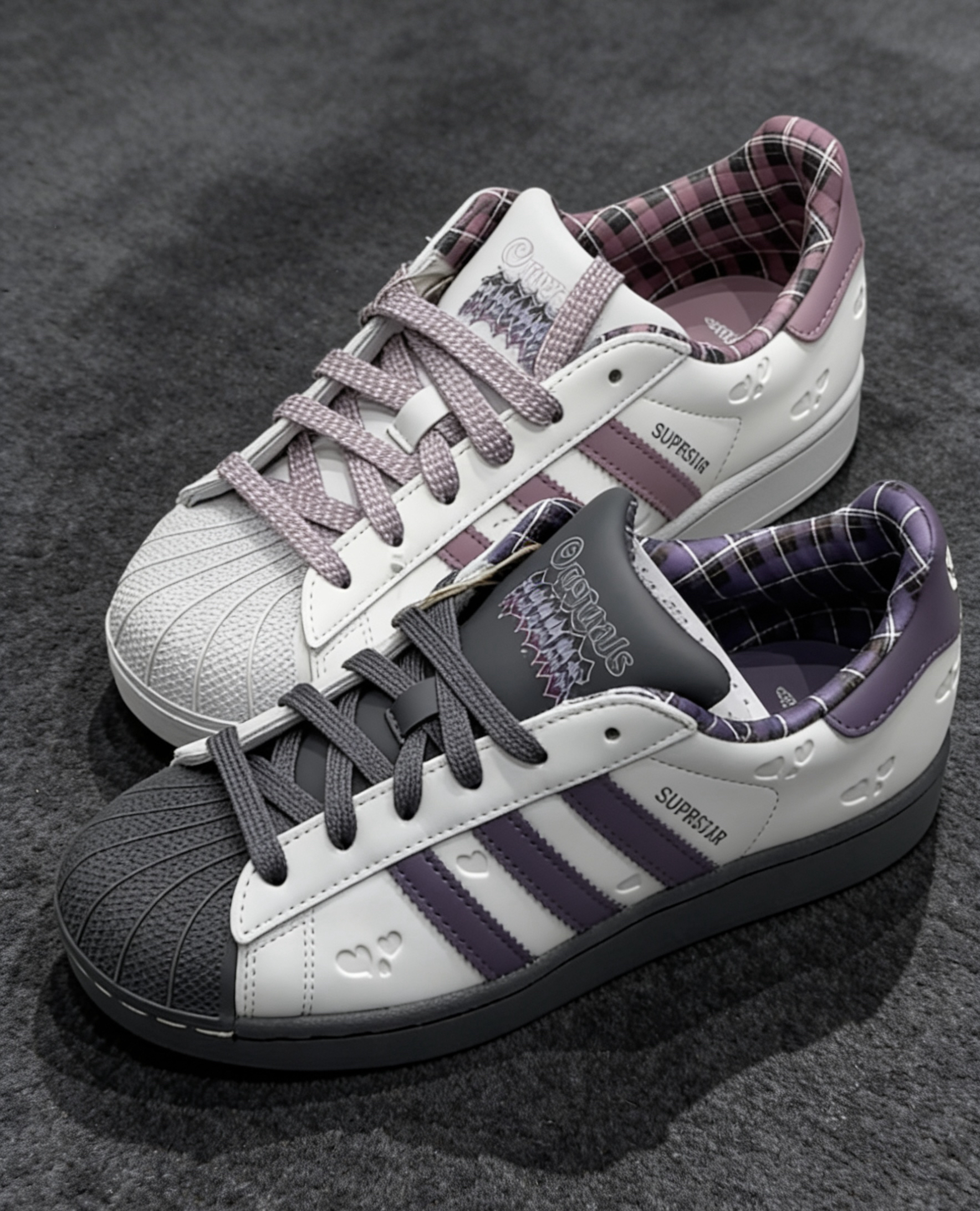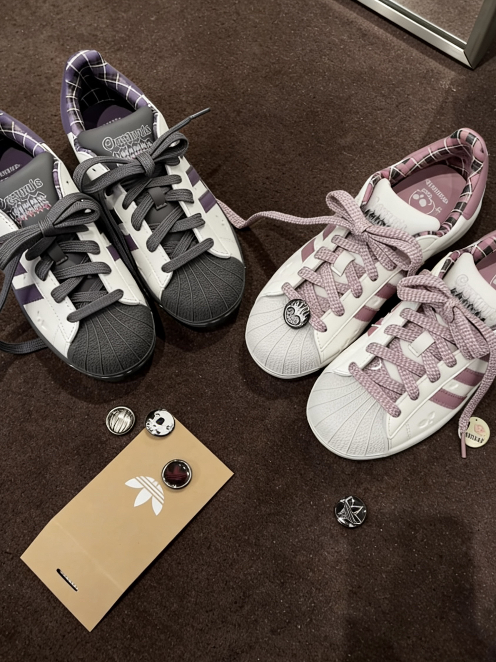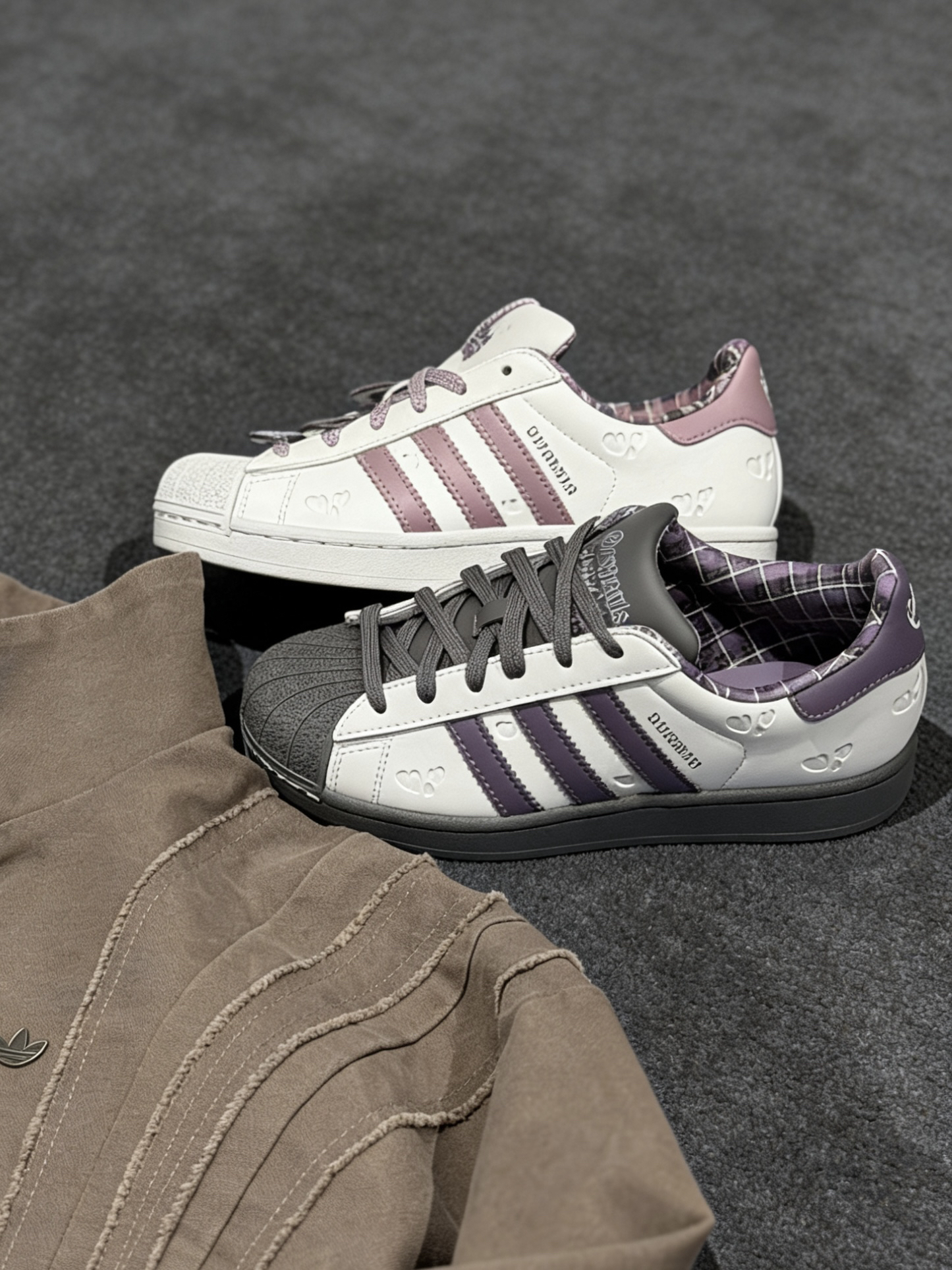 🎀奶白鞋身配柔雾感粉紫三条杠,同色系的粉调鞋带温柔到骨子里,经典贝壳头又刚好中和了甜腻感,完全不会显幼稚。鞋身、鞋尾都做了暗纹爱心压印,连内衬都是复古格纹,从里到外都透着情人节的小心机,不是那种敷衍的印标款!上脚巨显脚小,搭小裙子、牛仔裤、leggings都毫无违和感 💜米白鞋身撞深紫三条杠,深灰的贝壳头和大底自带复古滤镜,比白粉款多了几分拽拽的松弛感,男生上脚也完全不违和!同样的爱心暗纹和格纹...