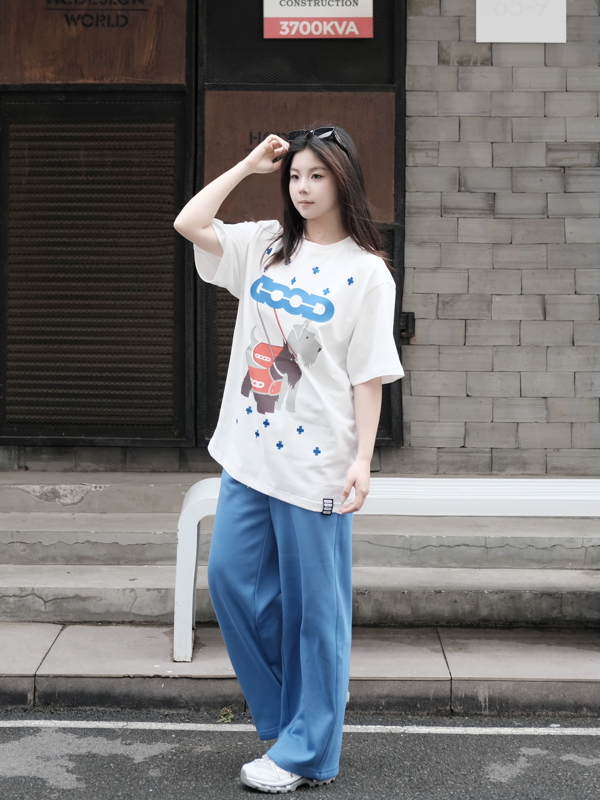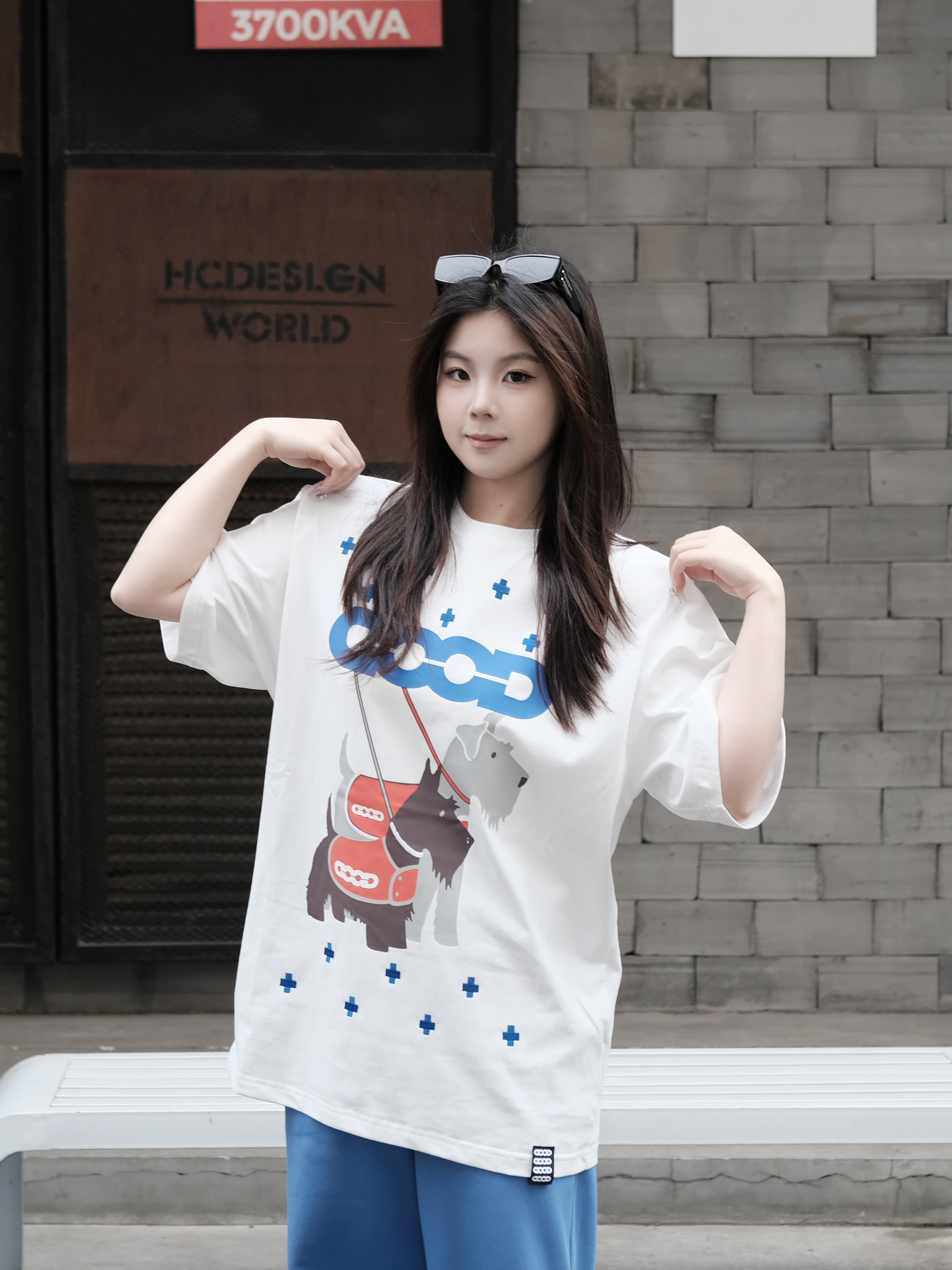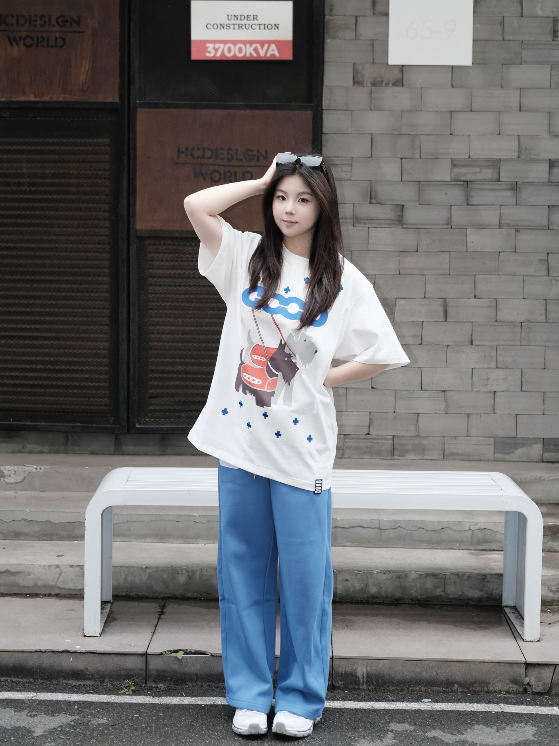 小狗T恤你就这样萌! 给夏天来点活力搭配💦 大印花白t清爽又有童趣 搭配蓝色运动卫裤与上身相呼应 出街舒适又吸睛