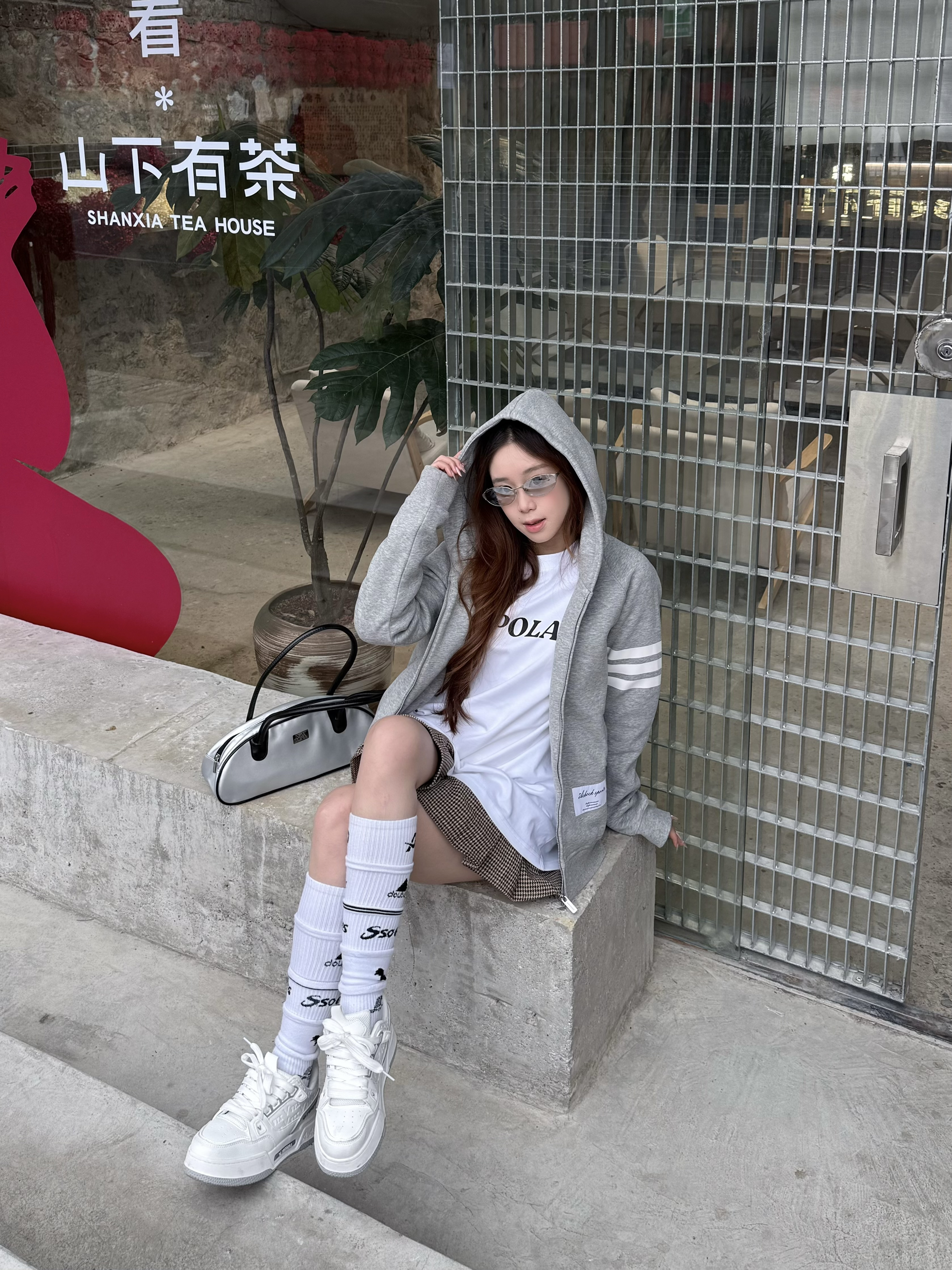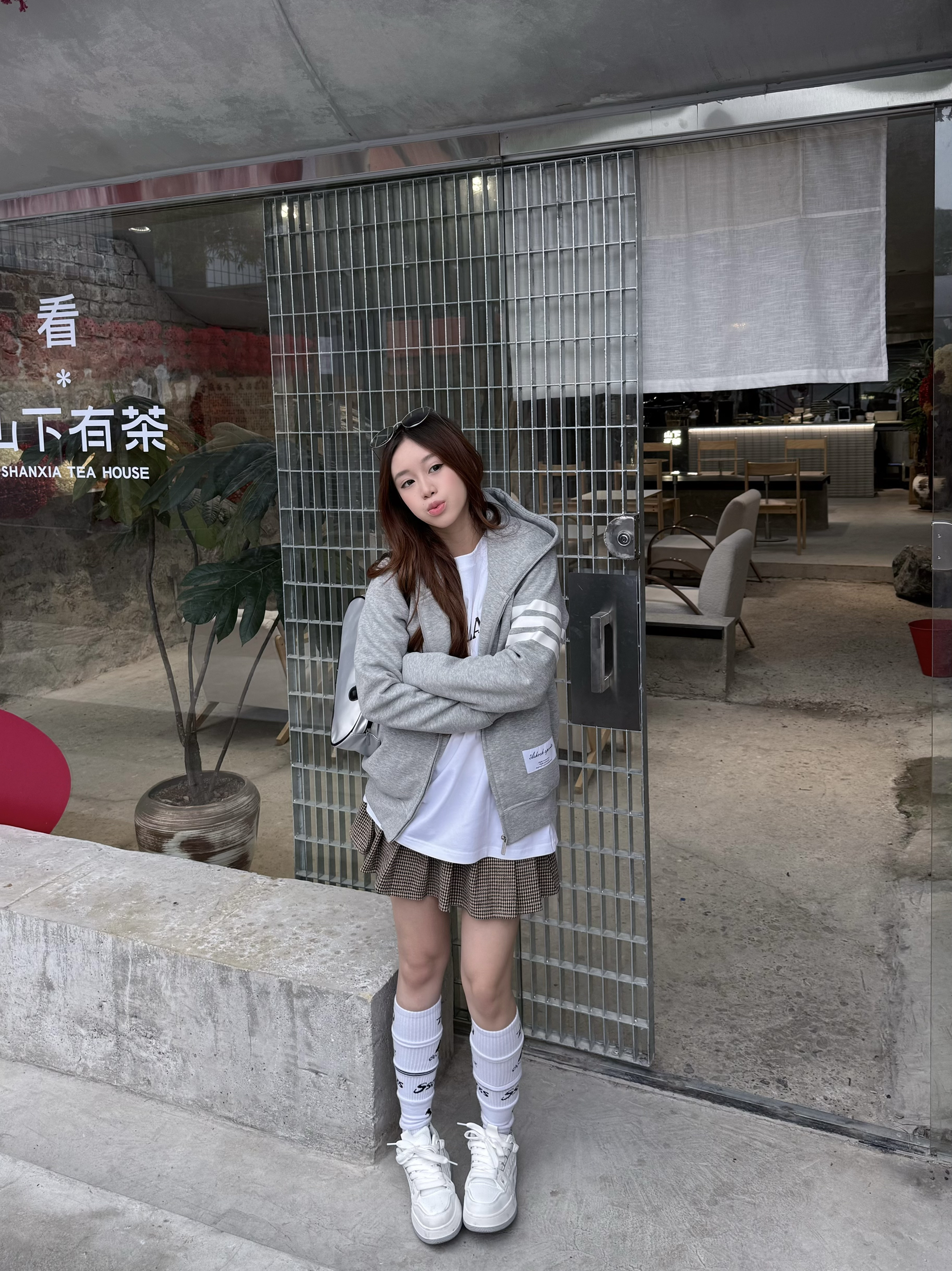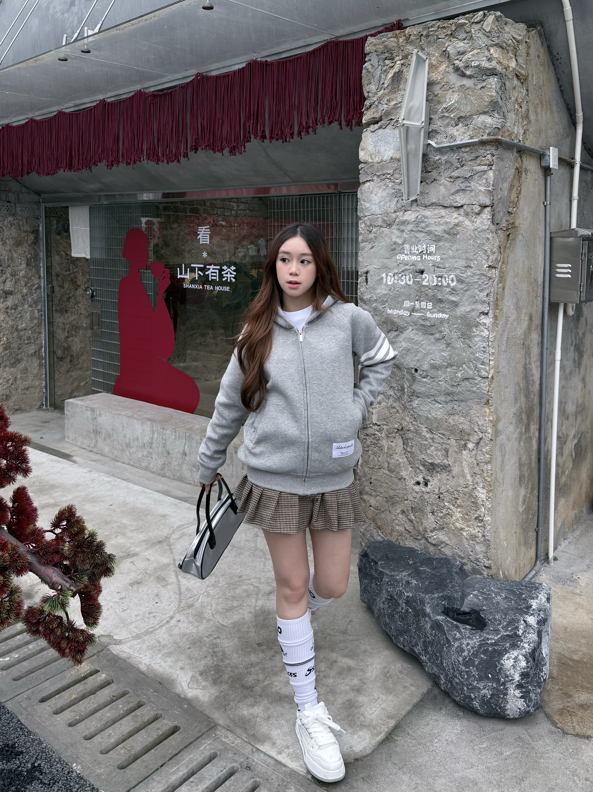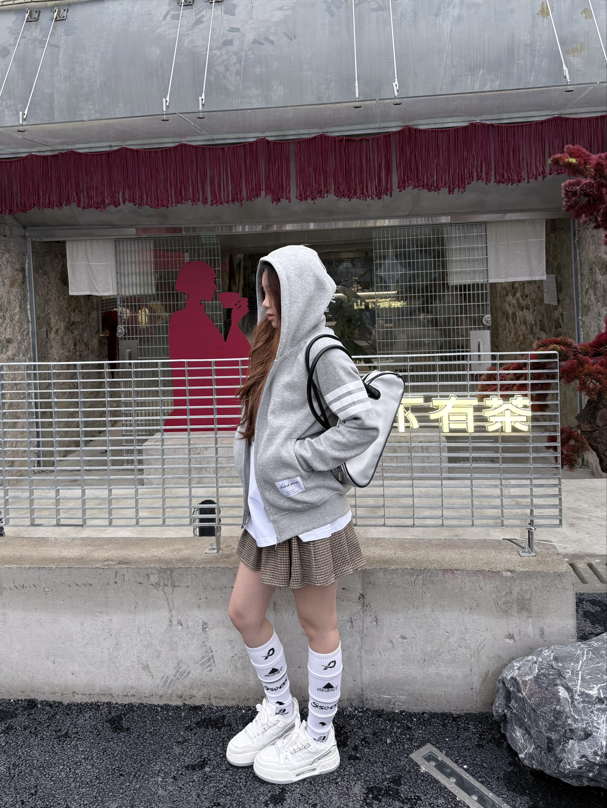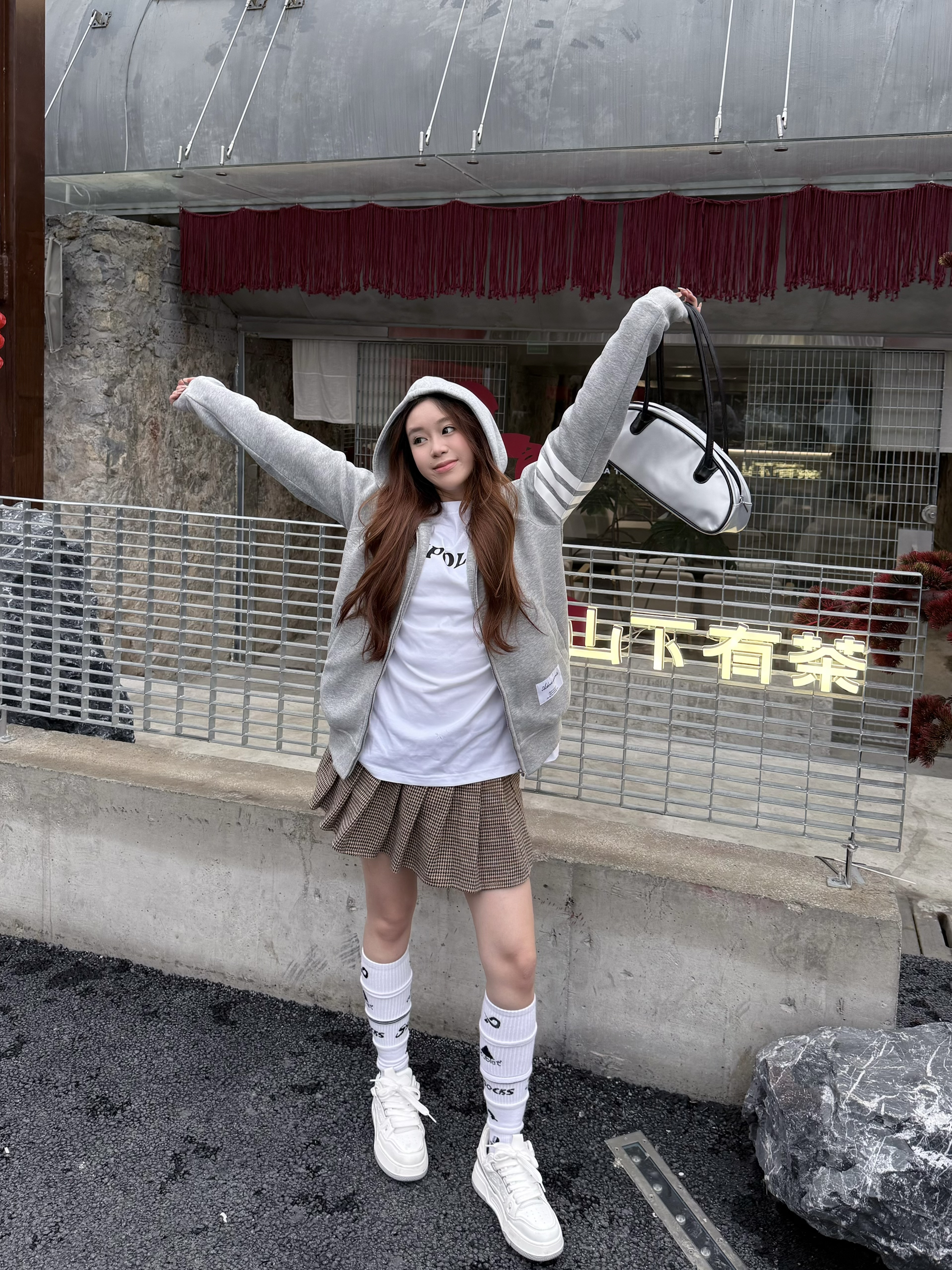 谁懂achock这件灰色开衫有多百搭⁉️ 这件上身挺厚实的穿着很暖和🔥 袖子侧边三条白色条纹有点英伦学院风情 我160/45kg穿s码感觉刚好合身,喜欢宽松最好拍大一码啦 开春之后下面搭配裙子和小腿袜也超好看的