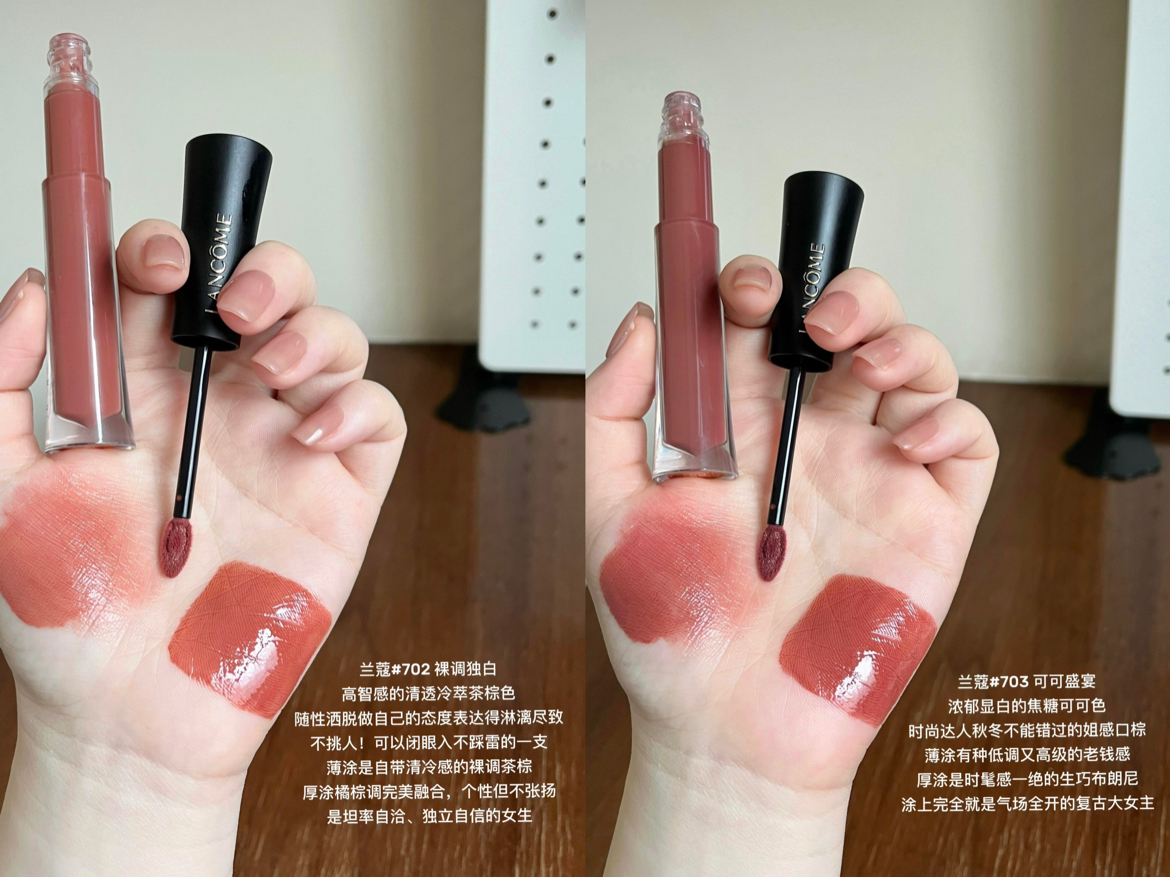 这几支兰蔻唇釉是近期使用率很高的单品,质地清透成膜快,上嘴是水润的玻璃唇感,不会拔干。 • #706 纯粹欢愉:奶茶裸粉色,薄涂是伪素颜感,厚涂提气色,适合日常上学上班。 • #710 床上早餐:暖调红茶棕,衬肤色,早八通勤涂很有元气。 • #702 裸调独白:冷萃茶棕,随性不挑人,薄涂清冷,厚涂有个性。 • #703 可可盛宴:焦糖可可色,秋冬氛围感足,厚涂复古感强。 刷头贴合唇形,很好...