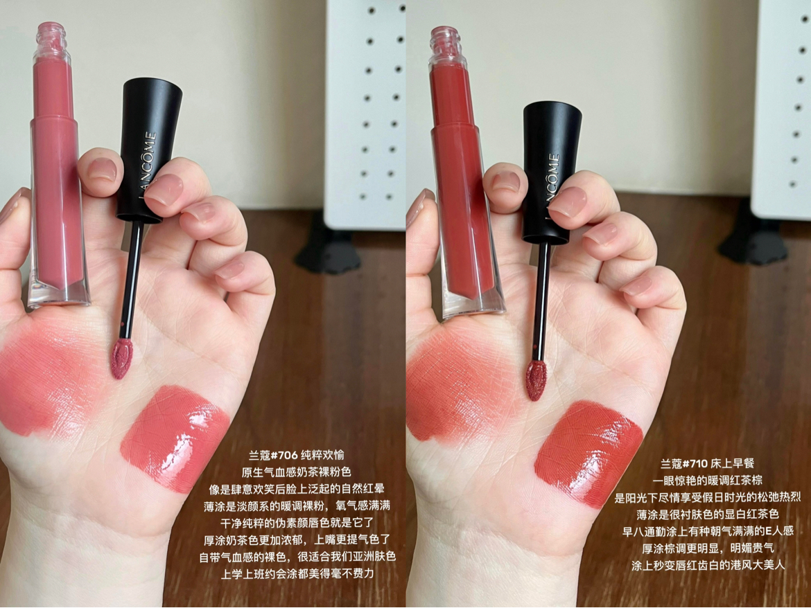 本篇笔记关联了GIORGIO ARMANI/阿玛尼 红管系列臻致唇釉 柔雾丝绒哑光显白雾面 6.5ml 421丹砂色、Lancome/兰蔻 菁纯鎏光唇釉 镜面 4.5ml 702裸调独白、Lancome/兰蔻 菁纯鎏光唇釉 镜面 4.5ml 706纯粹欢愉等商品,为用户提供真实的使用体验和购买参考。