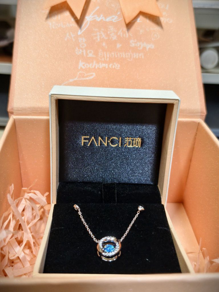 范琦品牌的 高端大气 莫比乌斯系列三秒心动项链 设计非常好看 款式也很经典 简约不失时尚 非常适合搭小裙子 925银的也很有质感 蓝色钻石在中间一闪一闪的 布灵布灵 很好看 礼盒十分精美 送女友不失面子