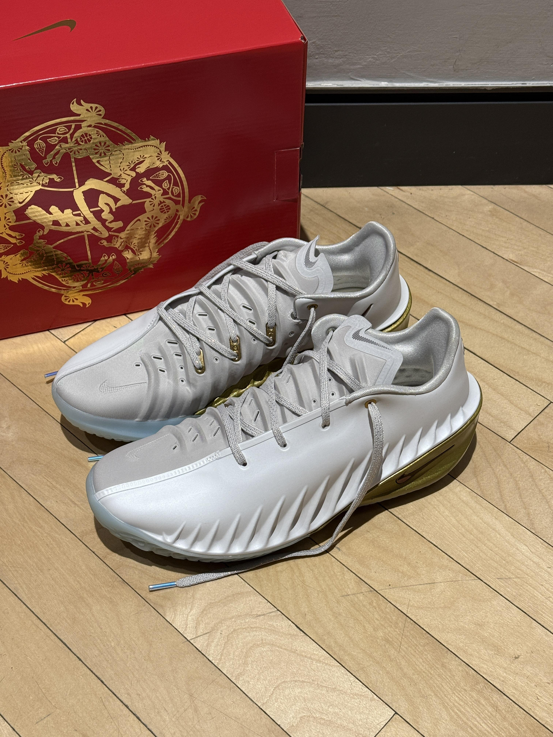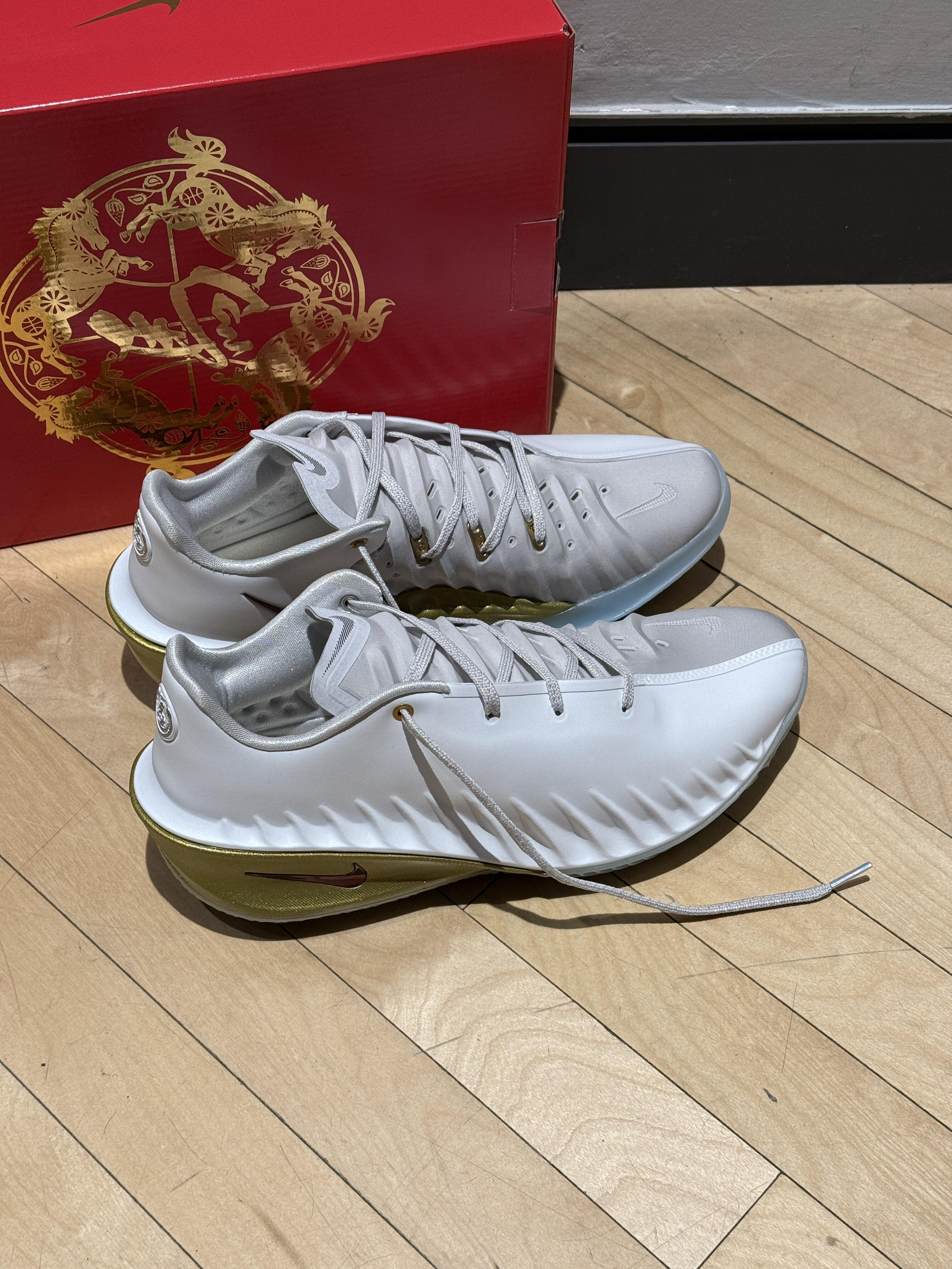 入手这双白金色调的Nike G.T. Cut 4马年限定,最先被后跟的马蹄铁标识打动,低调呼应主题,没有新年款常见的浮夸感。 实战穿了两场室内球局,全掌缓震的反馈很直接,突破启动不拖沓,起跳落地时脚后跟的支撑很稳,大体重也能放心踩。鞋面包裹偏适中,正常脚型正码刚好,宽脚建议试穿大半码,避免鞋头挤脚。 日常搭配工装裤出门,白金色调适配度很高,红色鞋盒的年味也很足。美中不足是水晶底容易吸灰,室内抓...