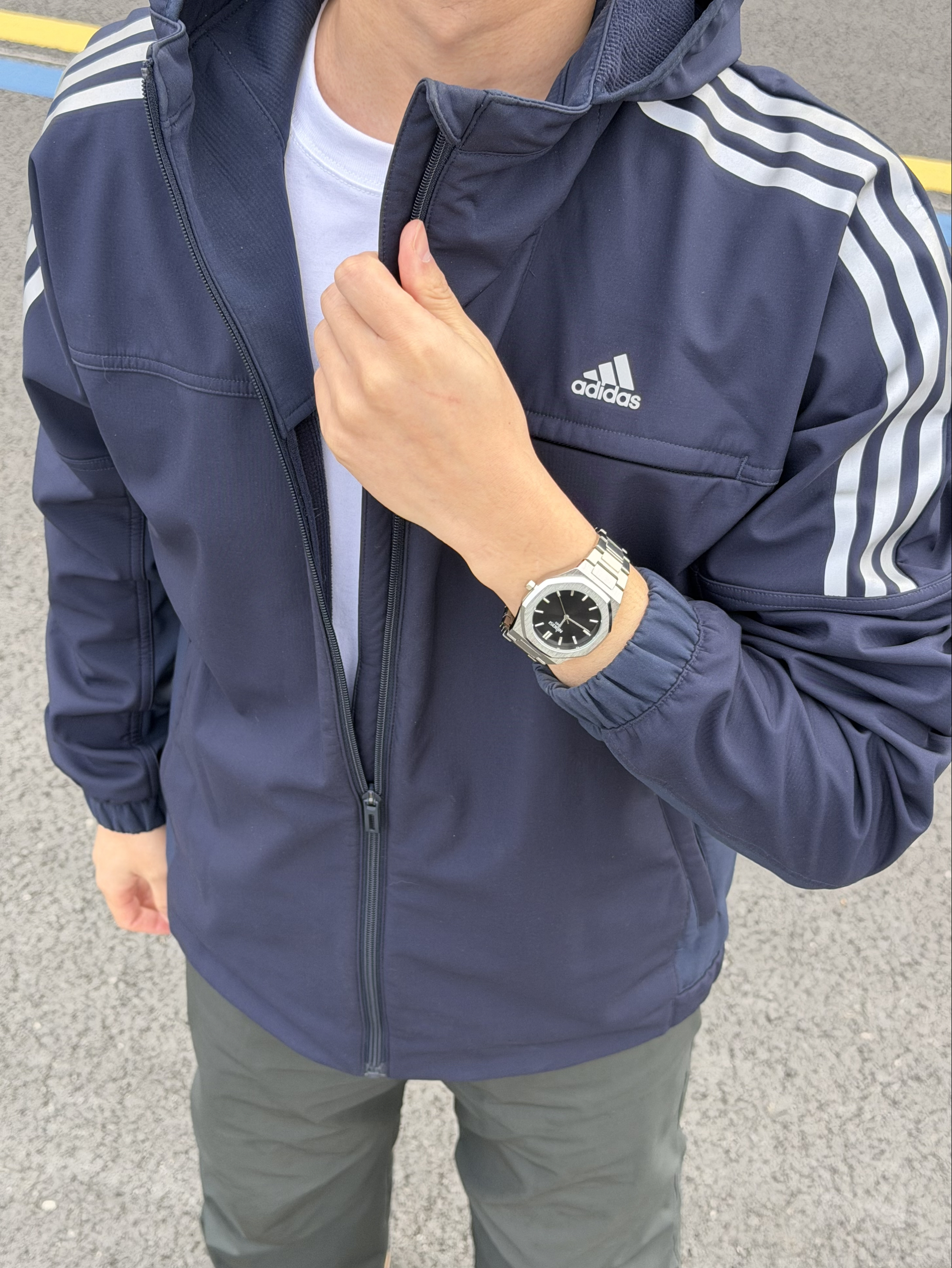 上身穿阿迪连帽外套 下身休闲裤 带上一块手表 运动风
