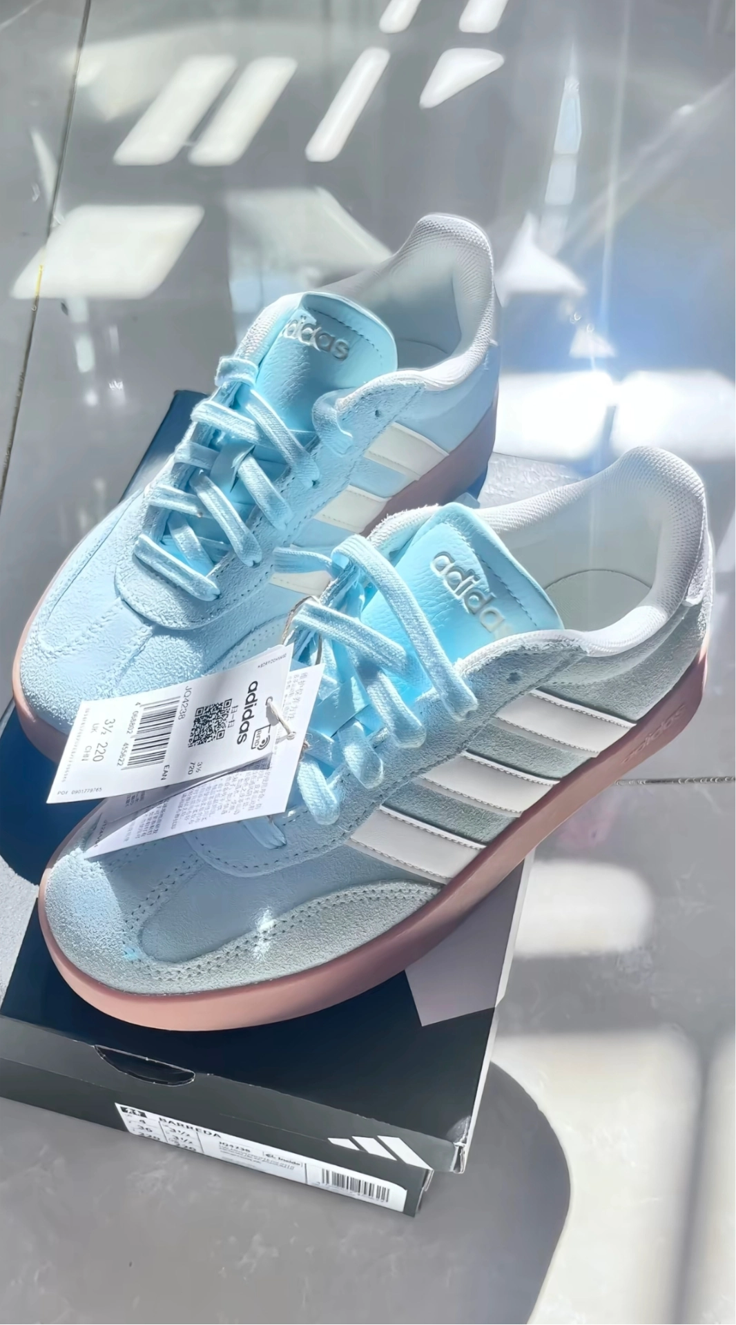配色是干净的白灰+浅蓝,低饱和度很耐看,日常搭牛仔裤、运动裤都不挑,属于越看越舒服的款👟。 皮质偏软,刚上脚不磨脚,走路脚感偏平稳,没有明显踩屎感,日常通勤、逛街穿久了也不会特别累。魔术贴设计挺方便,穿脱省事,不用反复系鞋带。 缺点挺明显:鞋型偏厚重,侧面看有点显脚大,小个子穿容易压身高;鞋底纹路浅,抓地力一般,雨天走光滑地面要小心;鞋舌有点薄,长时间走路偶尔会轻微硌脚背。 整体就是一双颜值...