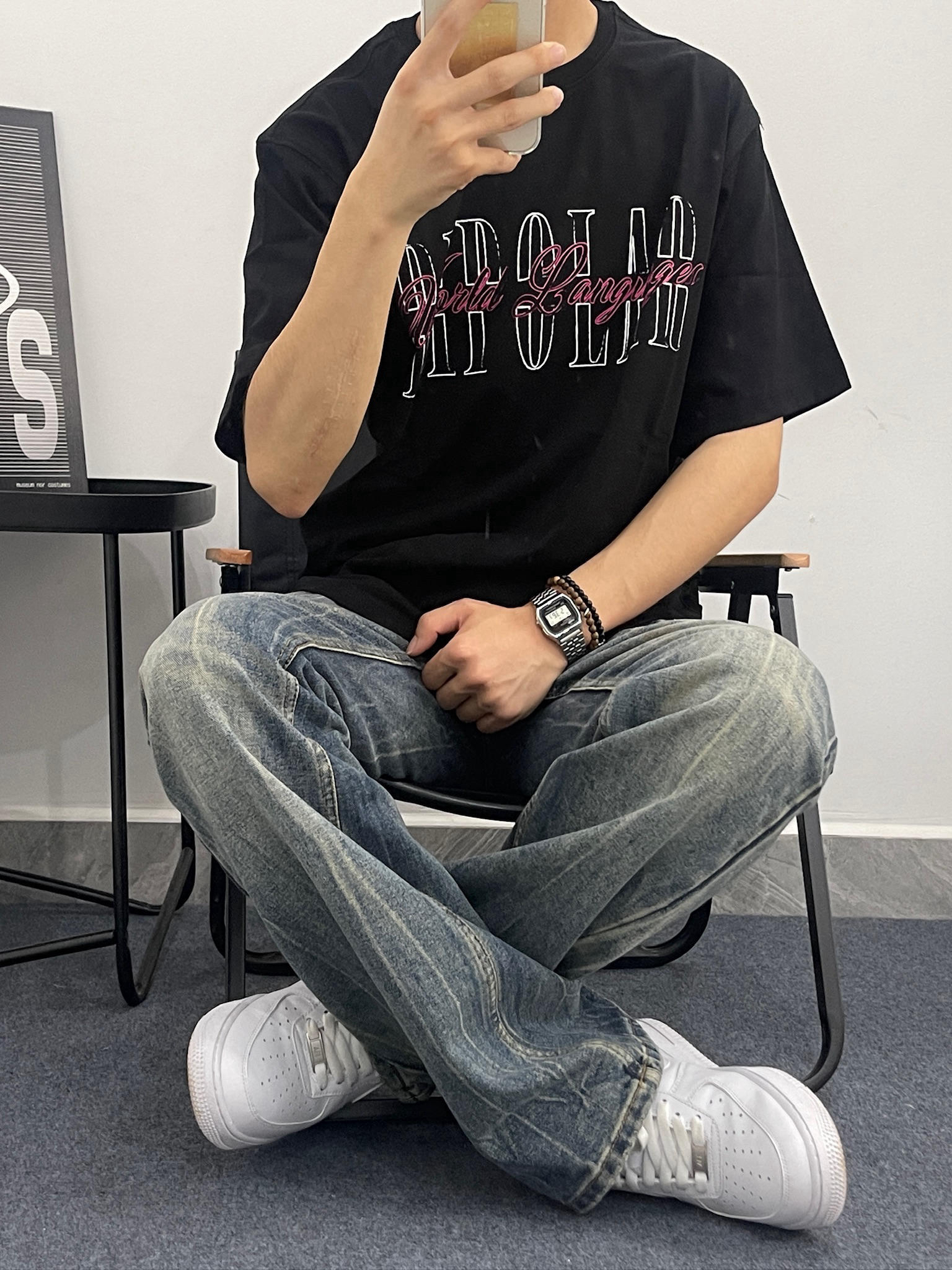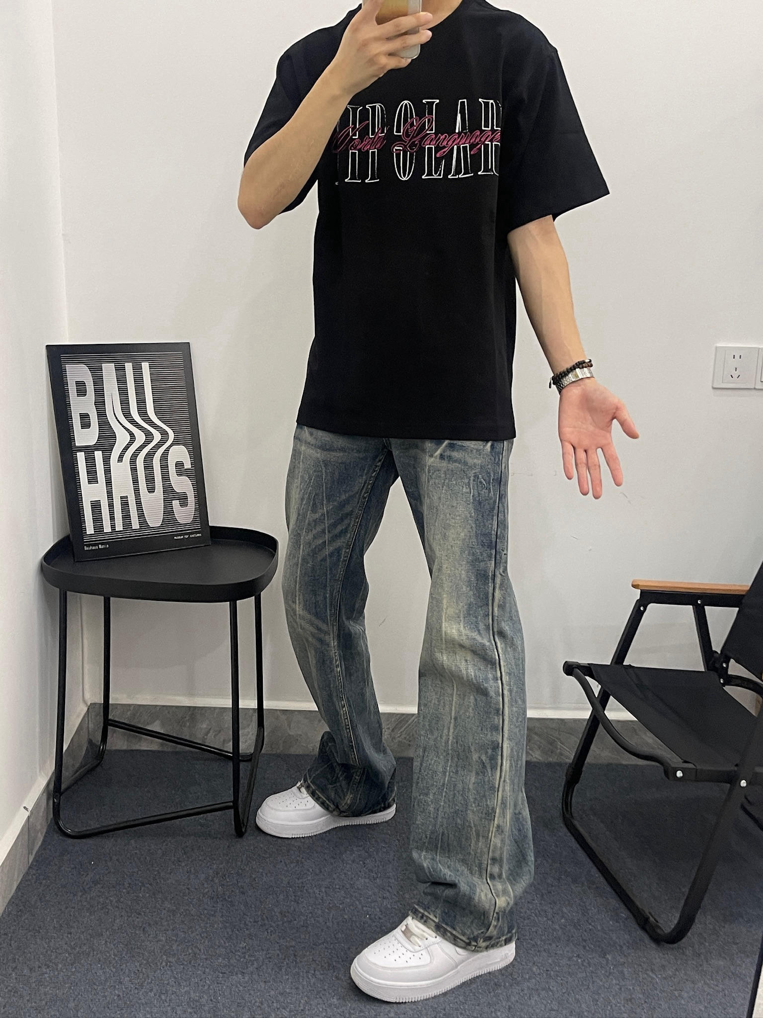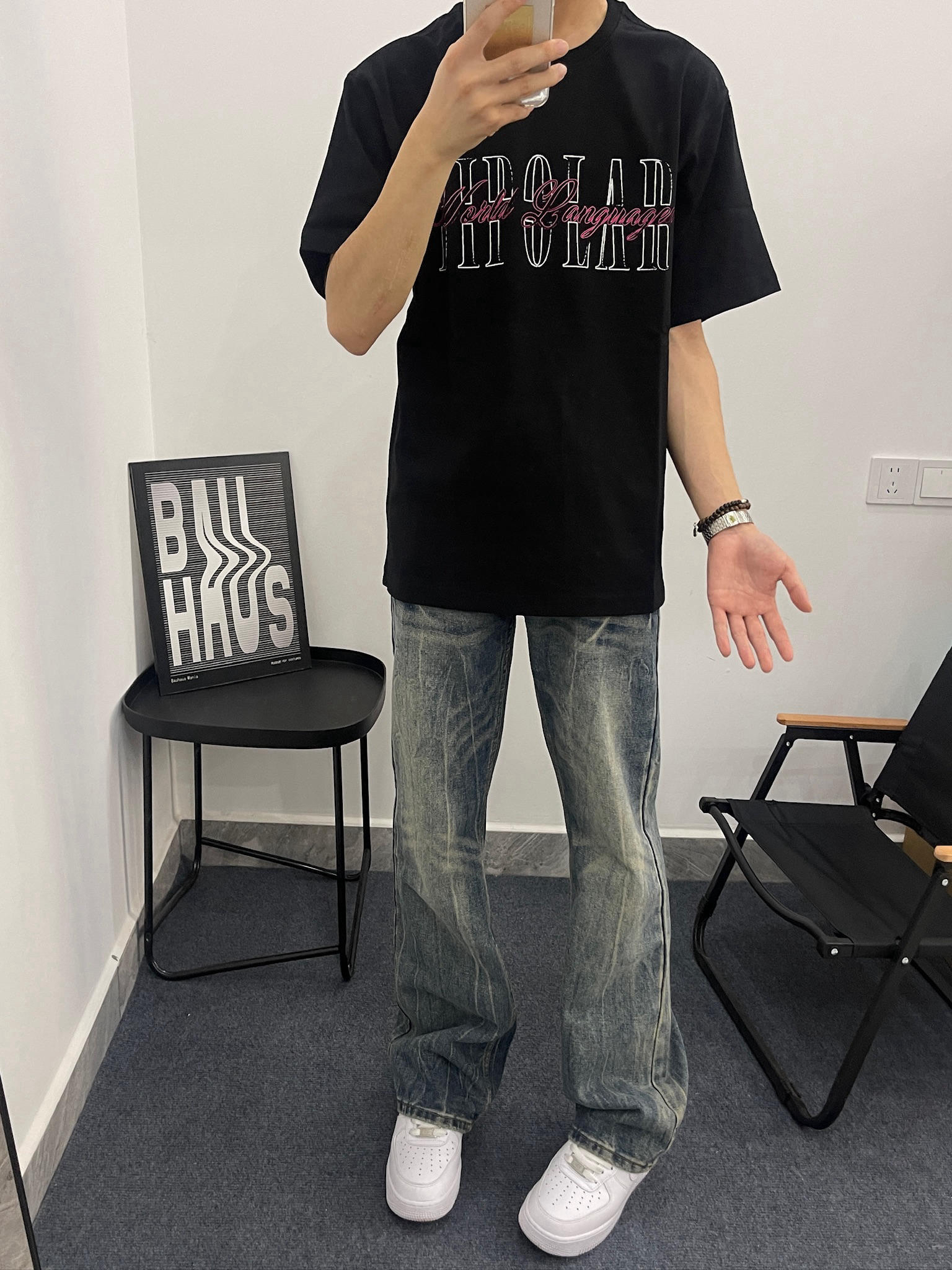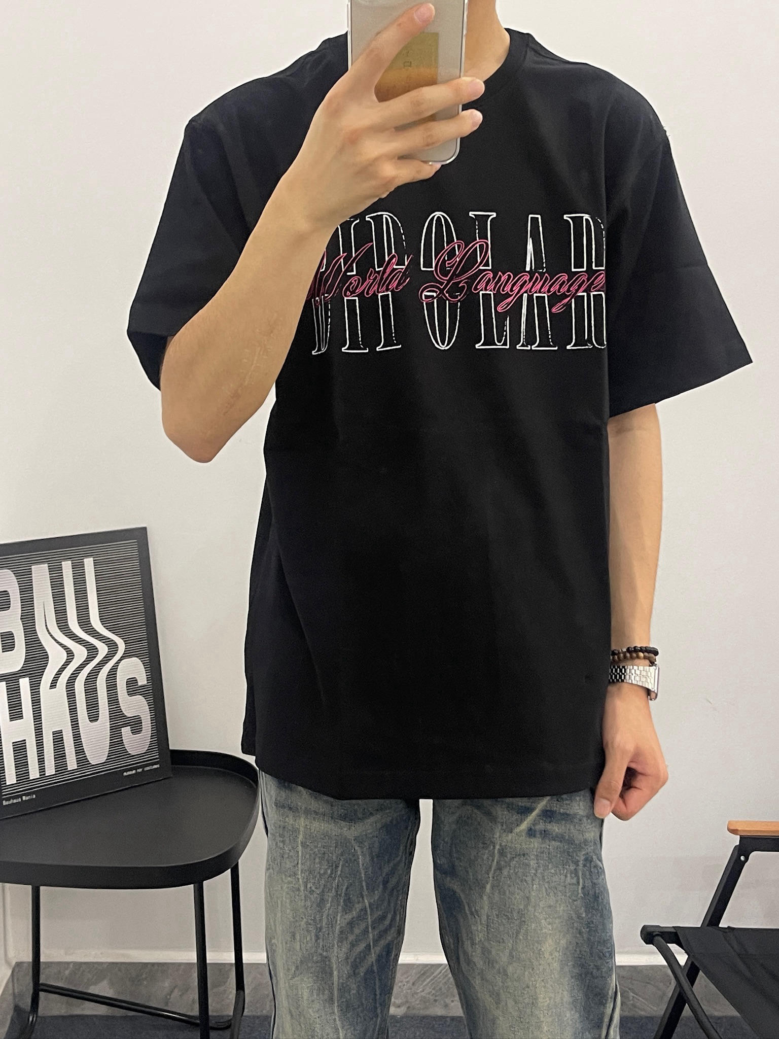 这件黑T真的有点东西😎 拿到手质感就很不一样,不是那种薄薄的廉价感。我178,130斤穿L码,刚好盖过屁股,配我这条做旧牛仔裤,真的很有美式那味儿。夏天穿也不闷,出汗也不会贴在身上,舒服到不想脱。