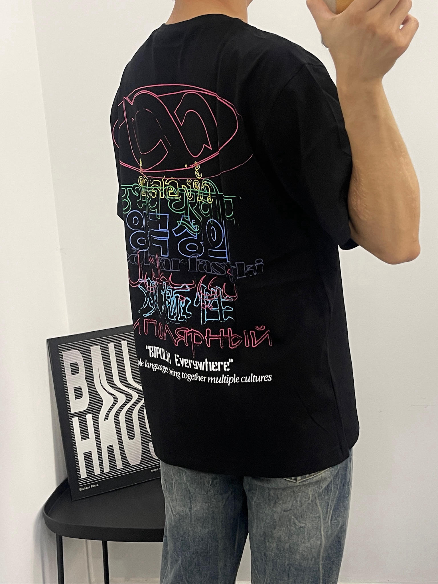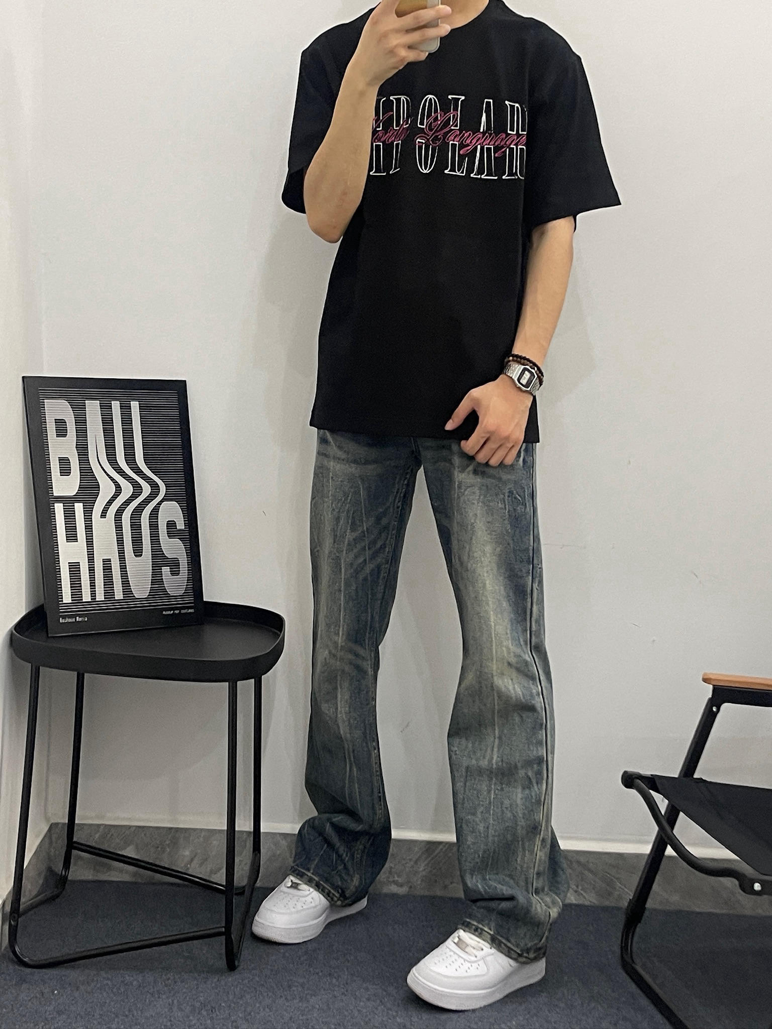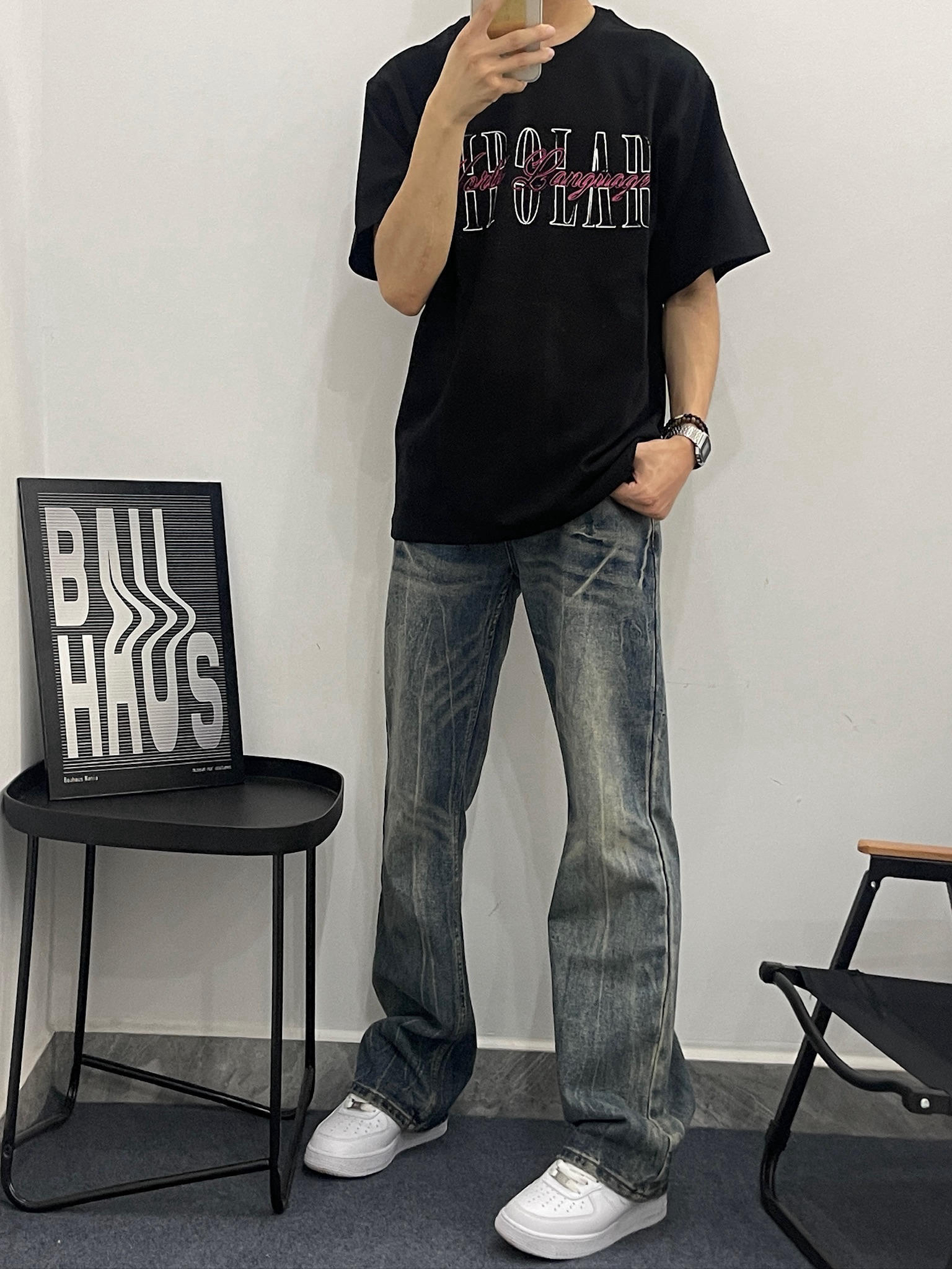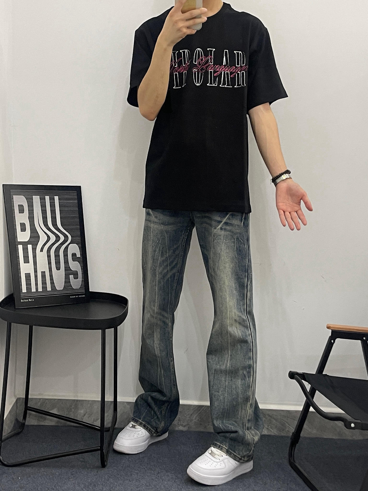 这件黑T真的有点东西😎 拿到手质感就很不一样,不是那种薄薄的廉价感。我178,130斤穿L码,刚好盖过屁股,配我这条做旧牛仔裤,真的很有美式那味儿。夏天穿也不闷,出汗也不会贴在身上,舒服到不想脱。