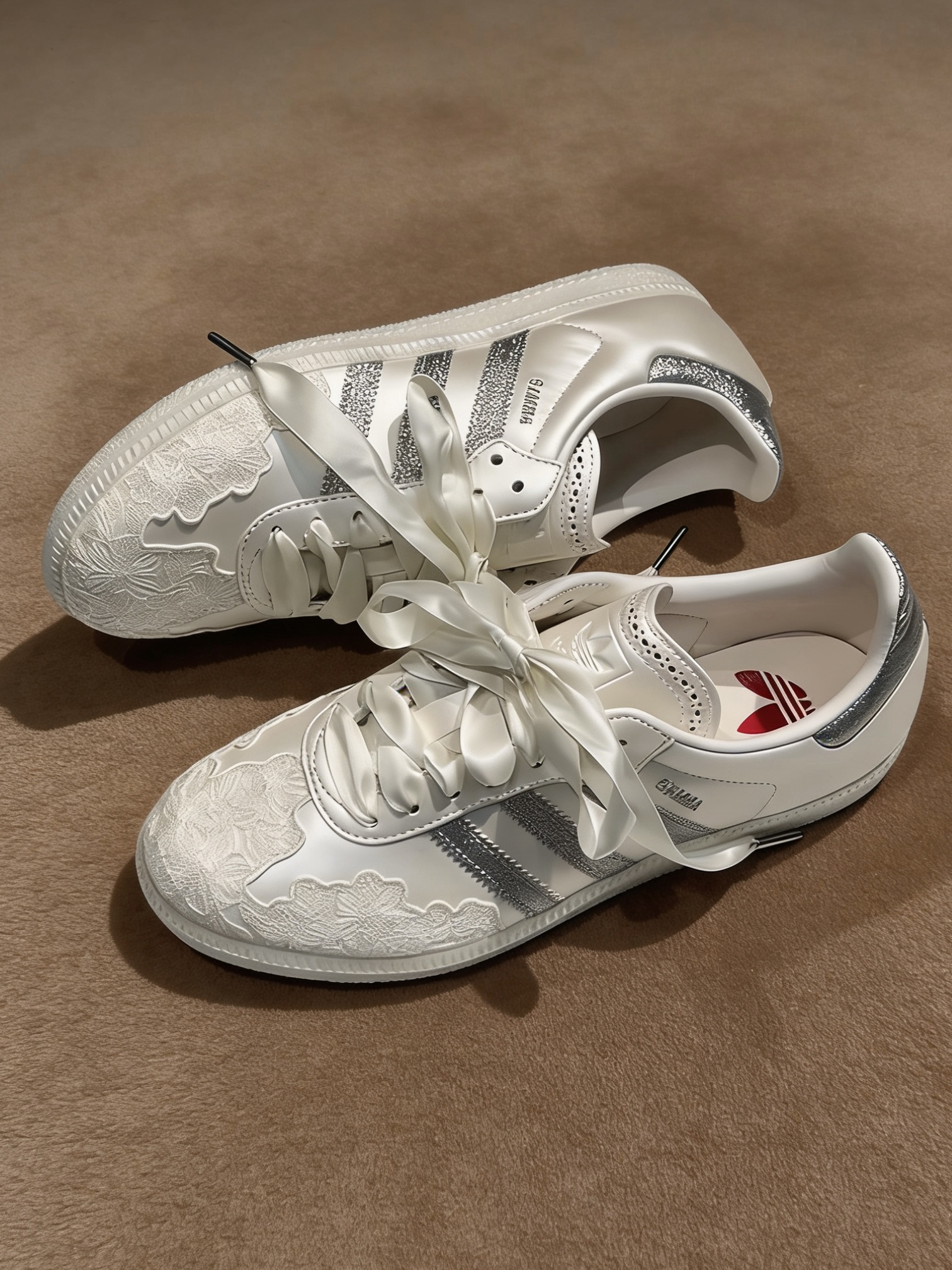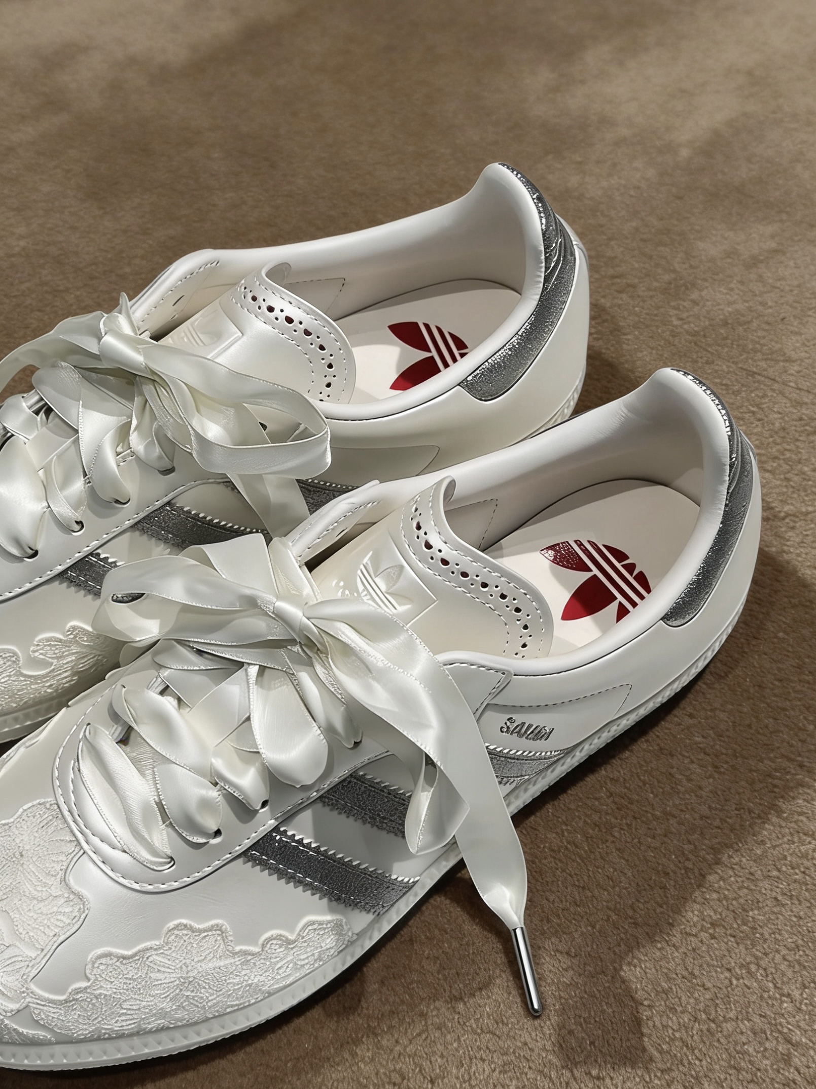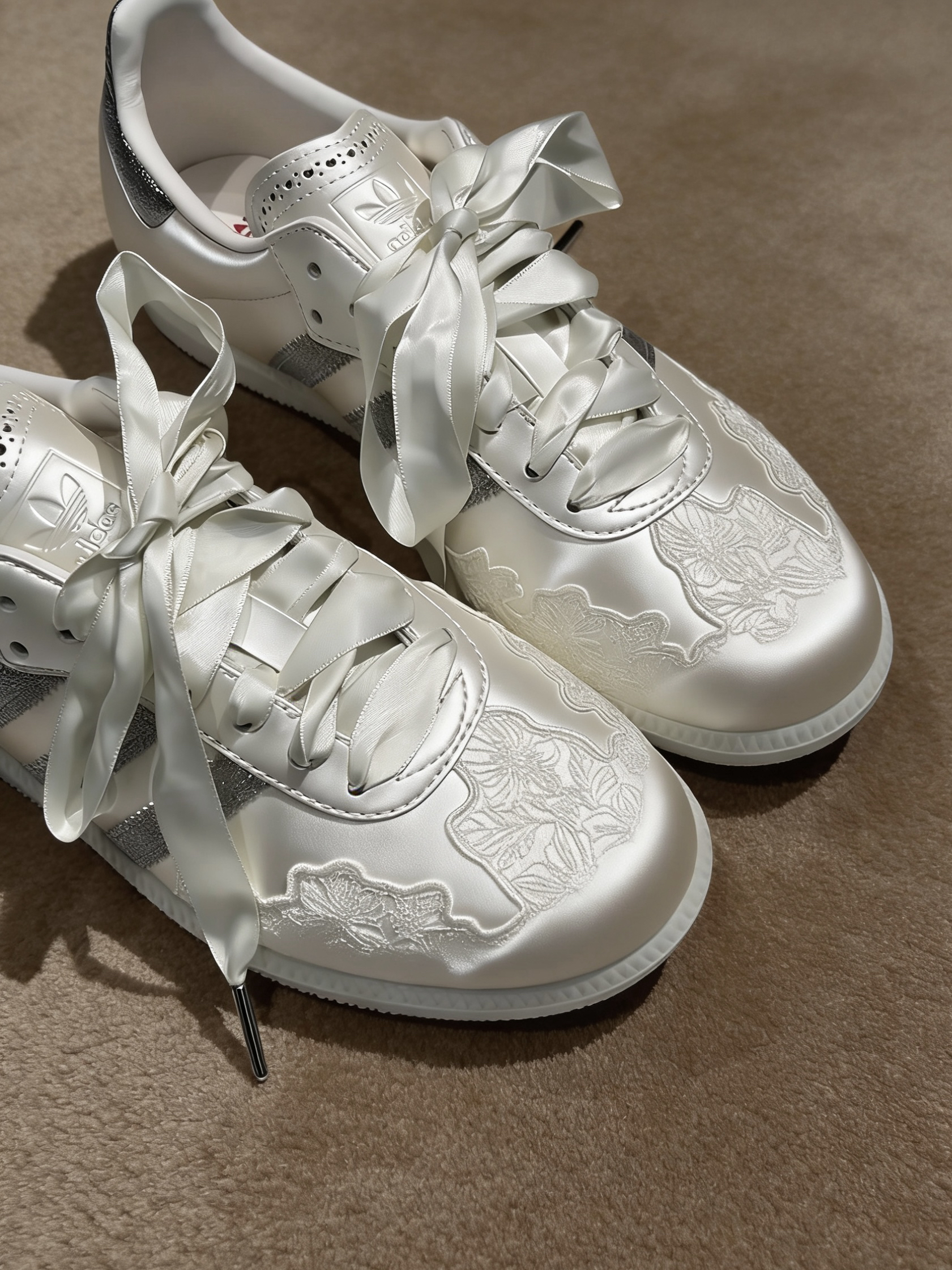 整双鞋用了细腻丝滑的缎面鞋身,摸起来质感拉满,完全没有廉价感,鞋头的立体蕾丝刺绣真的绝了,精致到每一针线,温柔感直接焊死。经典的三条杠和鞋尾做了闪银细闪设计,阳光下是低调不张扬的光泽感,不是土气的亮片,高级感拿捏得死死的。 最戳我的是它的绸缎丝带鞋带,搭配金属鞋带头,随手系个蝴蝶结都甜到心坎里,不想太甜也能换成普通鞋带,一鞋两穿直接解锁两种风格。鞋舌的精致打孔、鞋内里的红色三叶草小标,连小细节都...